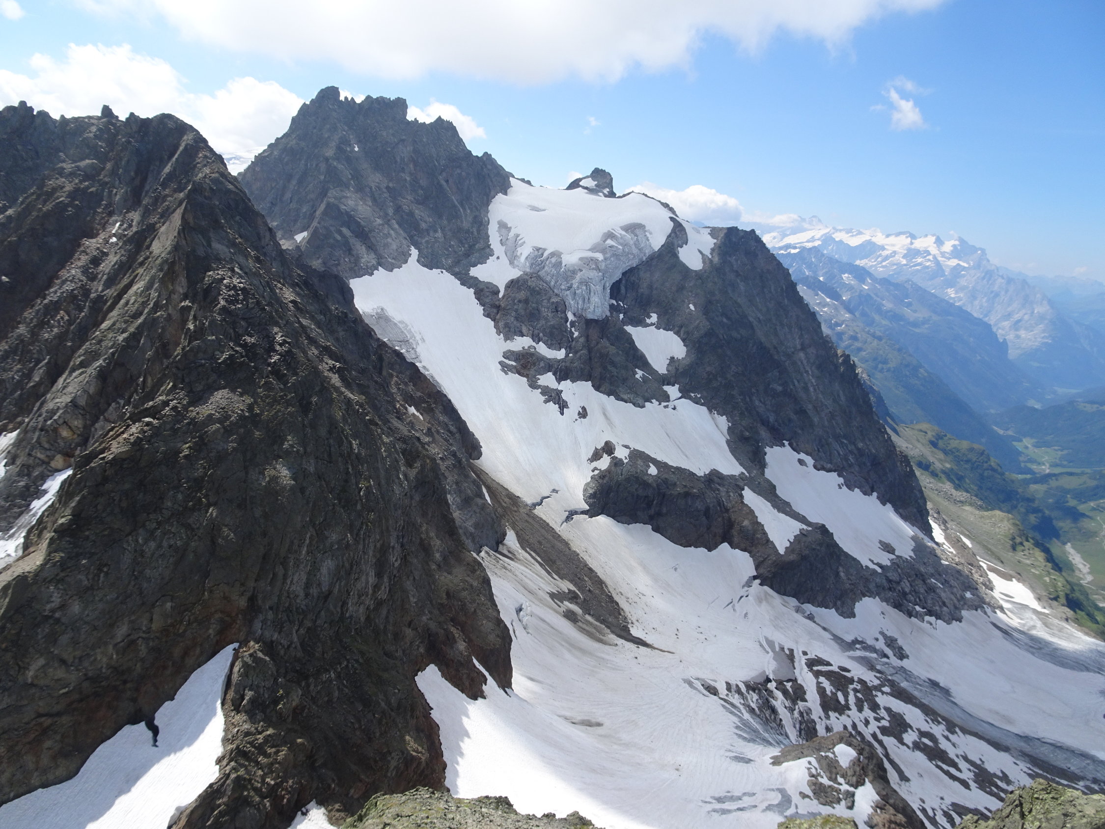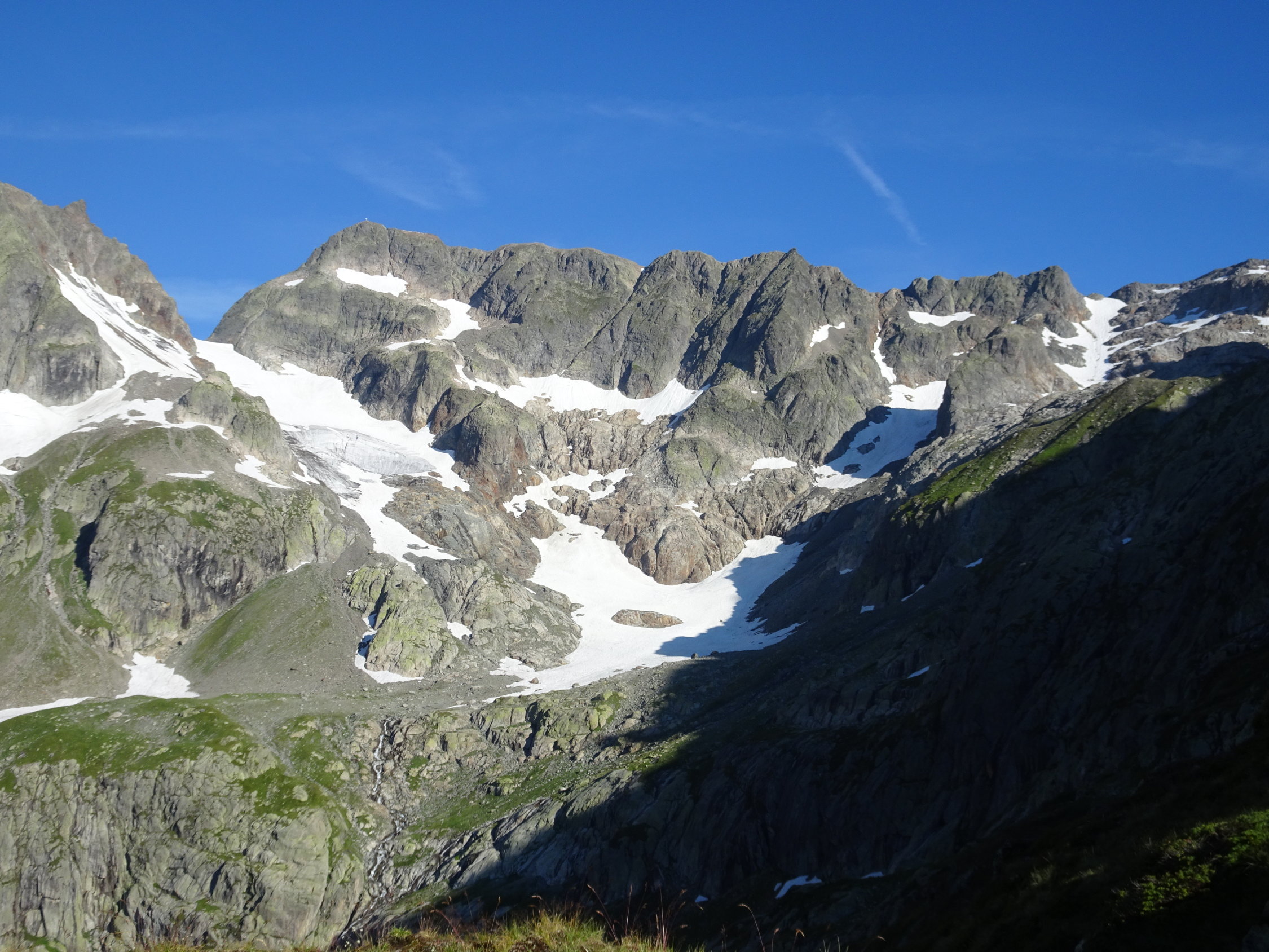 Aus den Nordwänden der Fünffingerstöcke (Wasenhorn) brach ständig Schutt aus. Eine grosse Schuttspur zeigte sich auch auf dem Wendengletscher.