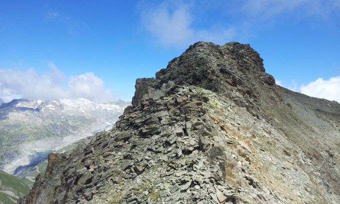 Dass der Grat "schuttig" sei, wussten wir. Doch vielmehr: Der Grat ist "am Rutschen". Dies vor allem dort, wo in den letzten Jahren auf der E-Seite Firnfelder verschwunden sind. Es kann nicht immer ausgewichen werden.