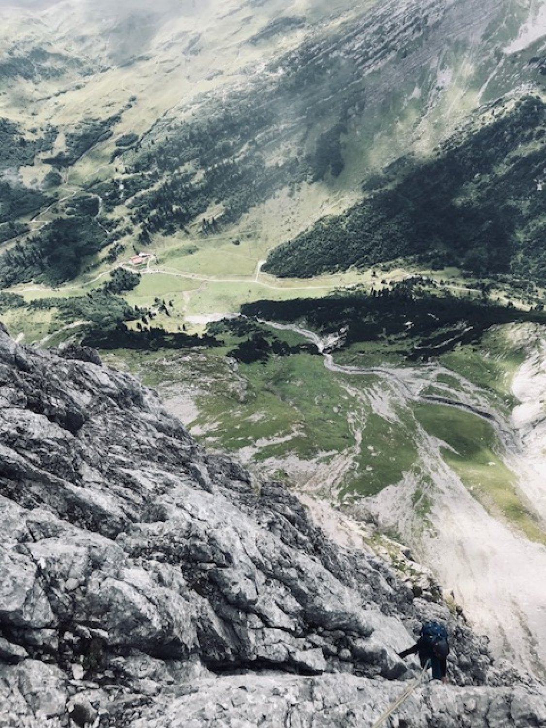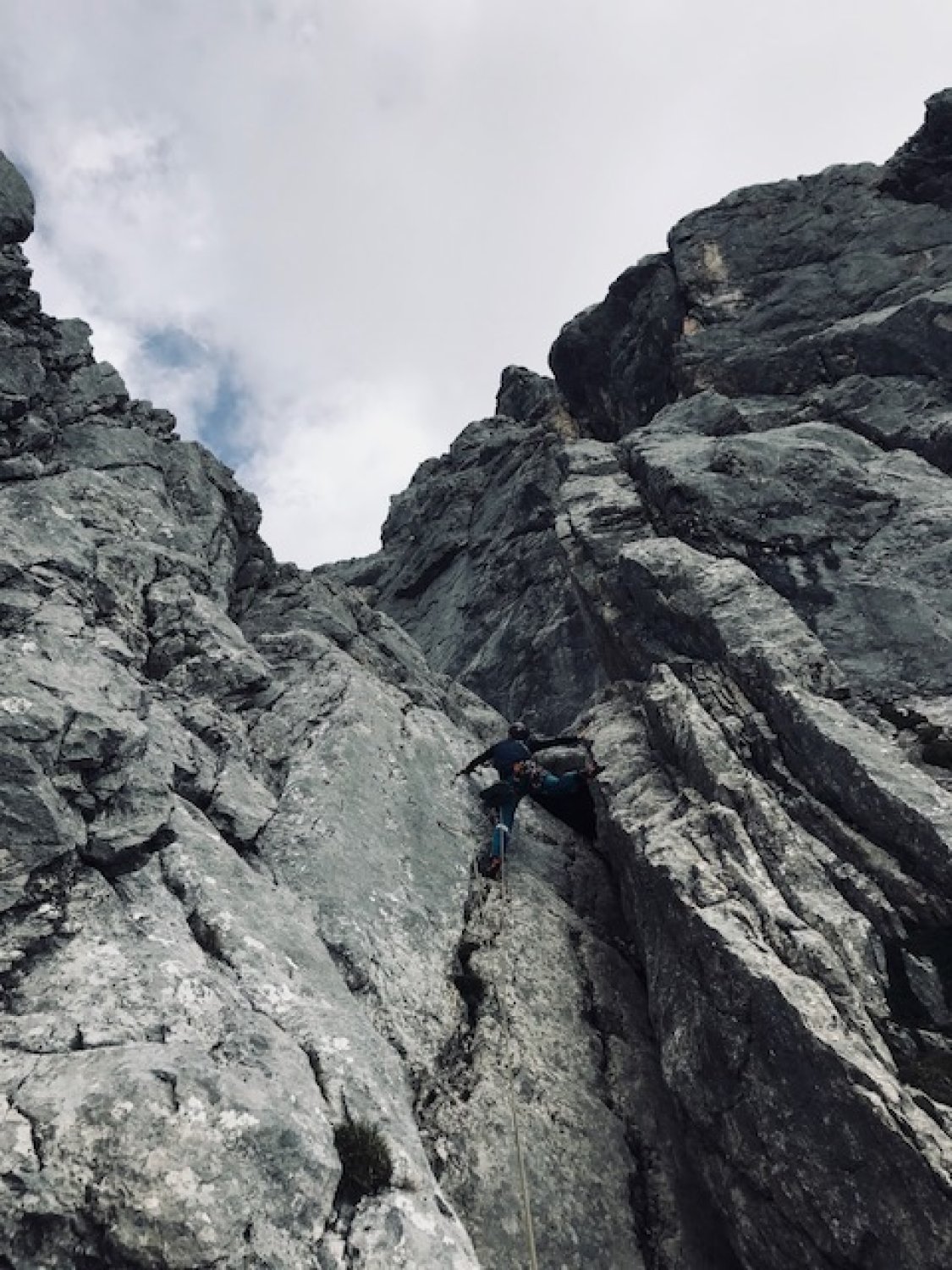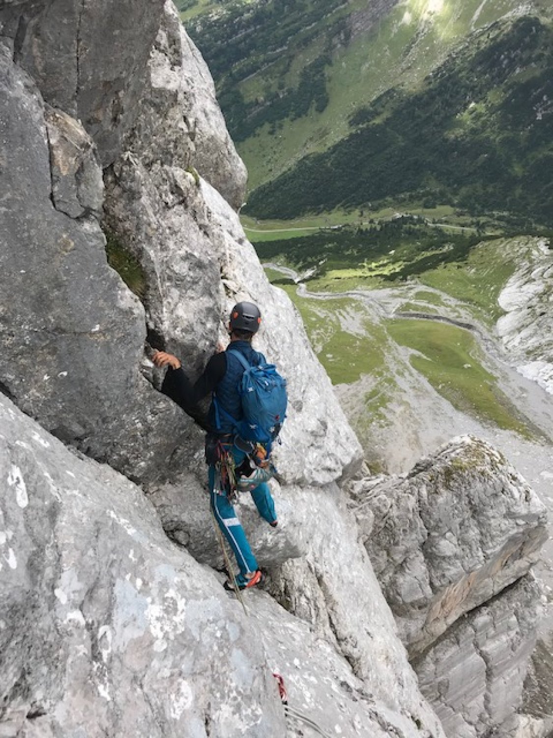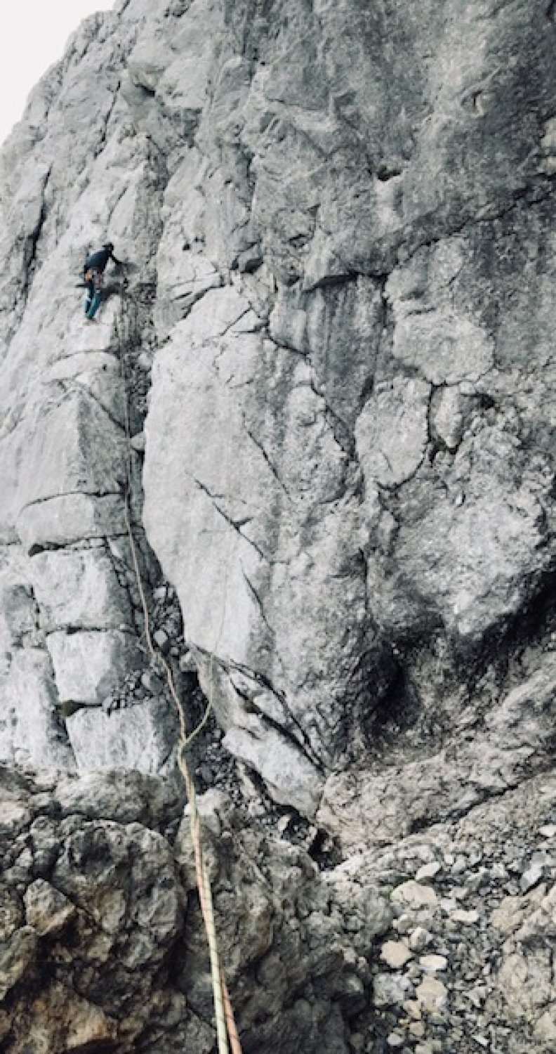 Es liegt einiges an losem Gestein in der Route. Wer aber gewohnt ist sich alpin im Kalk zu bewegen, kommt damit klar.