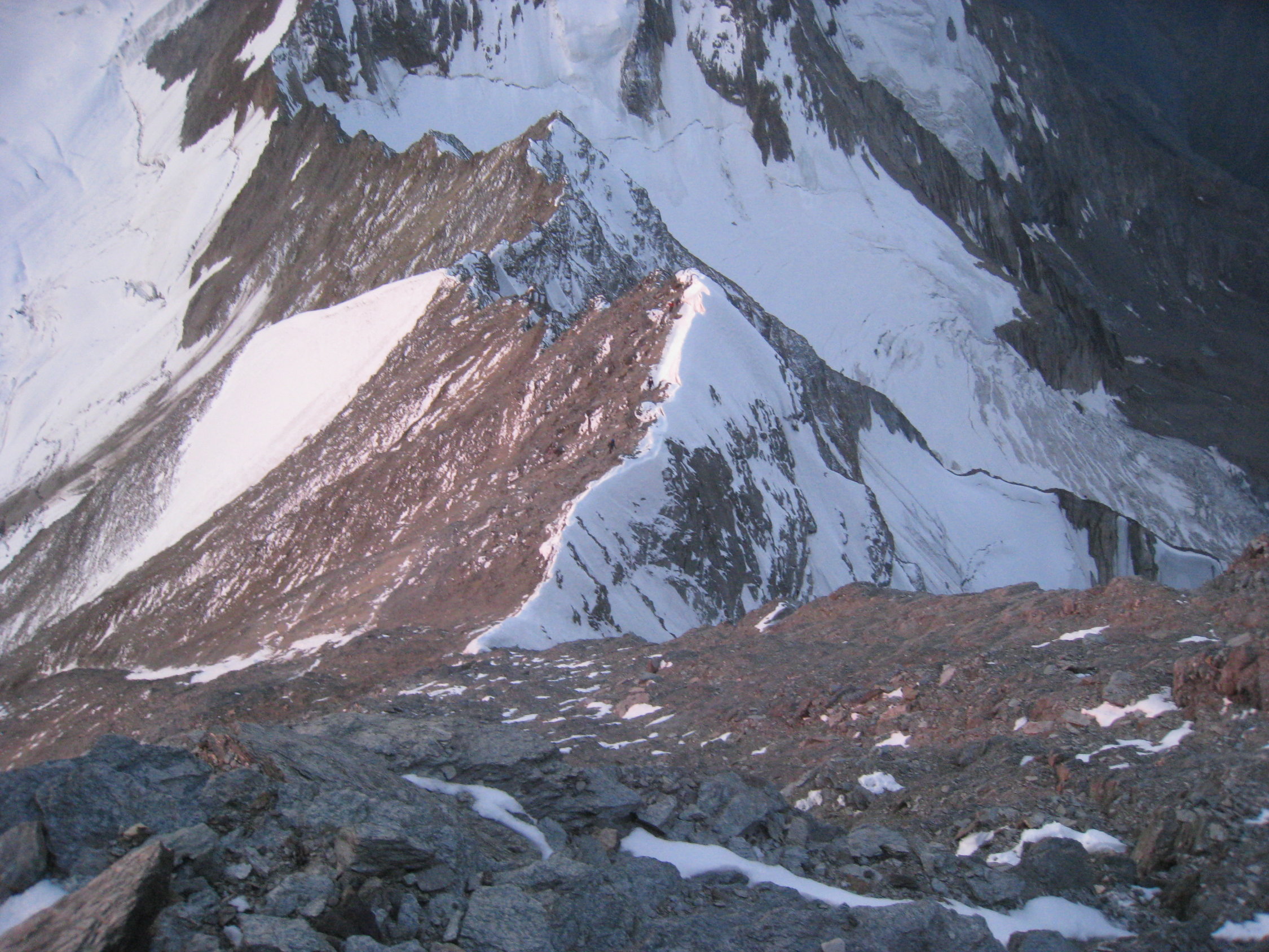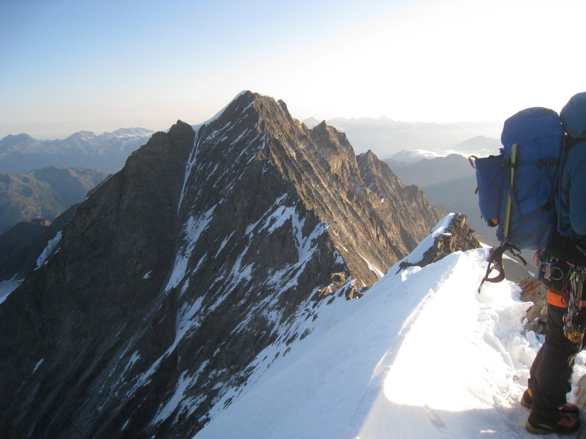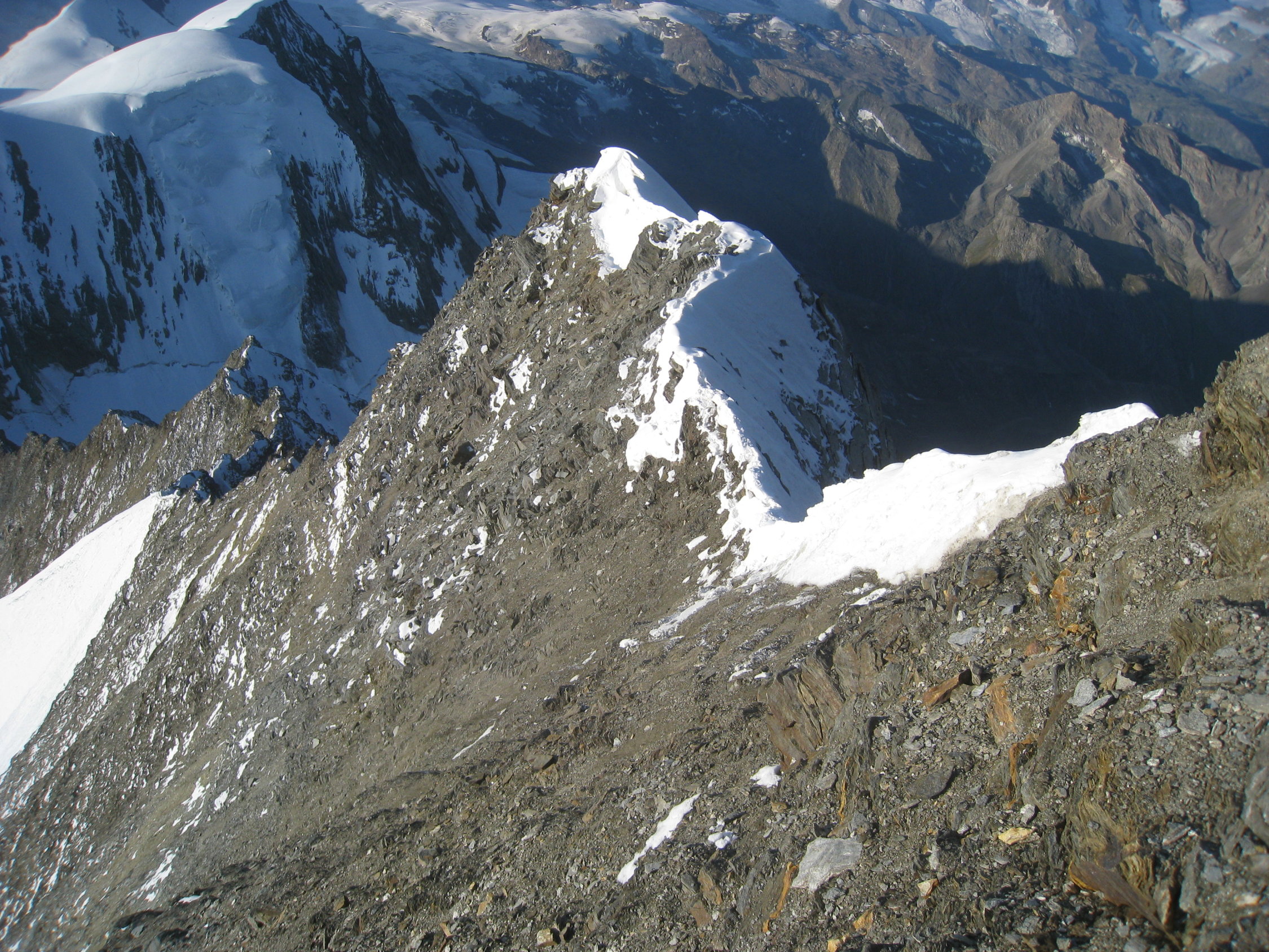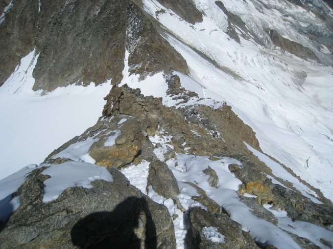 Vom Schnee am Mischabelgrat sind nur noch 2-3 Stellen übrig, die etwa 10-20 Meter lang sind. Steigeisen und Pickel hatten wir nicht im Einsatz, es liegt eine gute Spur. Mich hat einfach überrascht, wie brüchig der Fels am Berg ist, aber weil die Kletterstellen nicht schwer sind, geht es trotzdem gut. Ca. 3 Seilschaften machten die Überschreitung zum Dom. Wir gingen beim Abstieg wieder auf den Alphubel und weiter zur Längfluh - dort liegt eine gute und viel begangene Spur.