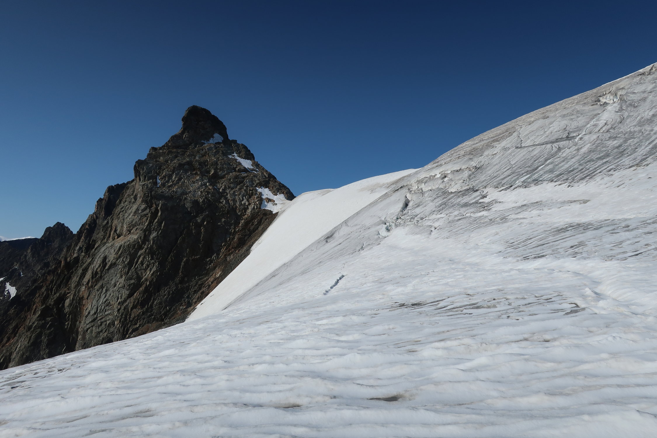 Wird im Aufstieg am Gletscher immer schlechter. Unter dem Westgrat des Gwächtenhorn muss man jetzt schon etwas "suchen"
