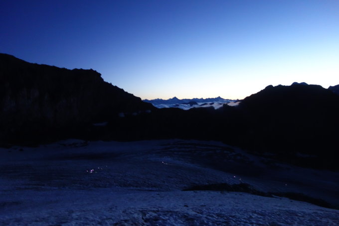 Start um 4:00 von der Britaniahütte. Wie waren die erste Gruppe in Richtung Hohlaubgrat.So früh sind nur Seilschaften für Strahlhorn los. 30 min. Später folgten zahlreiche Seilschaften. Wir waren um ca.07:45 am Gipfel als erste. Sonnenaufgang im ca.6:00. Bis zum Grataufschwung war der Gletscher aper, wenig Spalten auf der Route. Am Grat ca. 5cm - 10cm Neuschneeauflage in der Spur, kein Eis weit und breit. Es hat auf dem Grat 1-2 gut sichtbare Längsspalten. Im kurzen Felzabschnitt fast komplett Schneefrei, gute Sicherungsmöglichkeiten.ca.3 Expressen nötig. Im Abstieg um ca.8:30 kamen uns erste Seilschaften von der Mittelallalinstation entgegen. Wir sind dann über Feekopf (war Schneefrei) und Alphubel ca. 11:30 weiter zum Mischabelbiwak ca.13:30.Eine einfache aber sehr schöne Genusstour. Bei ciel bleu einfach se tre delicious :-)