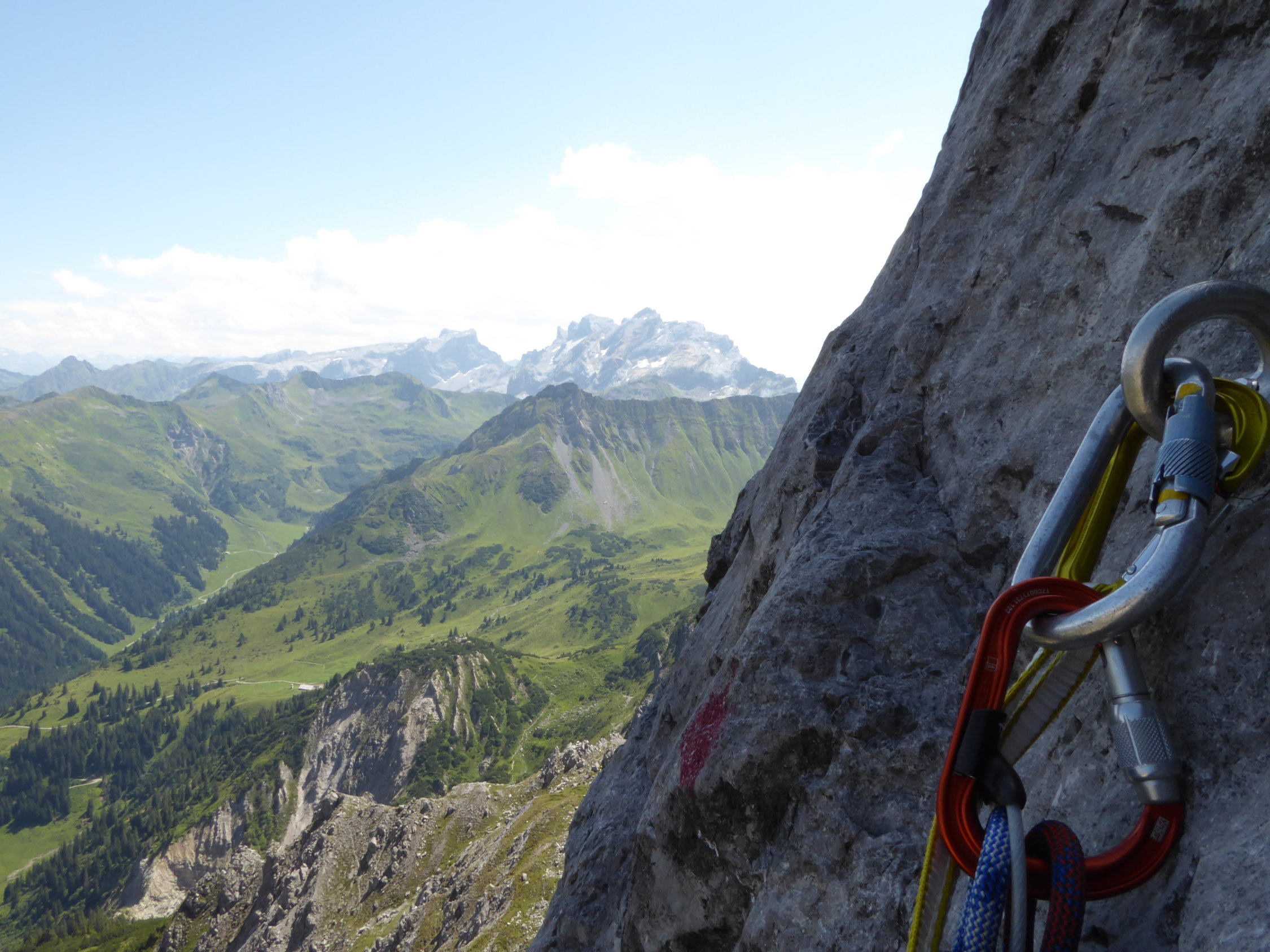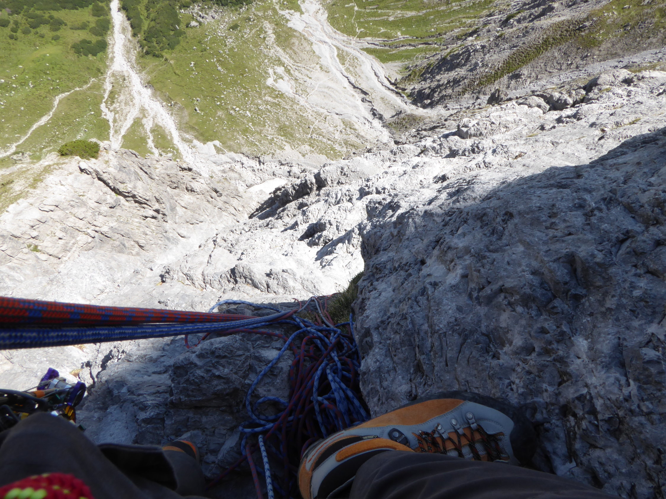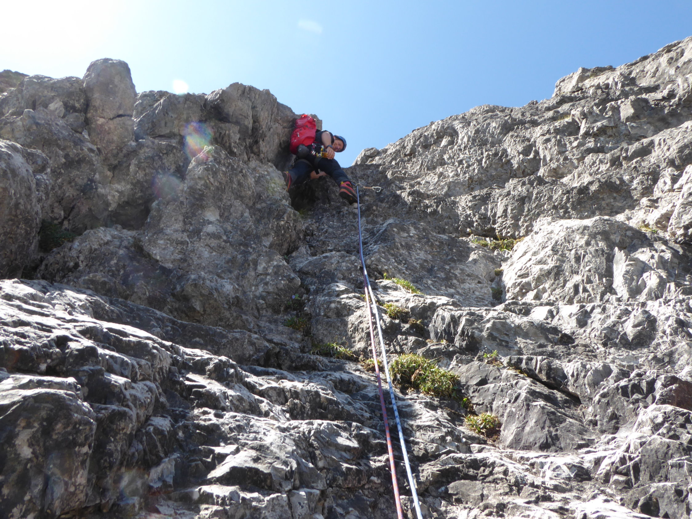 im Zustieg über den bösen Tritt , Douglashütte und Saulajoch noch einzelen Regentropfen und etwas bewölkt. In der Wand dann, auch durch den Wind alles sommerlich trocken.