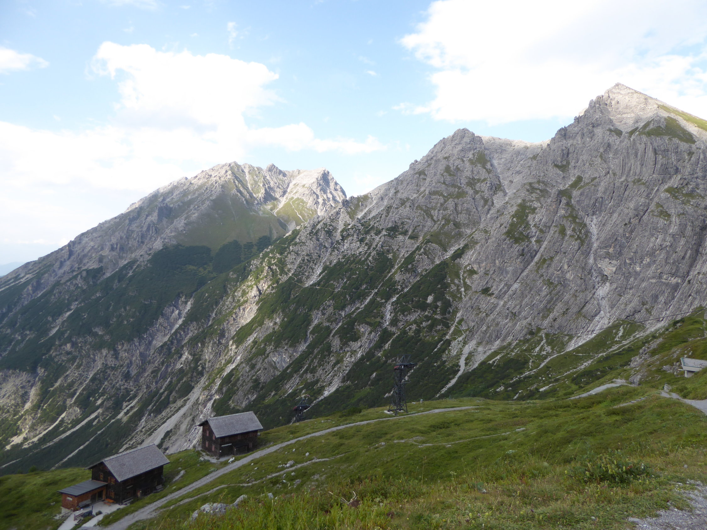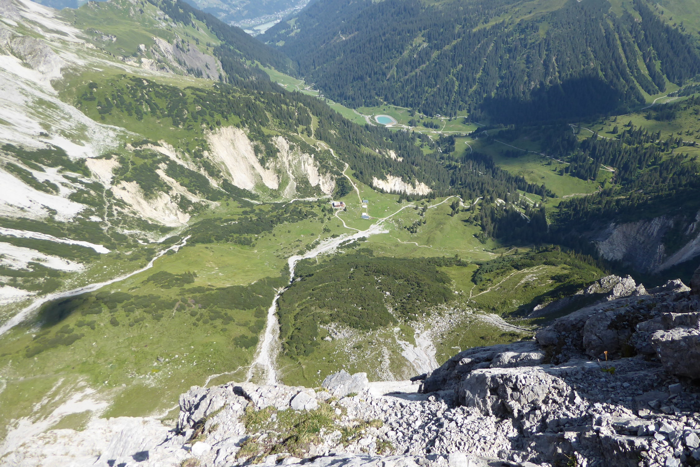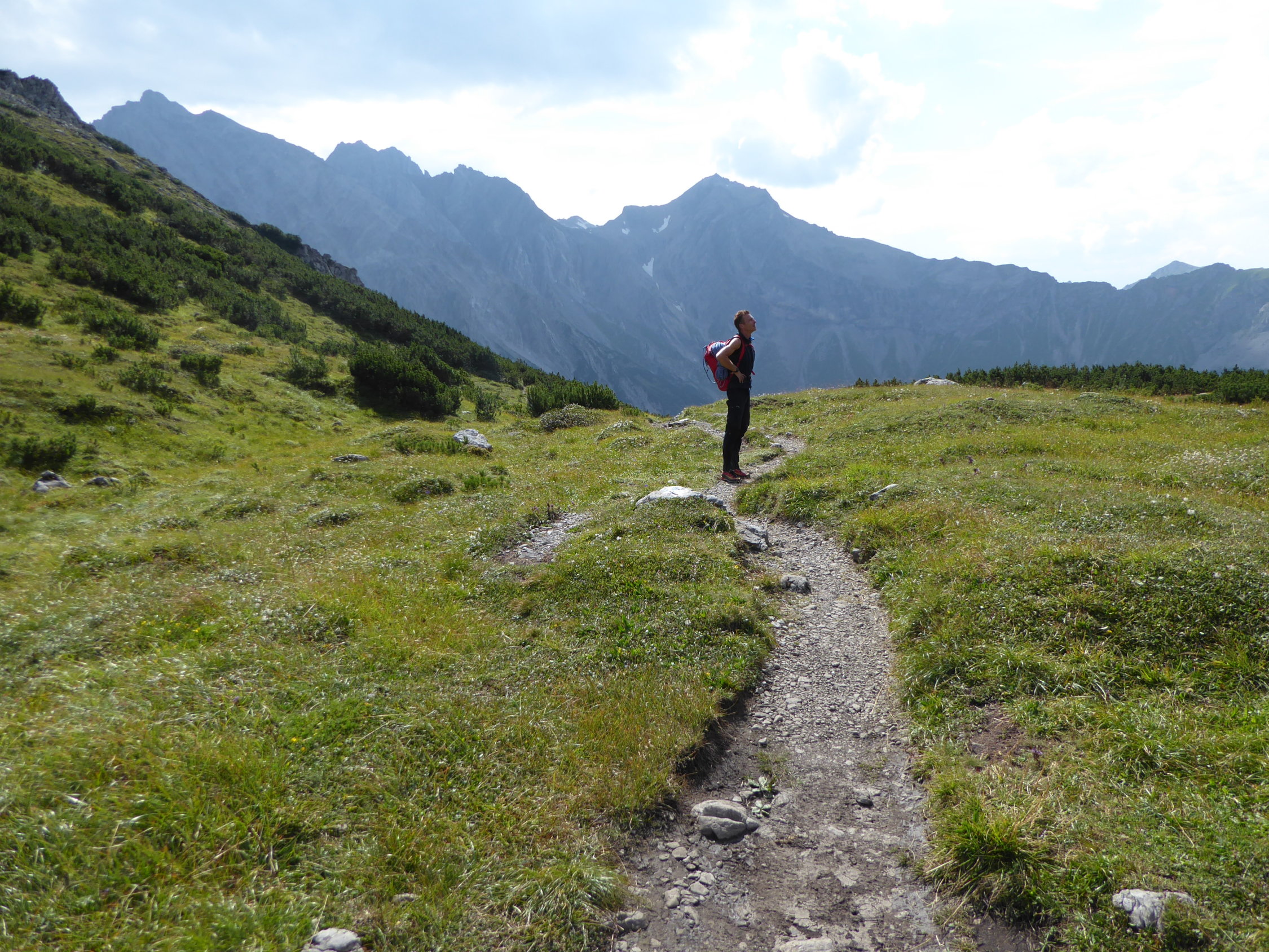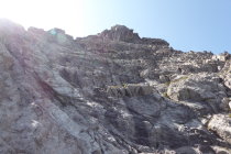 im Zustieg über den bösen Tritt , Douglashütte und Saulajoch noch einzelen Regentropfen und etwas bewölkt. In der Wand dann, auch durch den Wind alles sommerlich trocken.