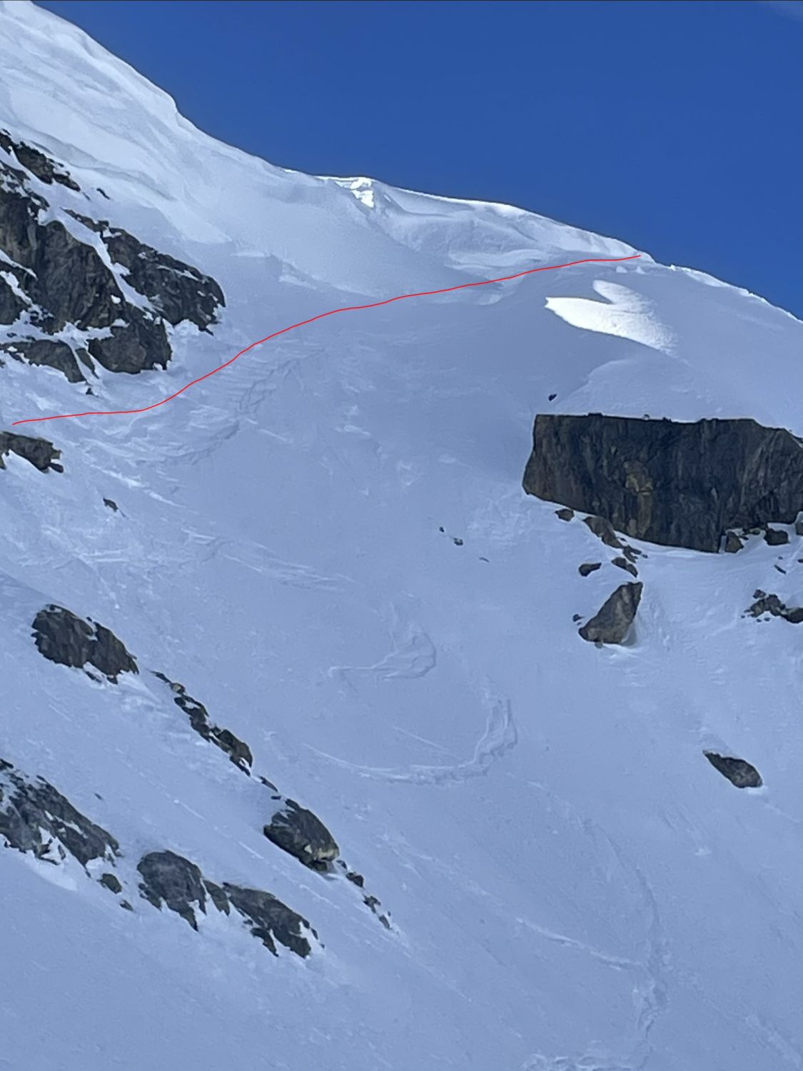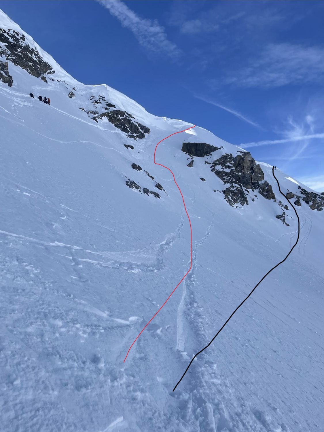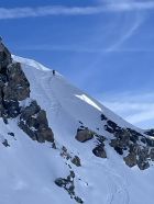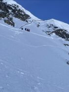 Die Verhältnisse sind gut bis sehr gut, ausgenommen die Früestücksplatz Traverse. Wir sind an dieser Stelle zum Teil abgerutscht und abgefahren. Andere wählten einen tieferen Einstieg um die Wächte zu umgehen und sind teilweise abgestiegen. Beim Aufstieg sind etliche sehr hoch eingestiegen, und haben die Wächte, über dem Felsriegel durchbrochen. (siehe Bilder) Die Herausforderung der Tour liegt eindeutig an dieser Stelle. Das Gebiet ist sonst sehr gut eingeschneit.