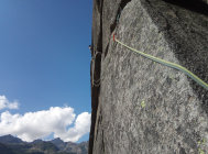 2.Sl: 6a+ , zunächst fünfer Camalot, dann sechser im Querriss und im senkrechten Riss den Fünfer.Nachsteiger sollte das zwingend können!