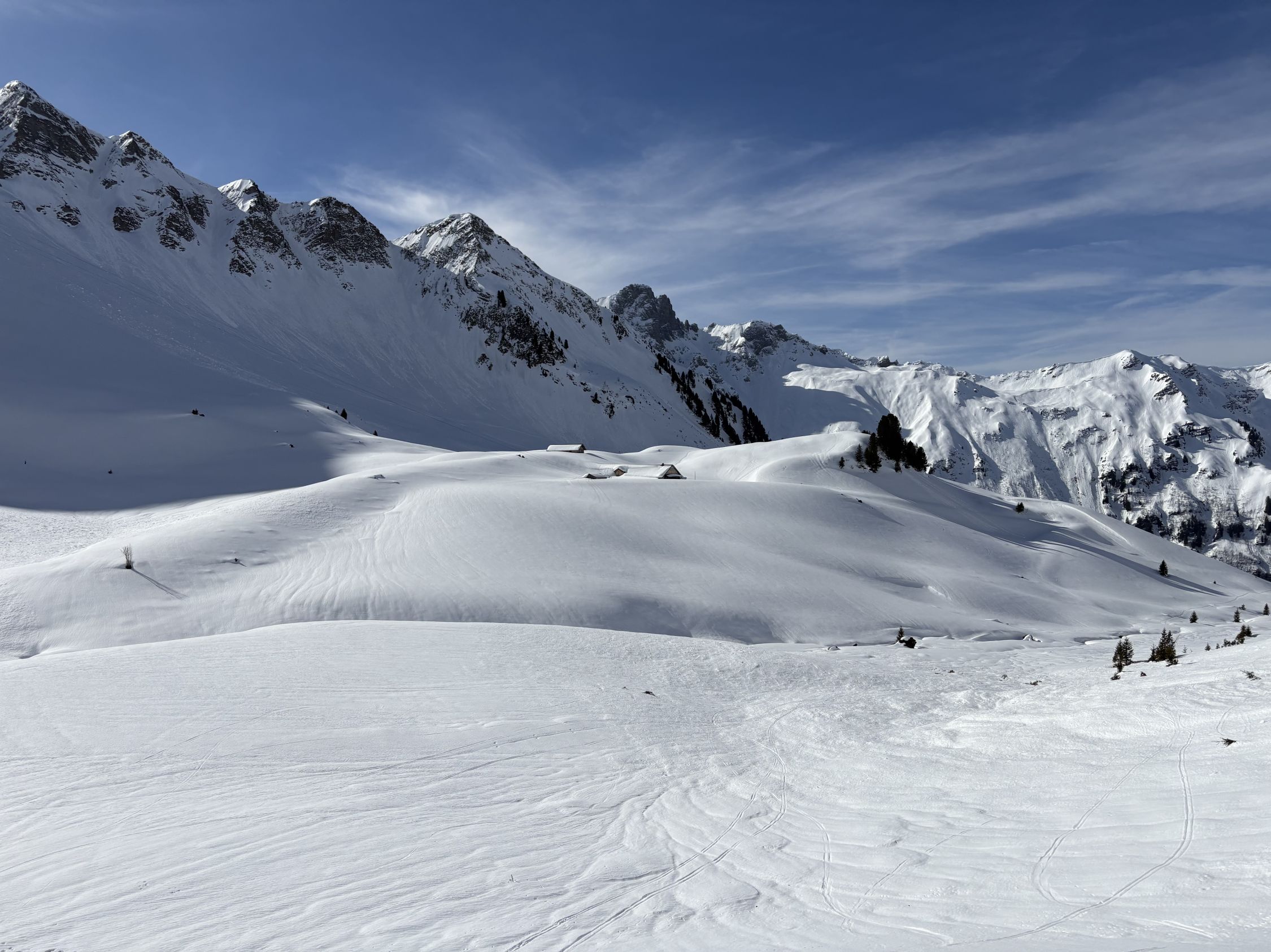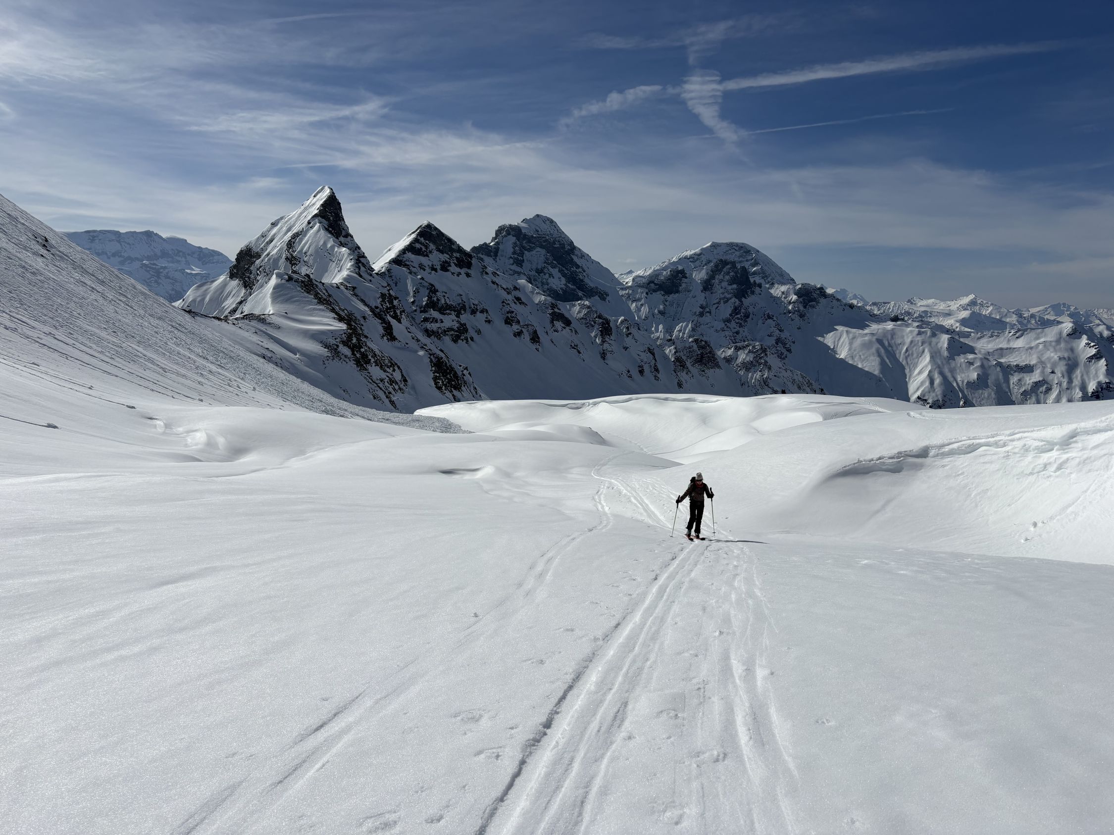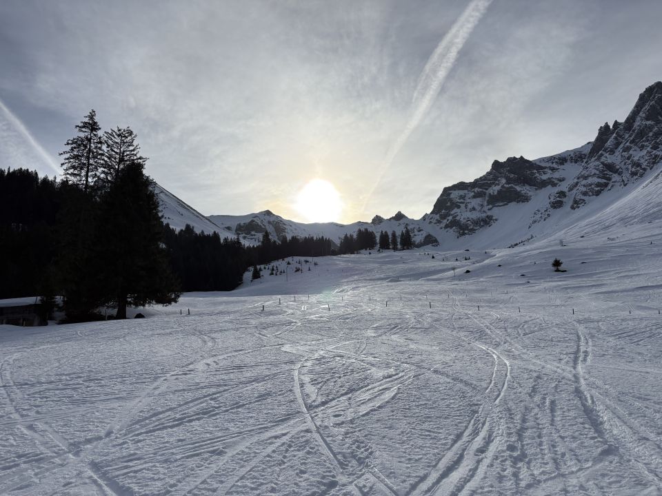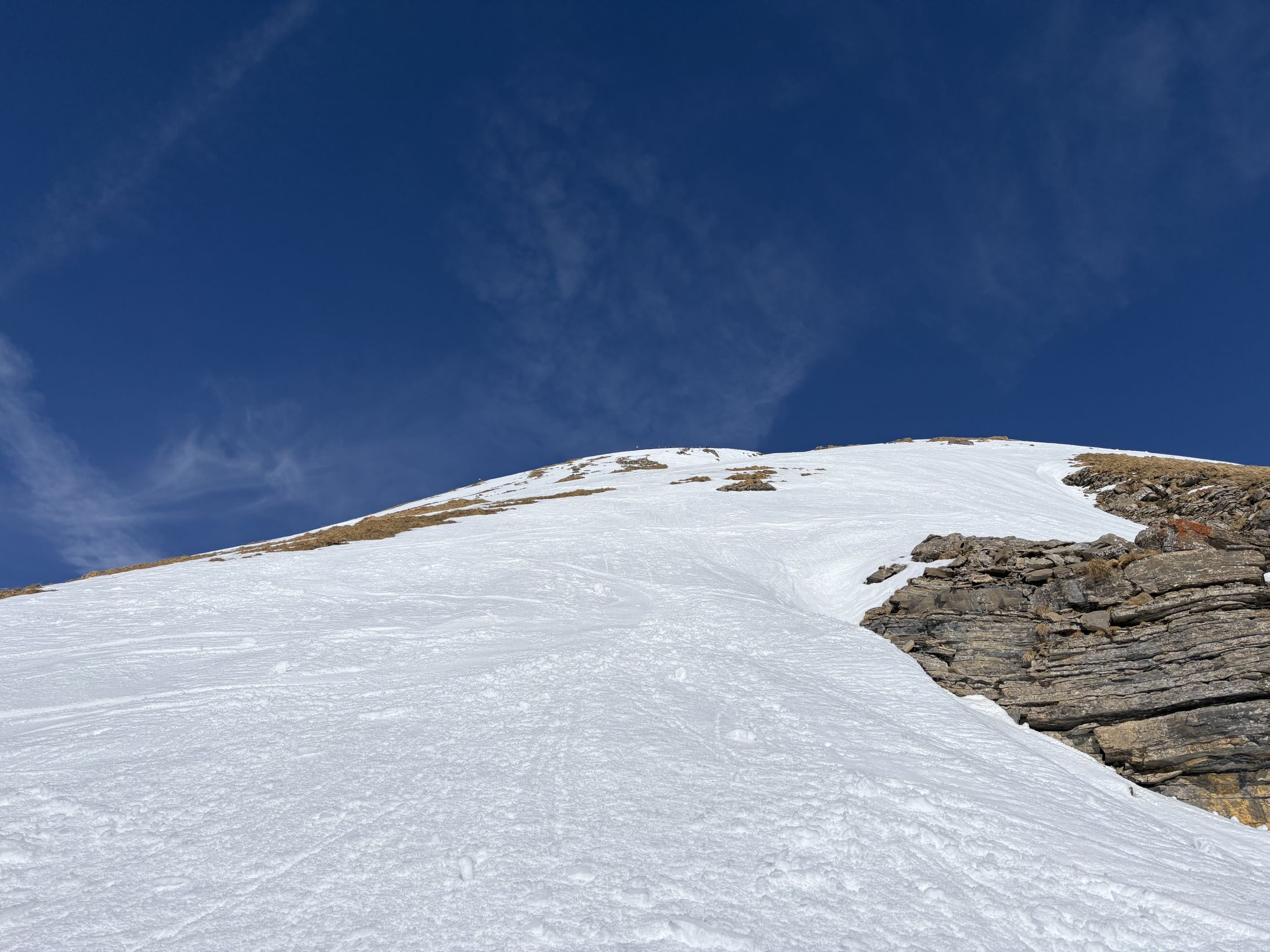 Wetter besser als vorhergesagt, nur wenige Wolkenschleier vor der Sonne. Start um 9:15 im Fildrich. Schnee ab Fildrich, in der Früh noch hart. Wir sind ausnahmsweise nicht durch den Wald sondern aussen rum über den Forstweg zum Mittelberg. Dort dann Schnee schon leicht sulzig. Vom Oberberg ins Obertal den direkten Weg, wie üblich, rechts rum läge relativ viel Lawinenschnee. Gipfelhang dank Sulz ohne Harscheisen gut zu gehen. Es hat oben allerdings nicht allzu viel Schnee, die direkte Variante links rum ist momentan nicht durchgängig.