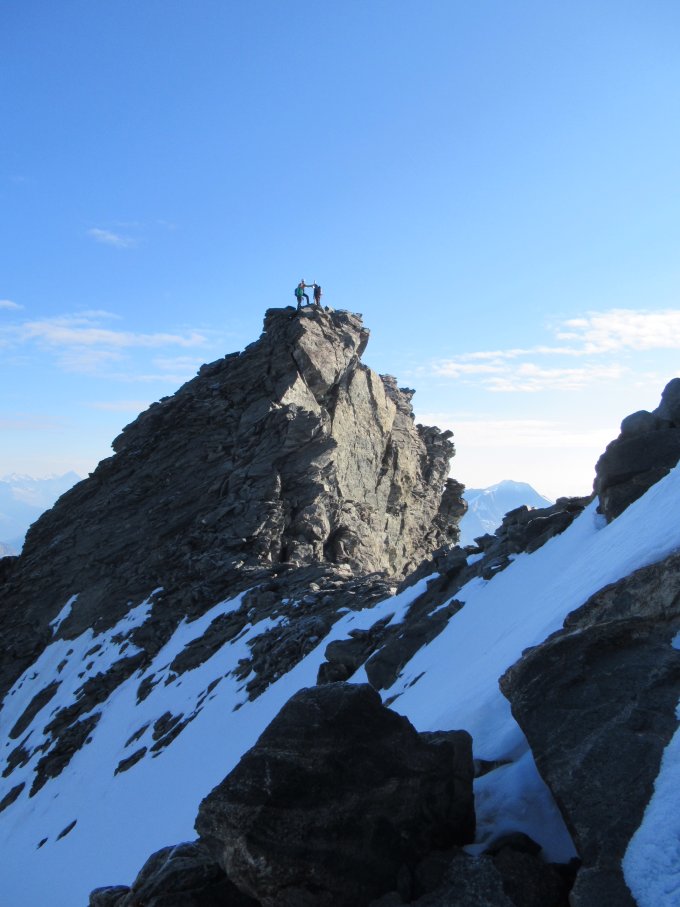 Couloir war dann ab der Mitte doch etwas eisiger, sodass wir beim Auf- und Abstieg Schrauben gesetzt haben. Danach konnten wir ohne Steigeisen bis auf den Gipfel.