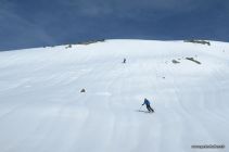 Abfahrt: 11 Uhr Start in die Abfahrt. Da die Temperaturen heute etwas tiefer waren als gestern und die Sonne nicht so intensiv, taute der Schnee kaum auf. Tolle Abfahrt auf griffigem, gut tragenden Schnee, Erst weit unten in den steilen Sonnenhängen gab es wenig Sulz.