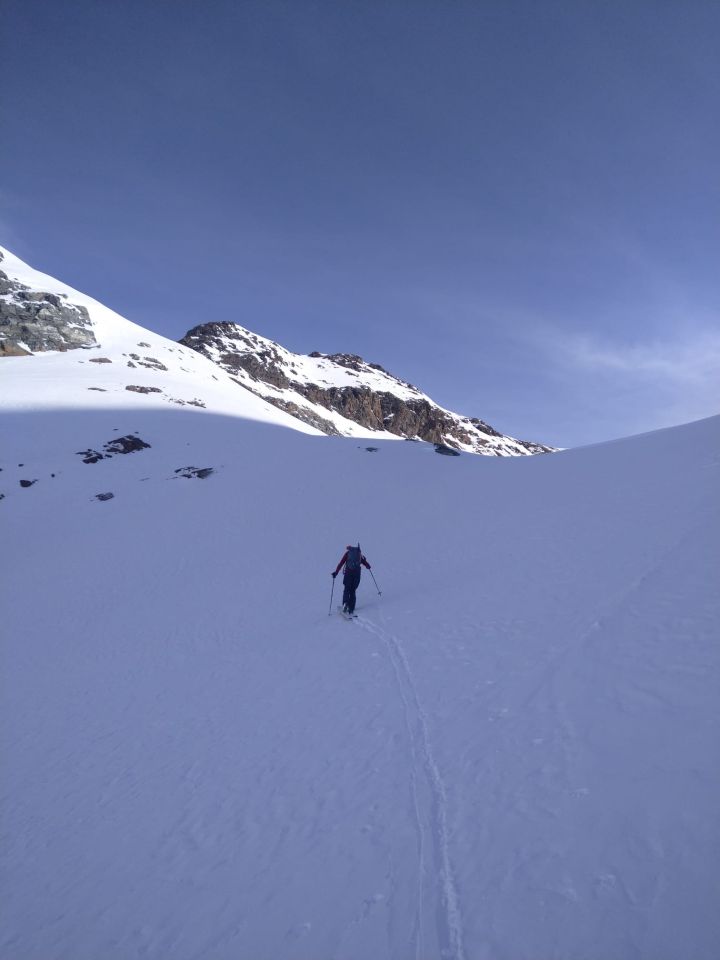 Letzte Querung Ausstieg Steilhang 4-5 Meter Ski tragen dann mit Ski bis auf den Gipfel.