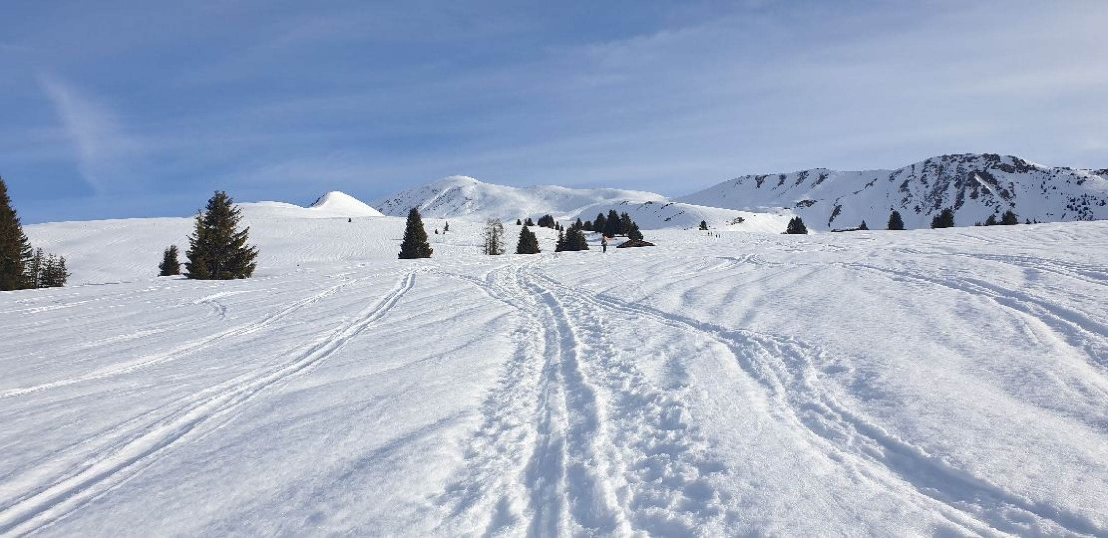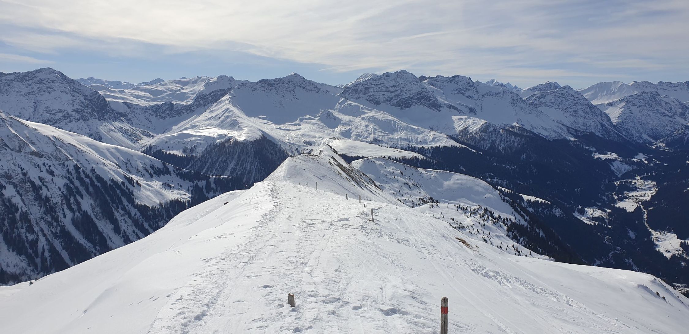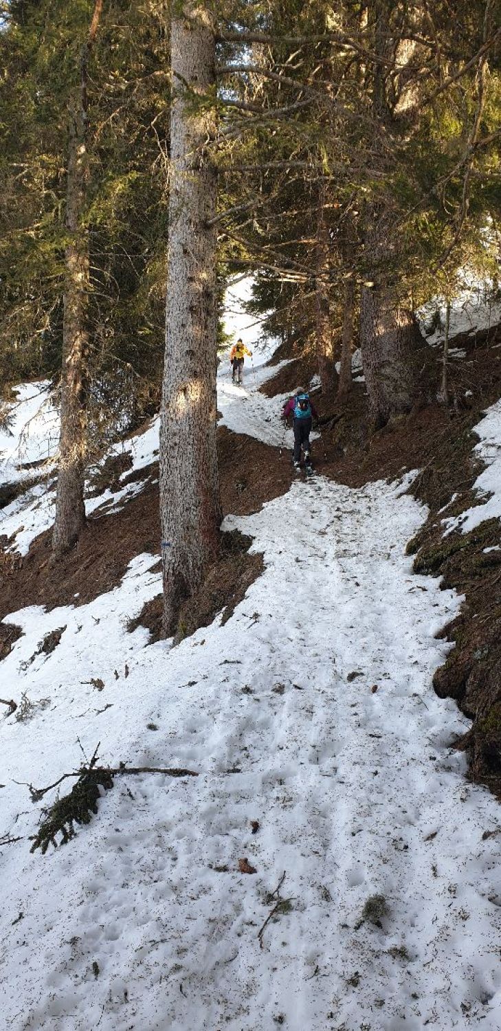 Start um etwa 8 Uhr ab Parkplatz P. 1490. Aufstieg über Sommerweg bis zum Gipfel war heute komplett auf Ski möglich. Einige kurze apere Stellen im Wald, waren dank trockenem Boden gut mit den Fellen zu überbrücken. Schnee war im Aufstieg hart, aber nicht eisig und gut tragend.