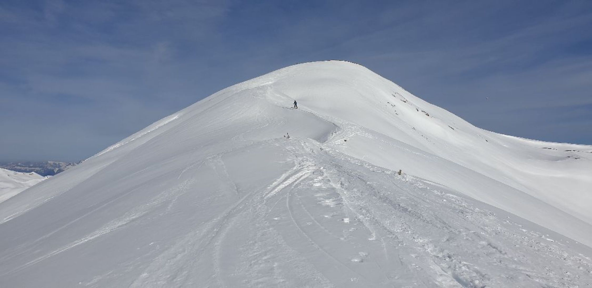 Abfahrt ab Gipfel um etwa 10.30 h war oben etwas hart. Dafür war der Schnee bis Pirigen gut tragbar und ermöglichte im unteren Teil genussvolle Firnschwünge. Hangexpositionen die mehr Sonneneinstrahlung erhalten und über Nacht gefrieren, waren deutlich tragfähiger. Ab Pirigen Abfahrt auf der Fahrstrasse, die durchgängig befahrbar ist, zurück zum Parkplatz. Die Wiese bei Dürrmatta lockt für einige schöne Schwünge, aber das Waldstück ob Schluocht (bei P.1667) hat sehr wenig Schnee.