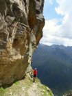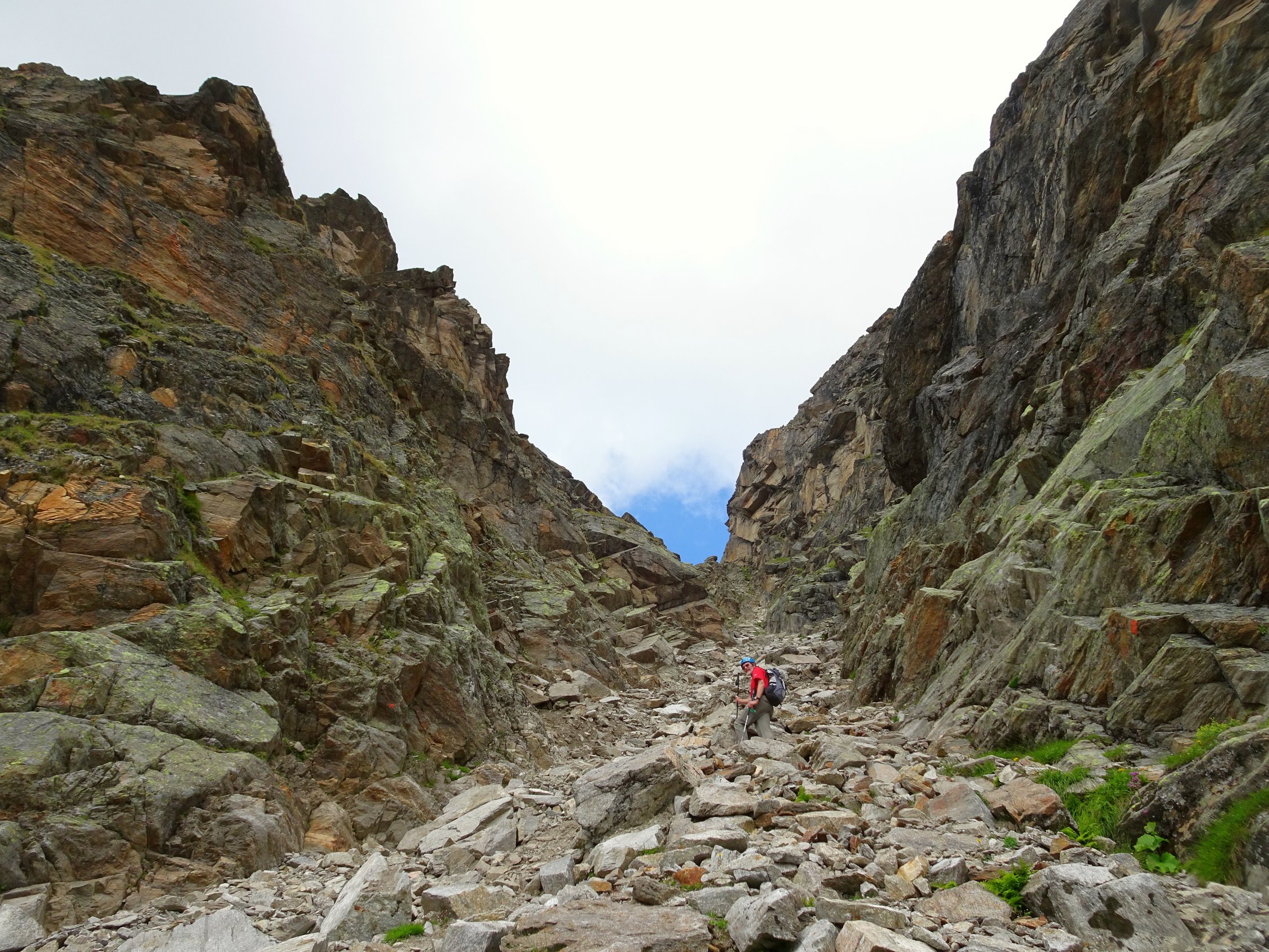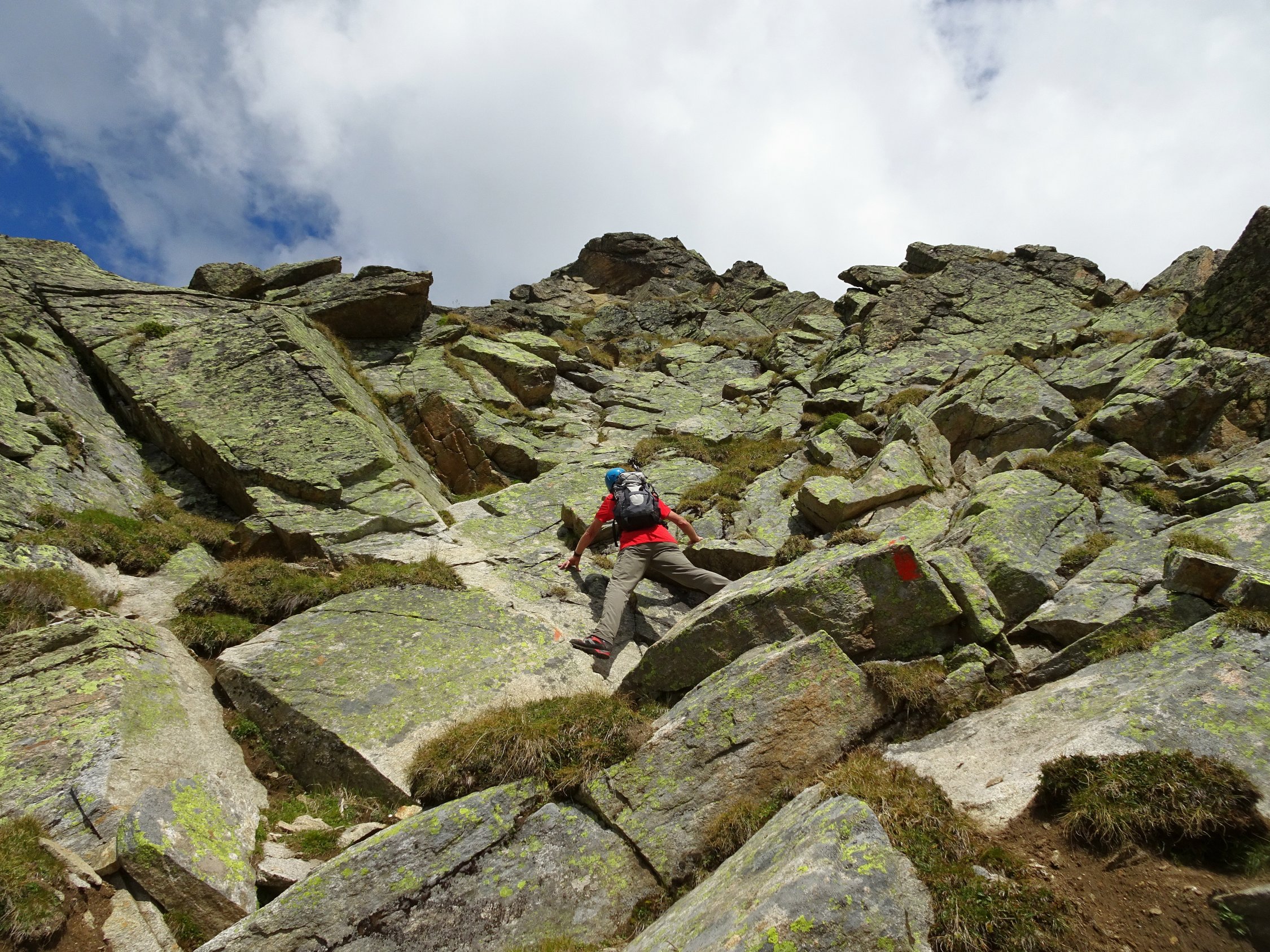Bei der Zustiegsvariante über die Seen bis in die Scharte zwischen Großer und Kleiner Vallüla markierte u. bez. Wege; im Schrofengelände am Gipfelaufstieg auch noch Markierungen, jedoch spärlicher u. etwas Orientierungssinn erforderlich. Ebenso Trittsicherheit und Schwindelfreiheit. An heiklen Stellen sind vereinzelt Haken angebracht. Helm empfehlenswert, v. a. für die bröselige Rinne.