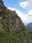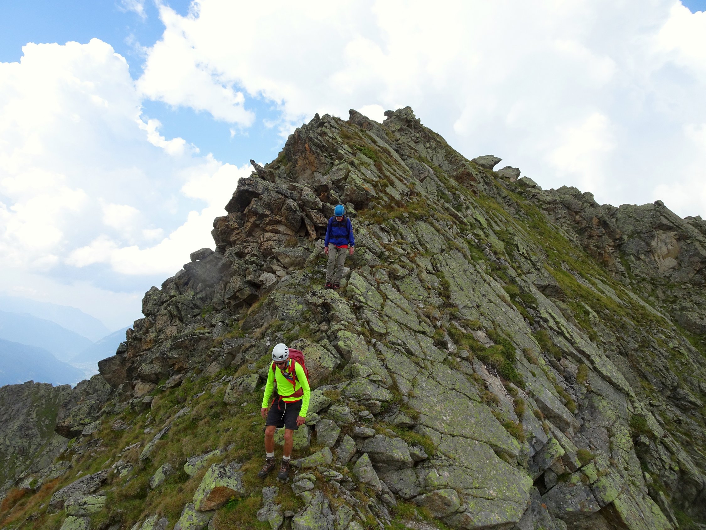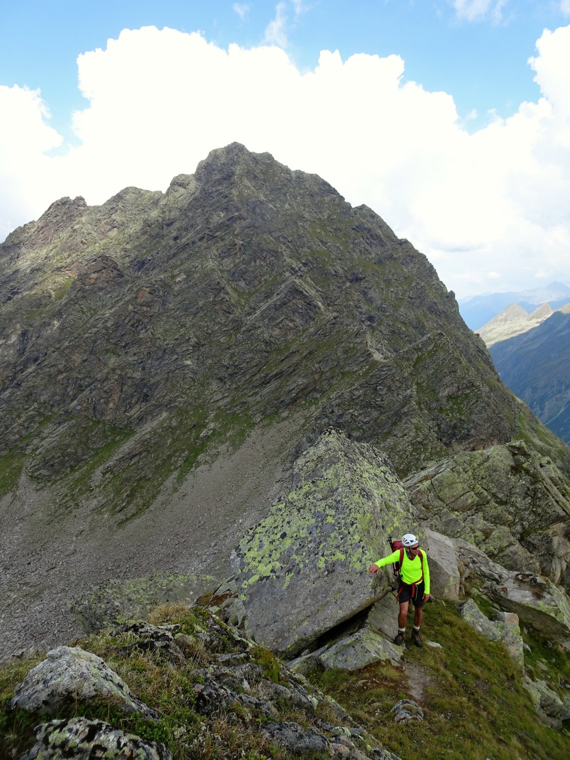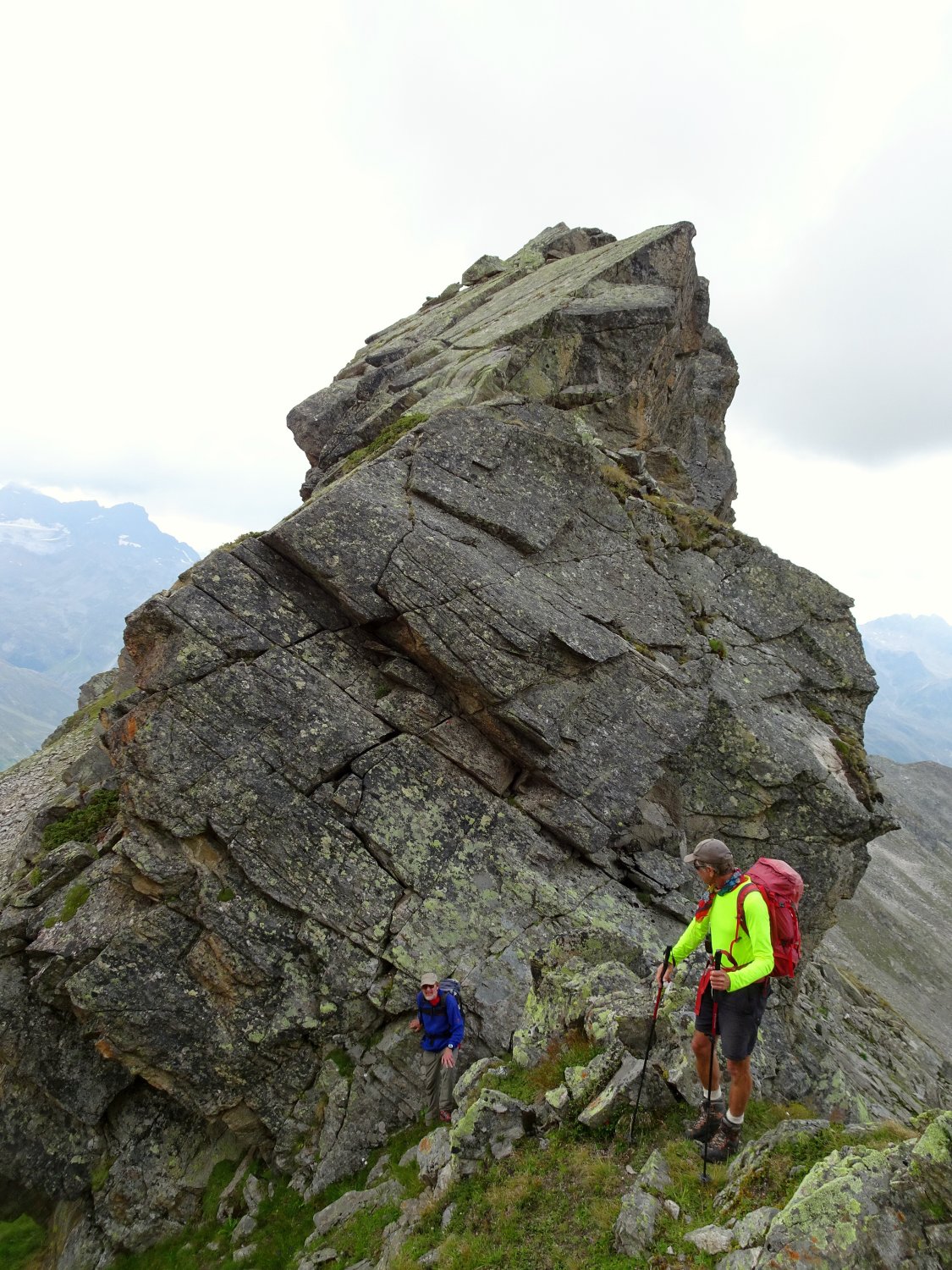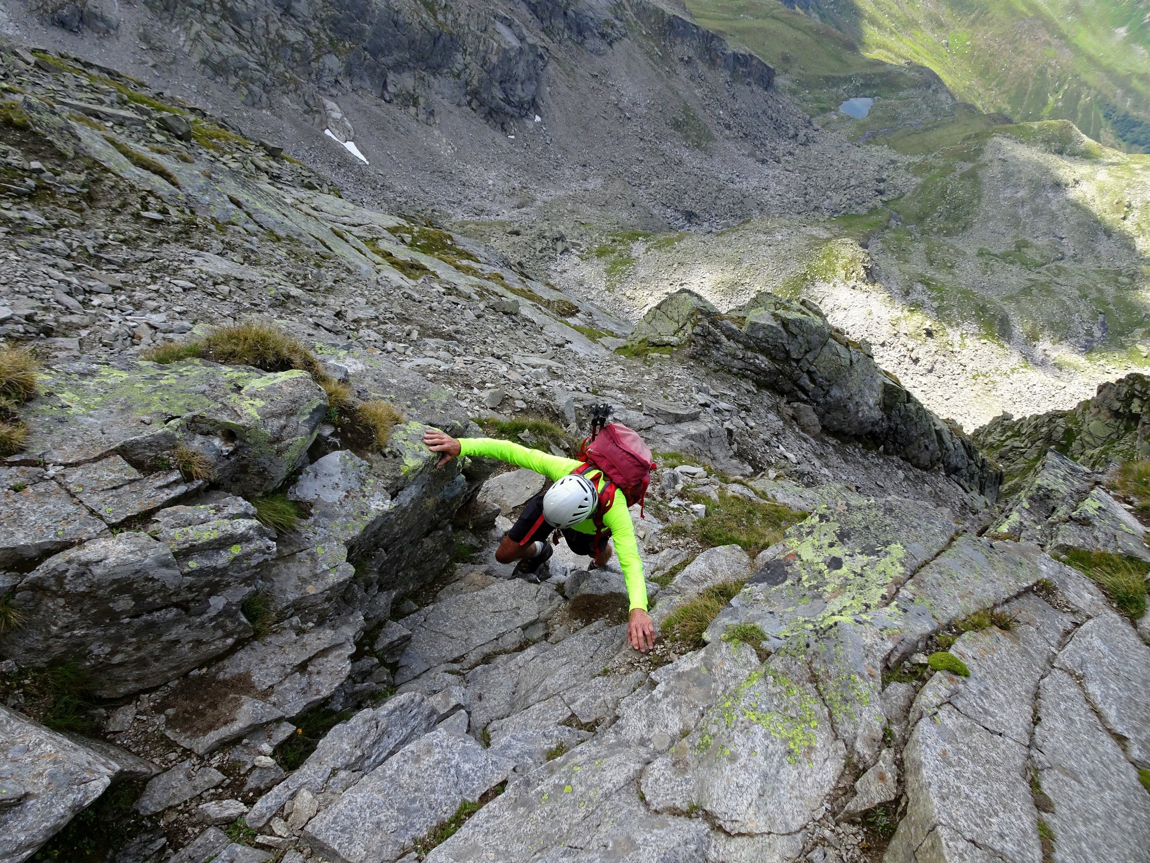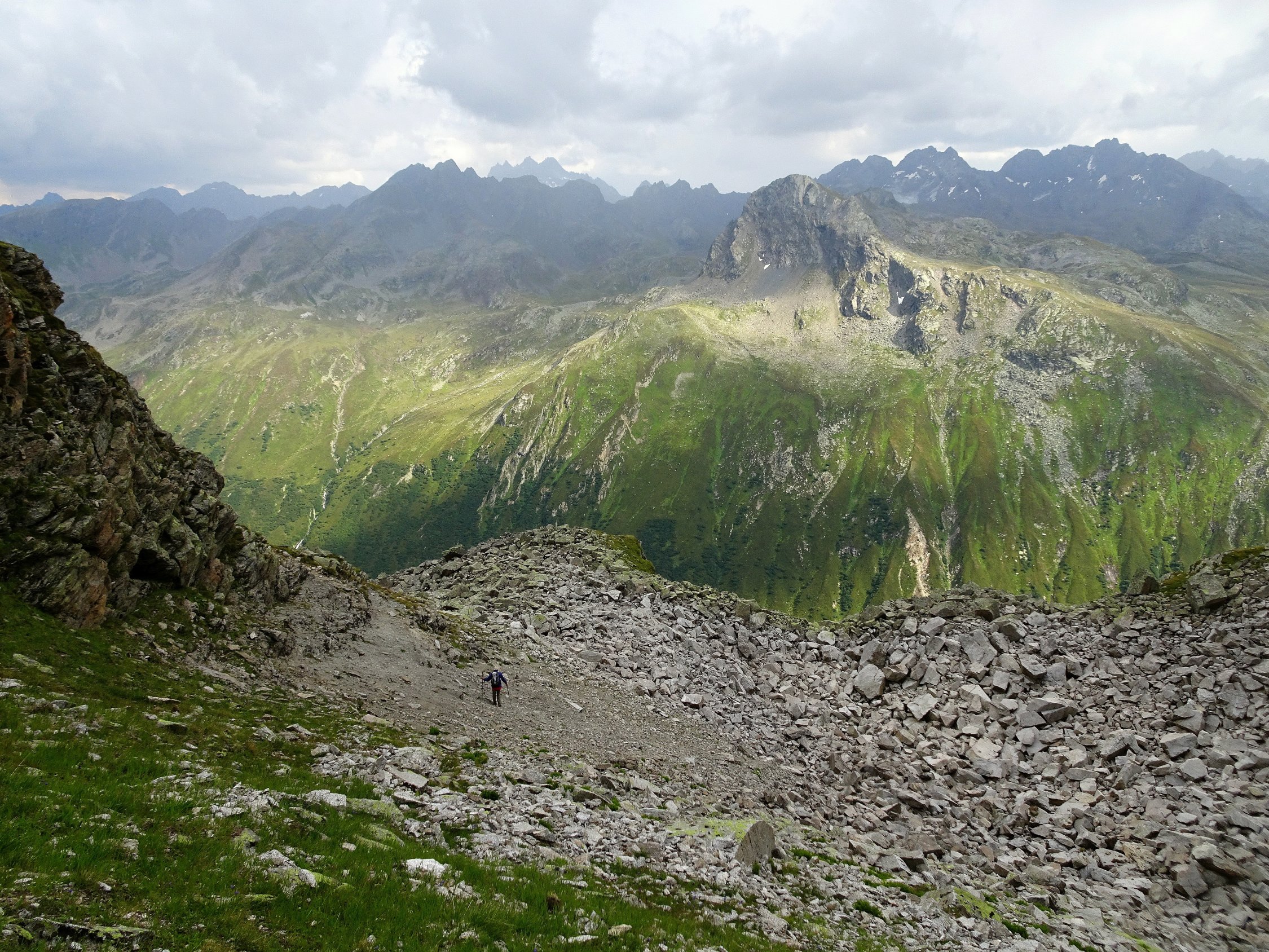 Wir haben im Anschluss noch die Kleine Vallüla überschritten, die viel Grasschrofengelände, jedoch auch einige II-er Stellen aufweist und teils ausgesetzt ist. Wenn man im Abstieg von der südlichen Scharte möglichst nach links quert, gelangt man wieder recht gut zum Höhenweg zurück.