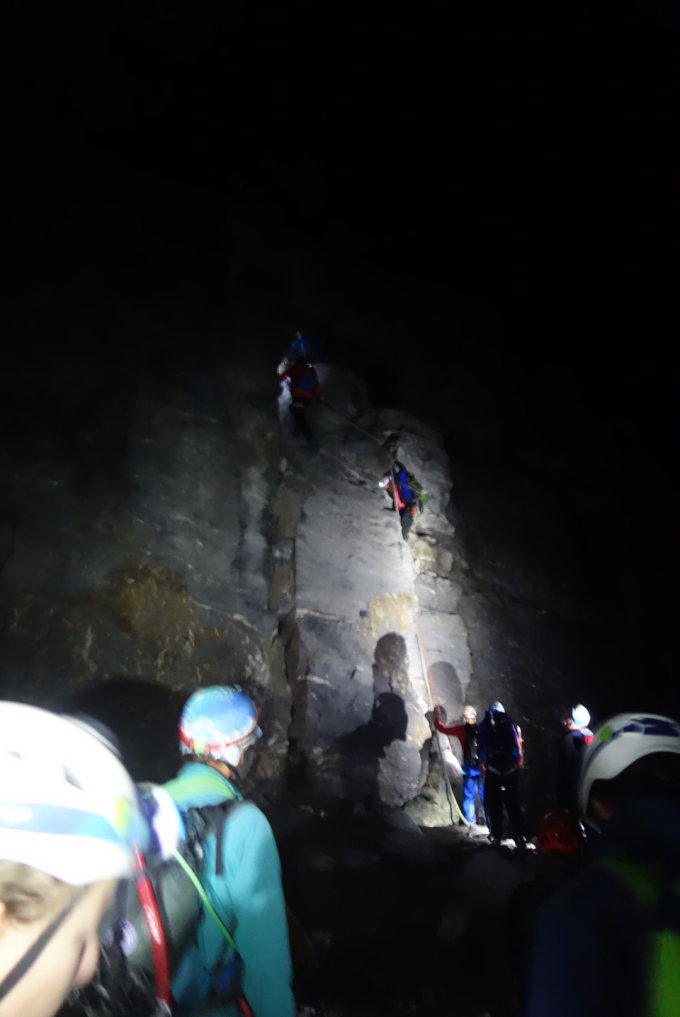 Start pünktlich um 5:00 als eine von zwei selbstgeführten Seilschaften. Ca. 18 geführten Seilschaften waren voraus. Die Wartezeit am ersten Felsaufschwung nutzen wir zum Anseilen ca. 5 min. Danach hiess es Gas geben um dran zu bleiben an den anderen Seilschaften. Die Wegfindung war durch die vorausgehenden Seilschaften einfach. Auch merkt man schnell wenn man im Abseits ist. Der richtige Weg ist immer Schuttfrei und einfach.