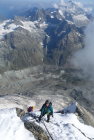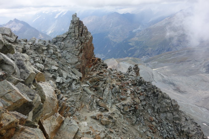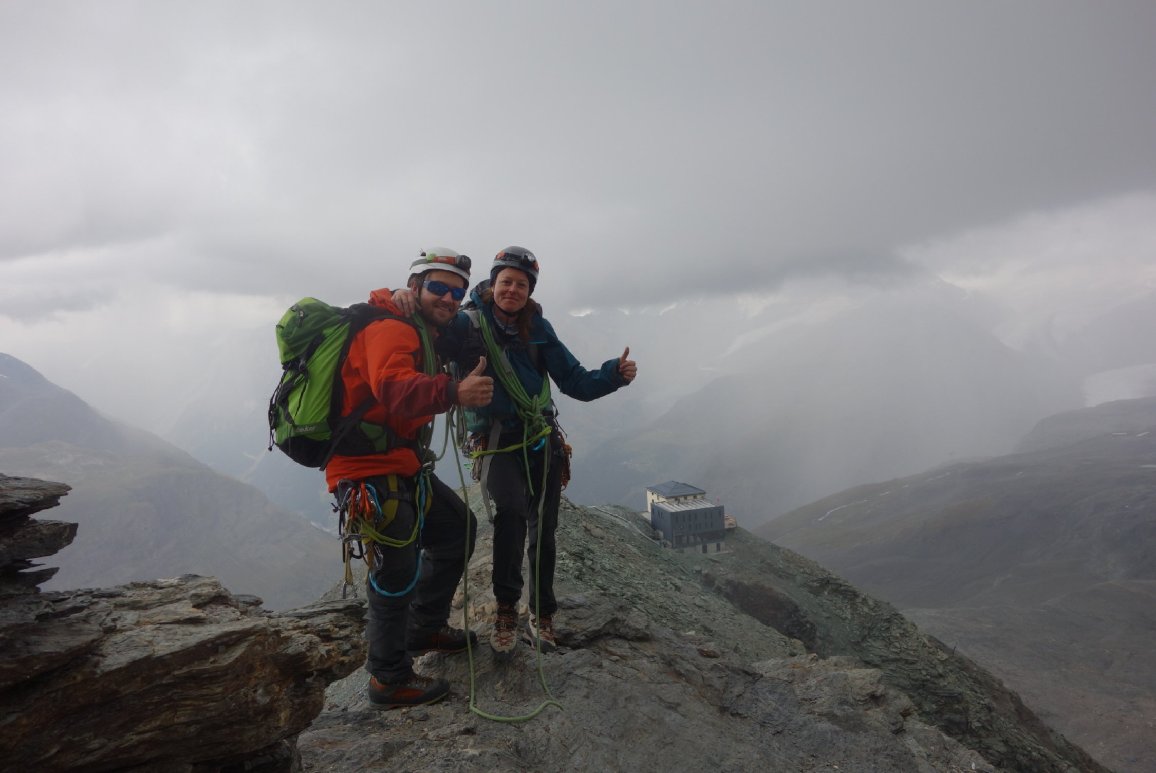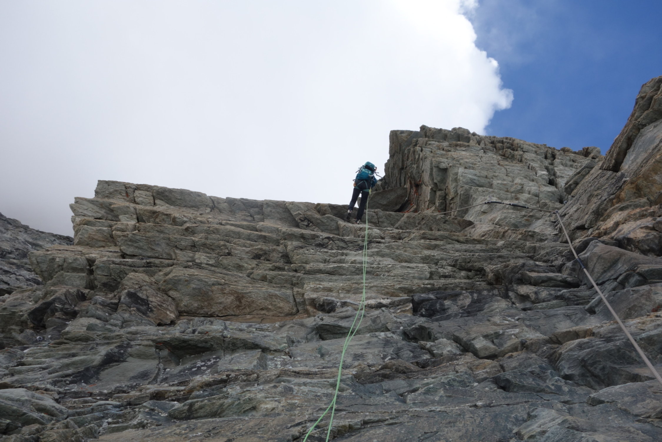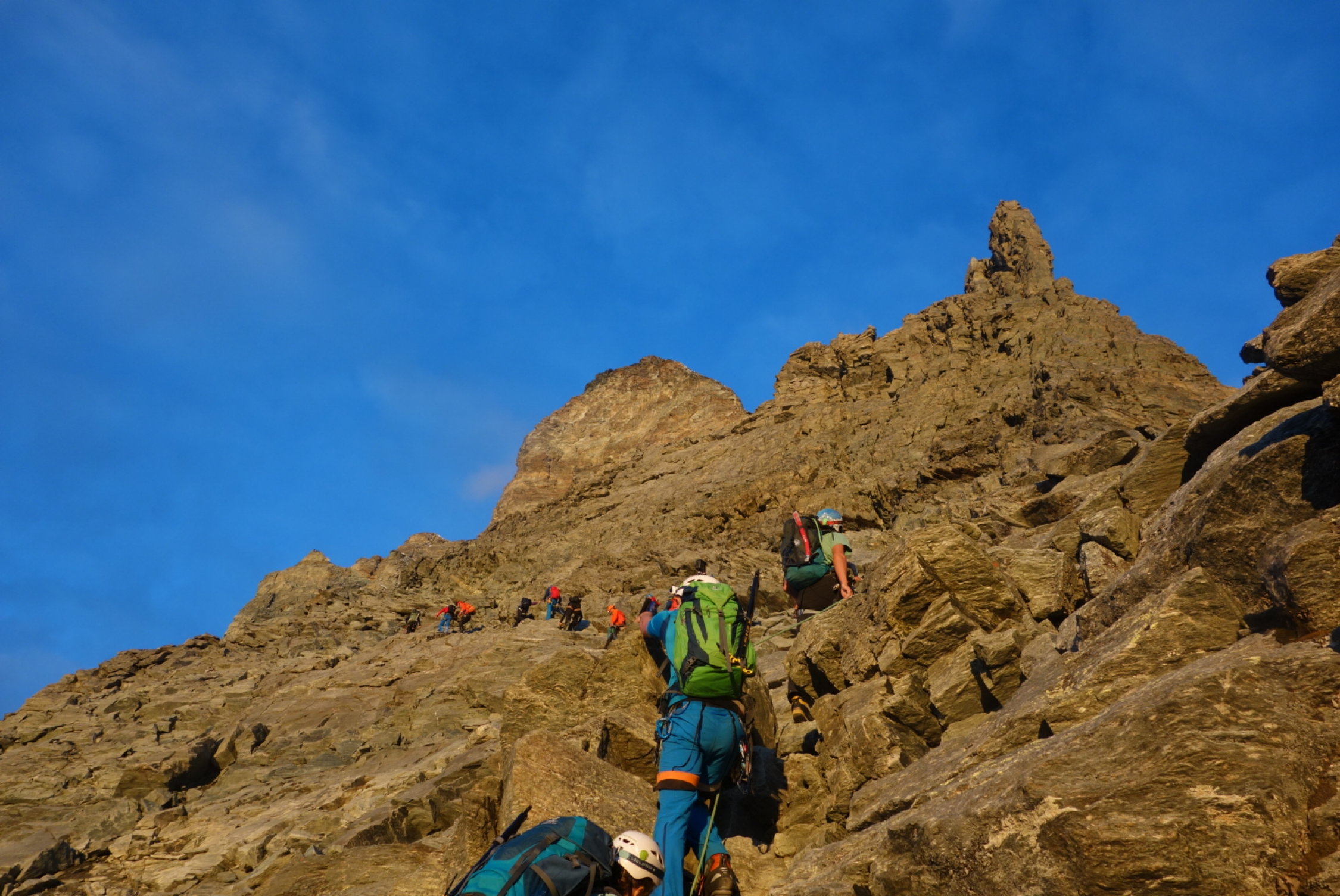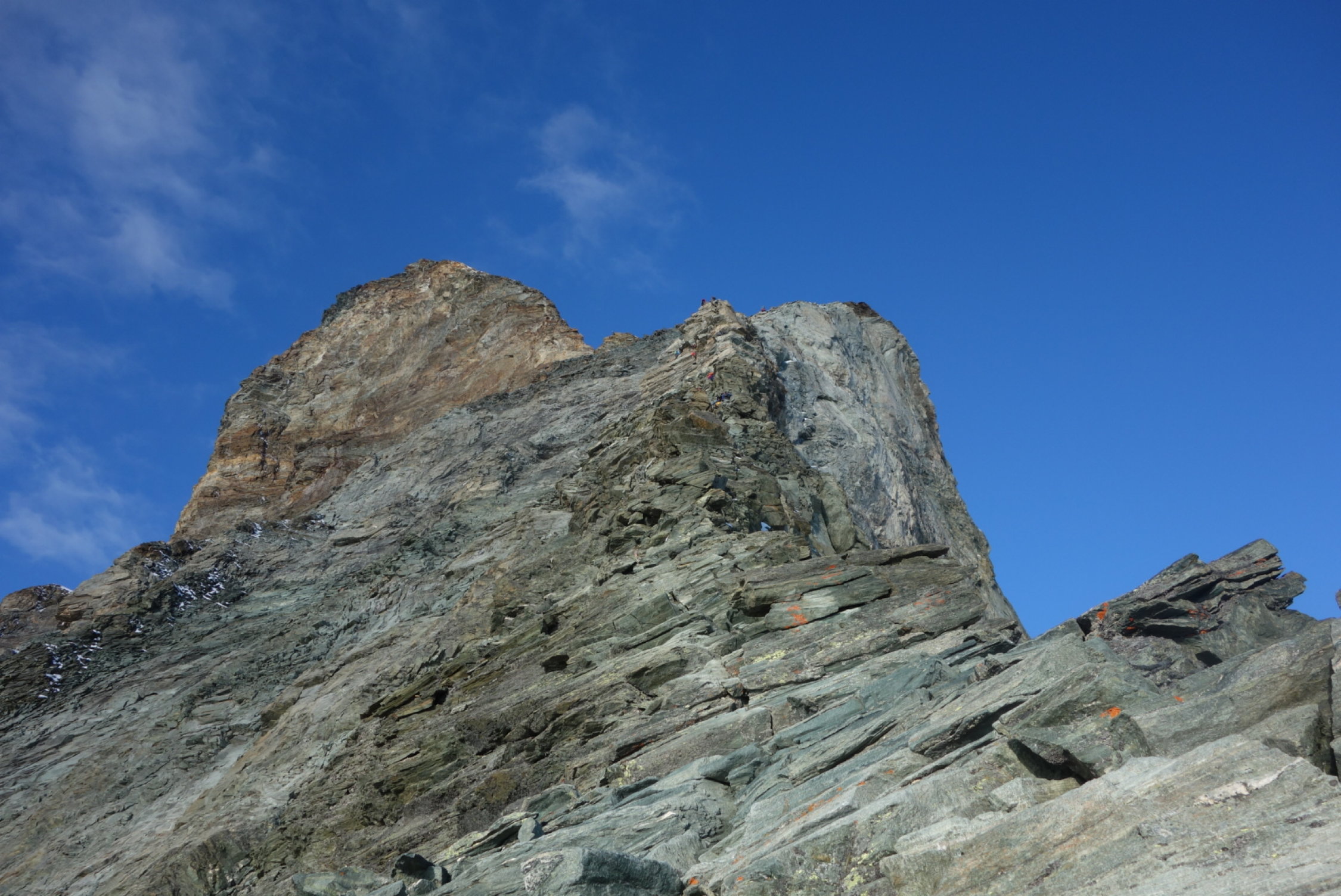 Im Abstieg konnten wir fast alles abklettern. Nur beim roten Turm und bei der unteren Moseleypkatte seilten wir 20m ab. Wir waren insgesamt überrascht wie gut das Abklettern geht. Wenn man gut hinschaut hat es immer satte Tritte und Griffe bzw. die Matterhorn typischen Seilbolzen.