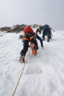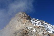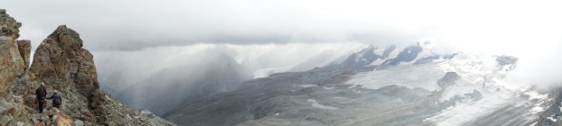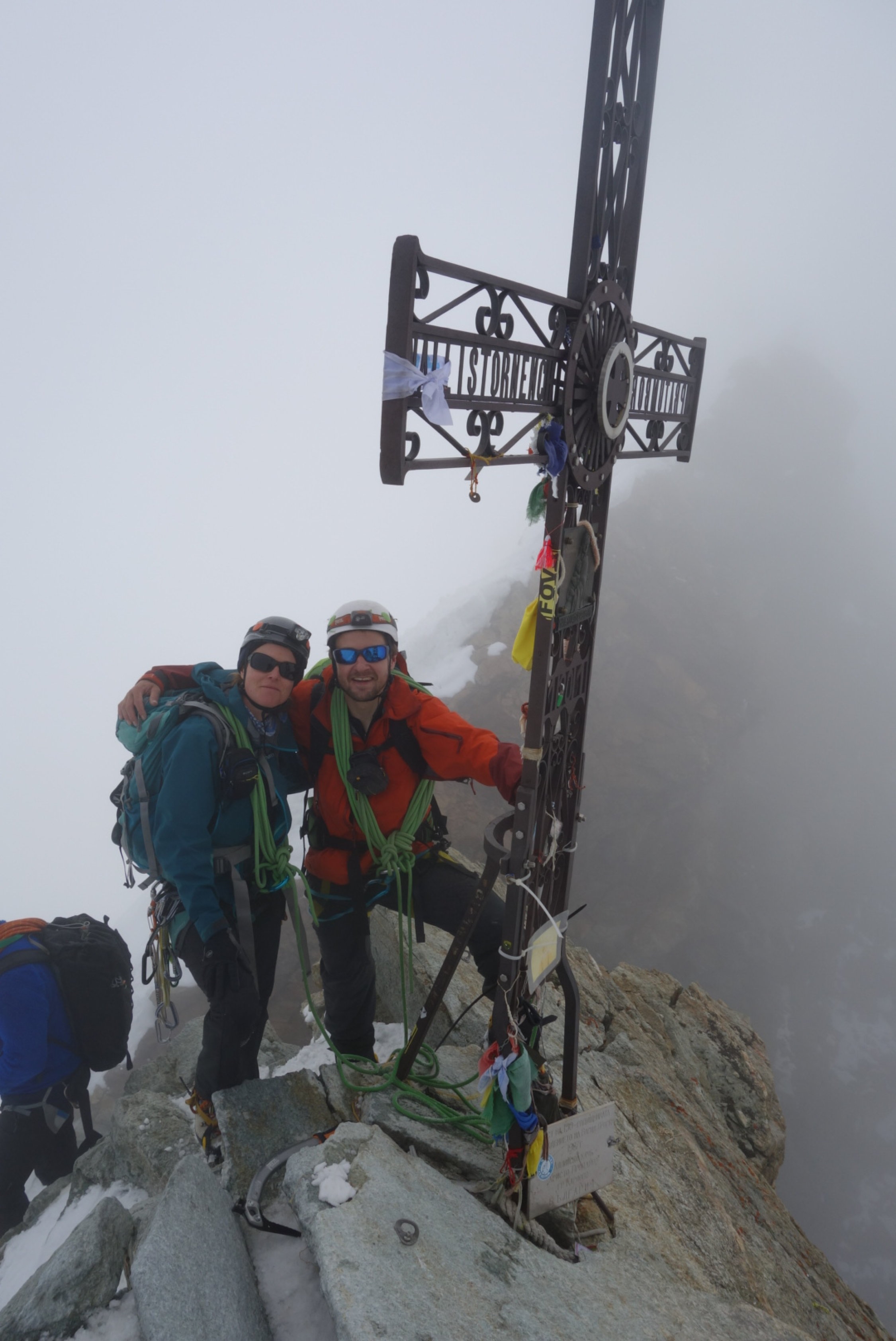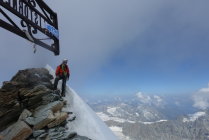 Im Schneeteil hatten wir guten Stufen mit Trittschnee ohne Eis. Nach den Tauen holten wir den Pickel raus und waren um ca. 9:45 am Gipfel. Im Aufstieg hatten wir noch blauen Himmel bis 9:00 gesehen.Leider hing nun eine Wolke hartnäckig am Gipfel.Ab und zu sah man aber trotzdem etwas vom italienischen Gipfel aus, wo uns die ersten Seilschaften vom Liongrat entgegenkamen.