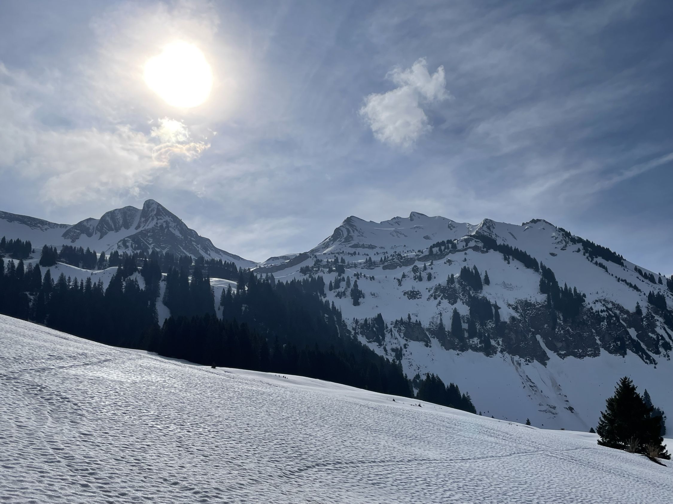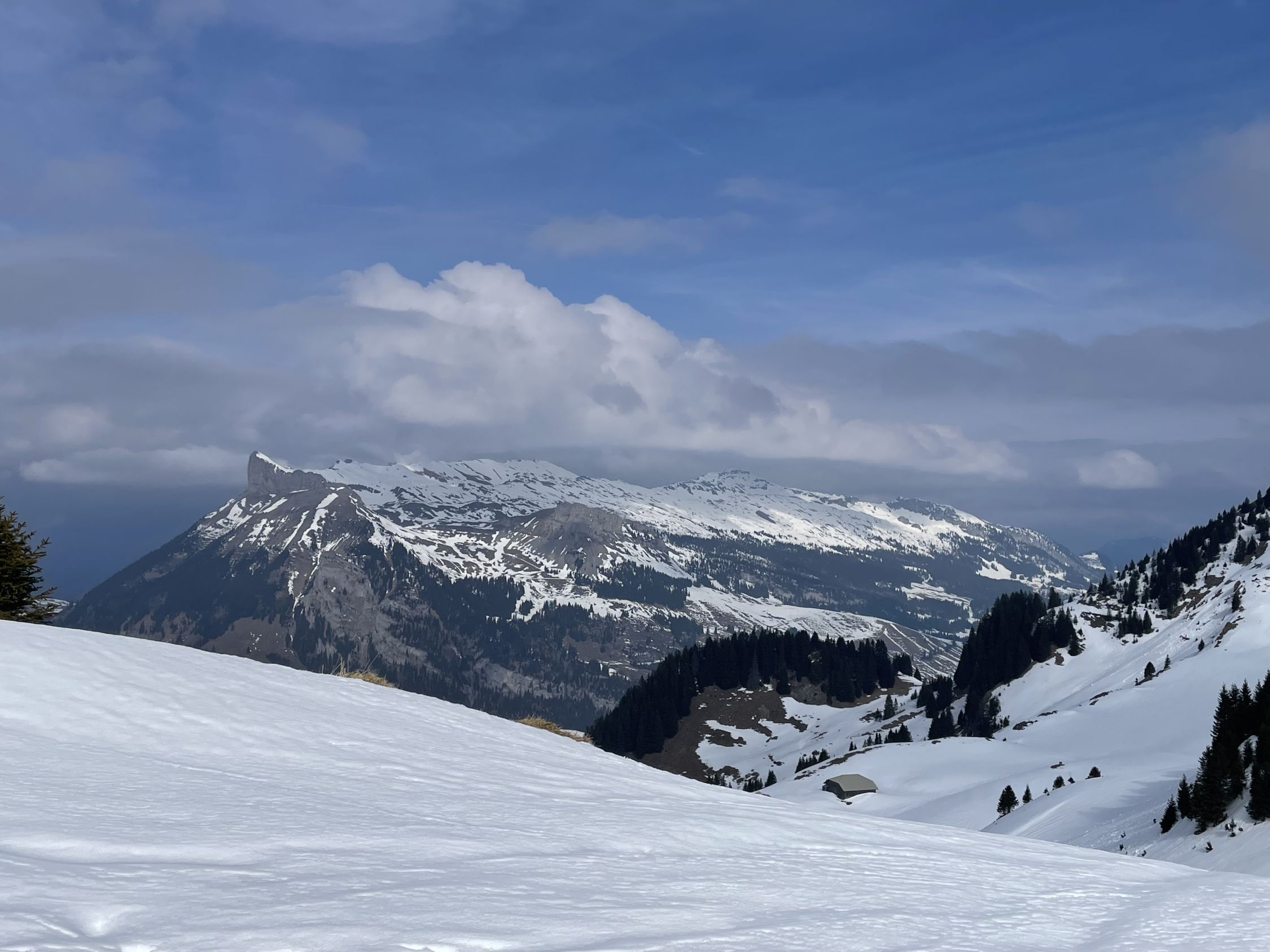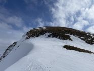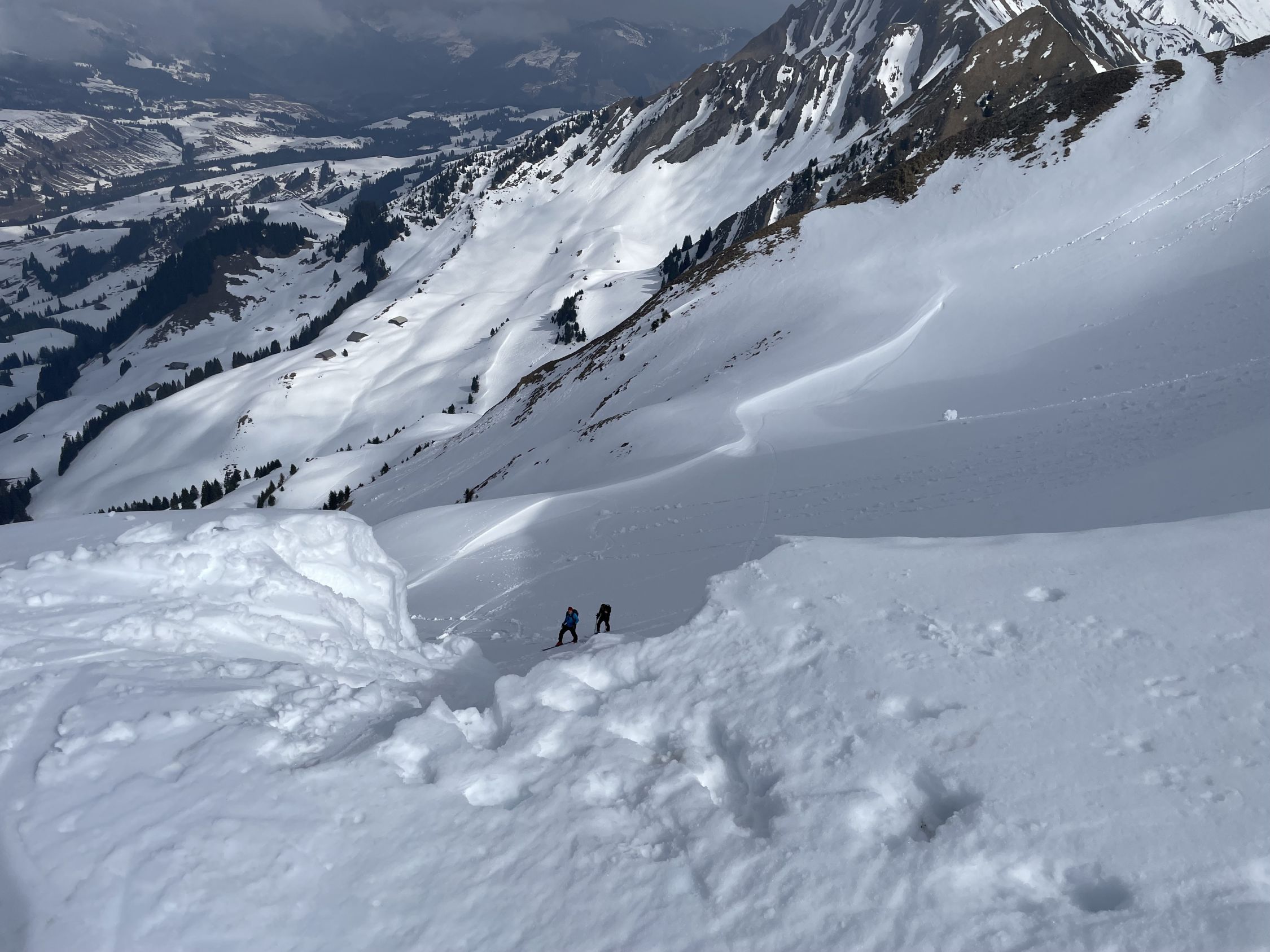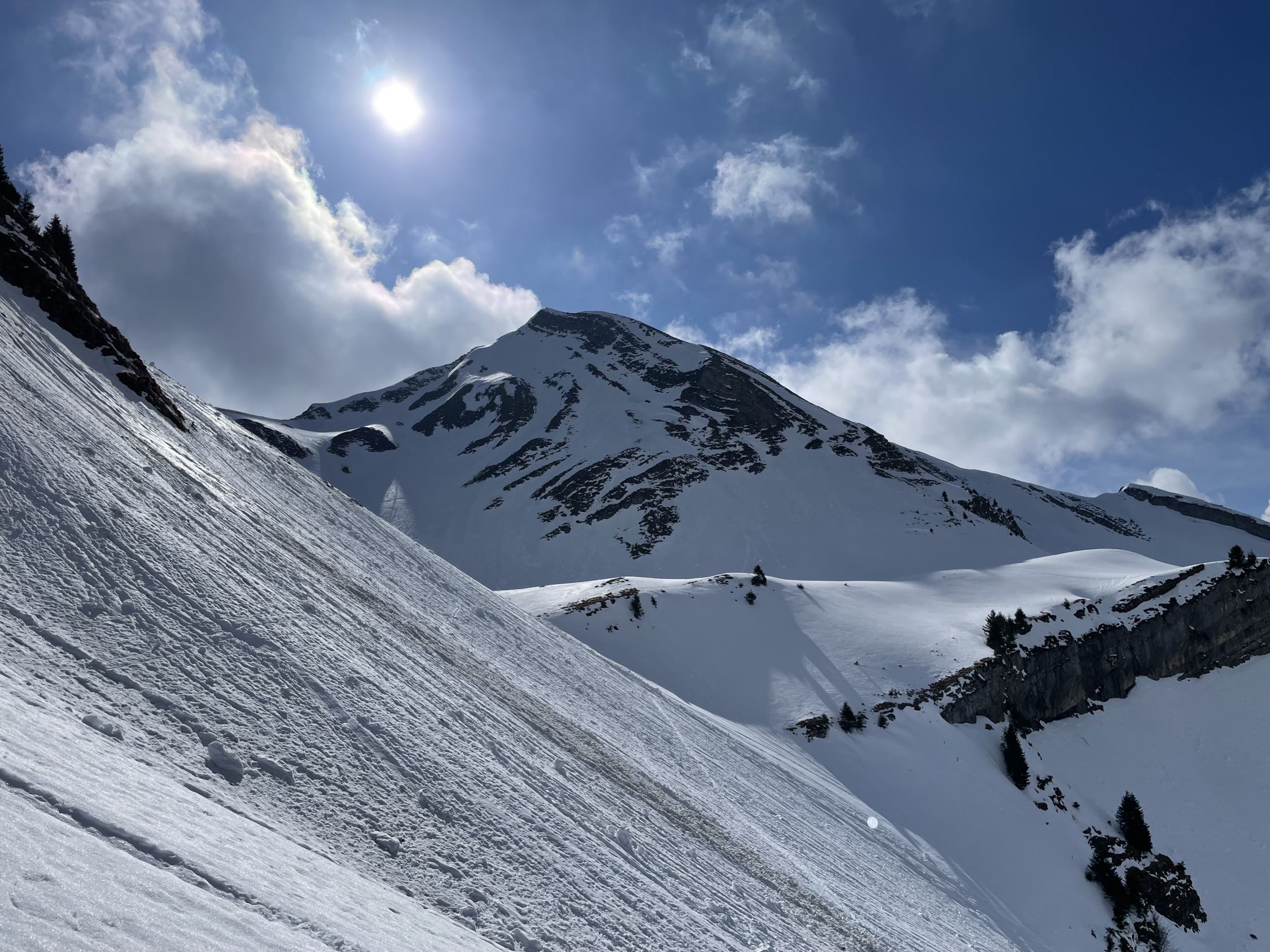Start im Kemmeribodenbad, zu Fuss auf aperer Strasse bis PP Schönisei (mit PW auch fahrbar, Automat, Gebühr 10.-). Ab da fast durchgehend satte Schneedecke (bis auf 2 kurze Strecken im Wald und letzte 40hm am Gipfel). Abstrahlung mässig, trotzdem gut tragend im Aufstieg. Auf 1770müM oberflächlicher Nasschneerutsch von vorherigen Tagen; Verwerfungen gering, mit Ski gut passierbar. Schlüsselstelle ist die Steilstufe auf ca. 1940müM (schattiger NW Hang, verfirnt hart bis brüchig, mit Harscheisen gut zu gehen). Max 2m Wechte am Gipfelgrat, an dünnster Stelle mit Ski problemlos).