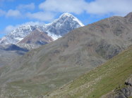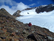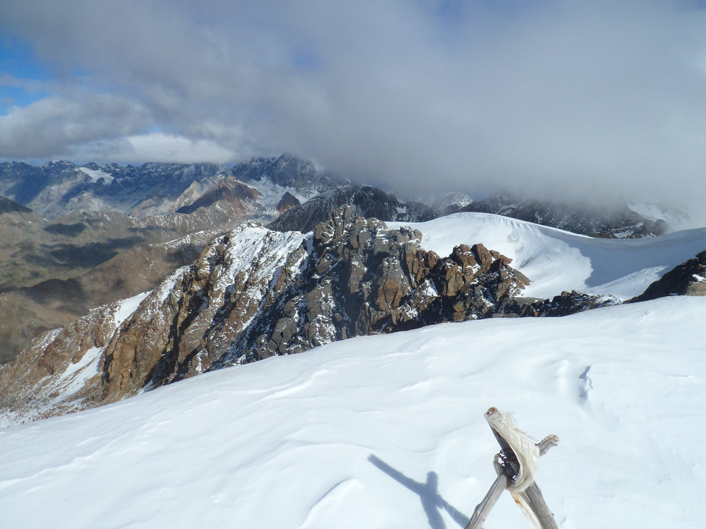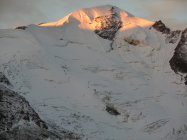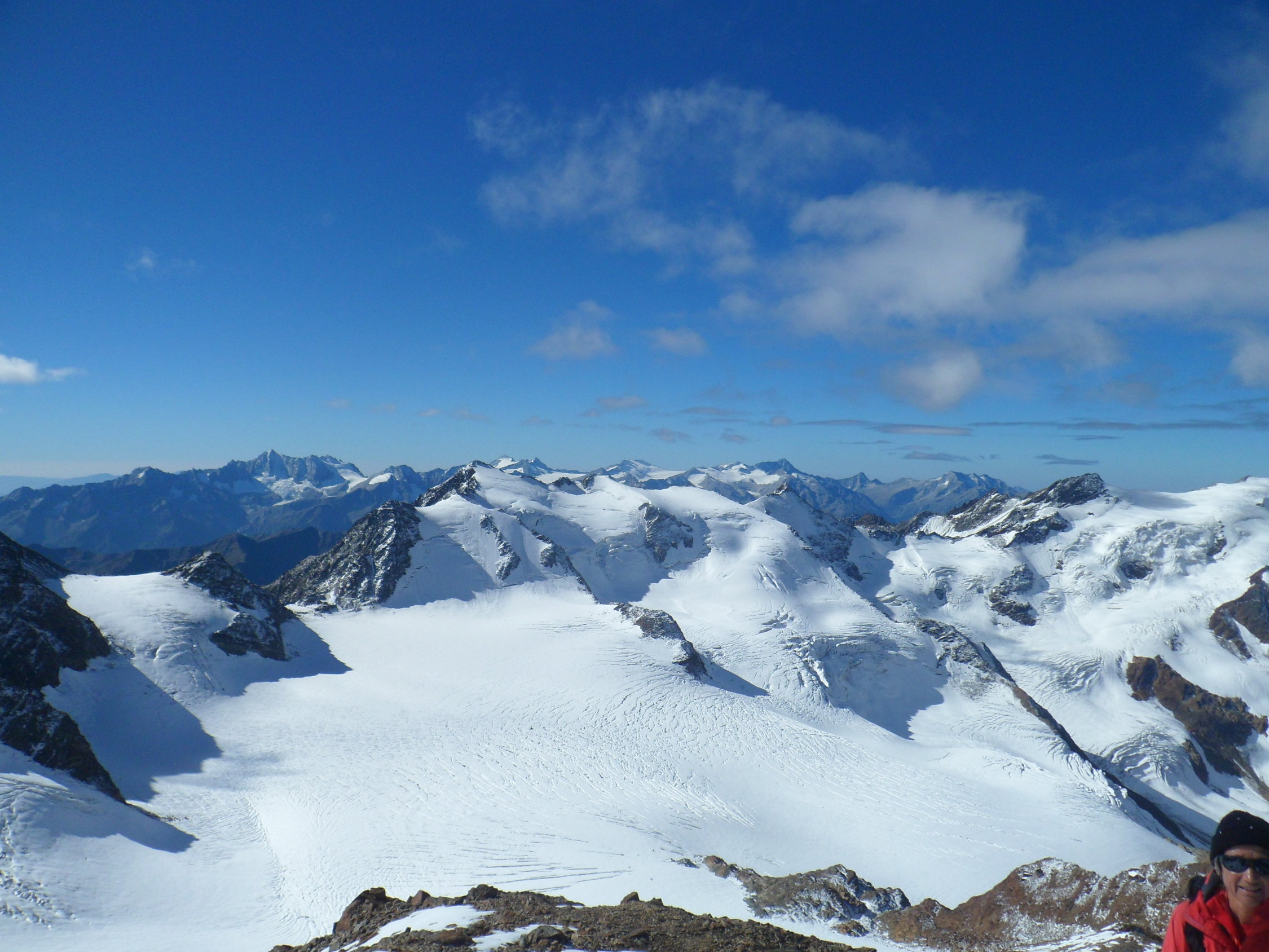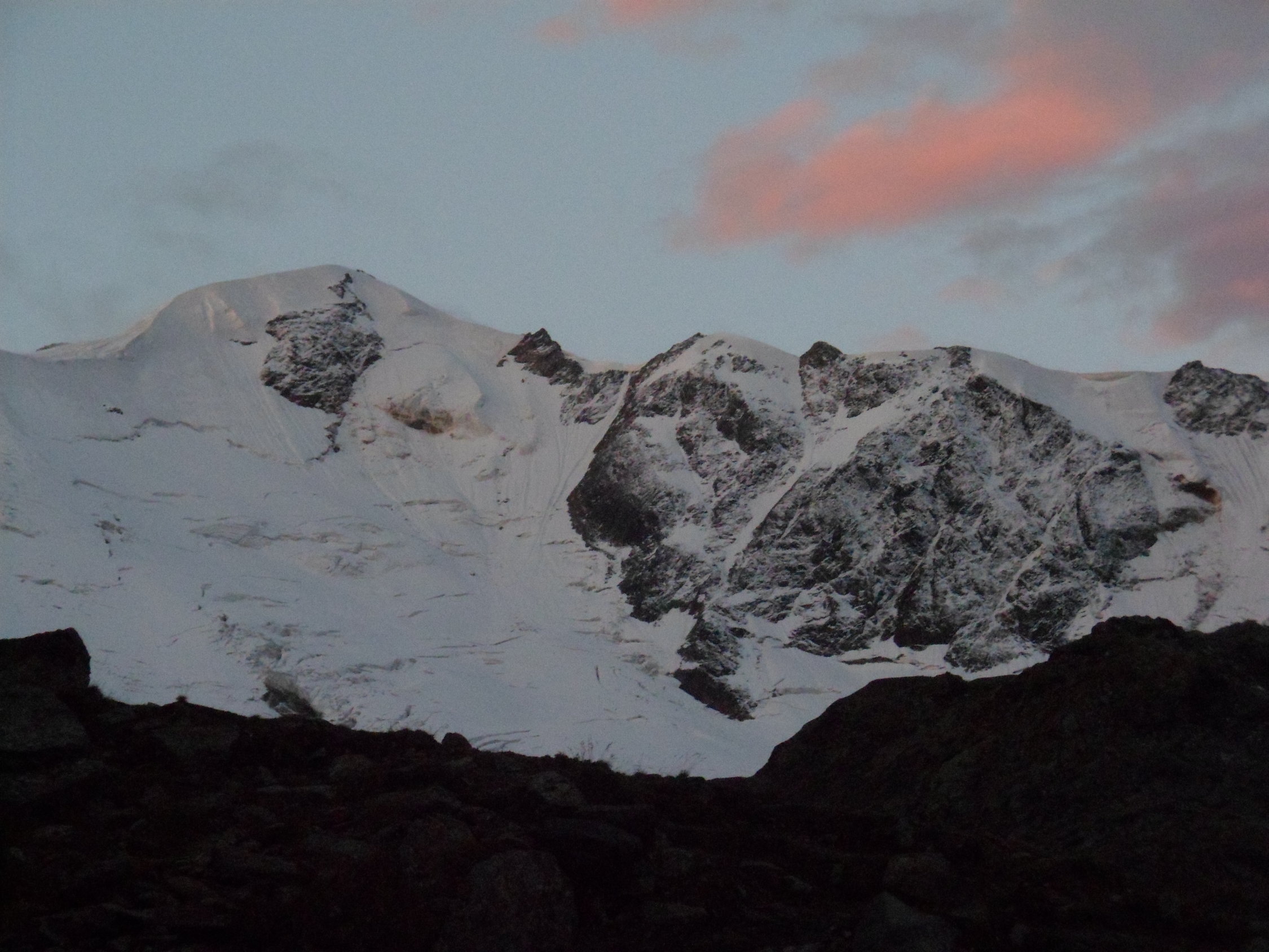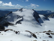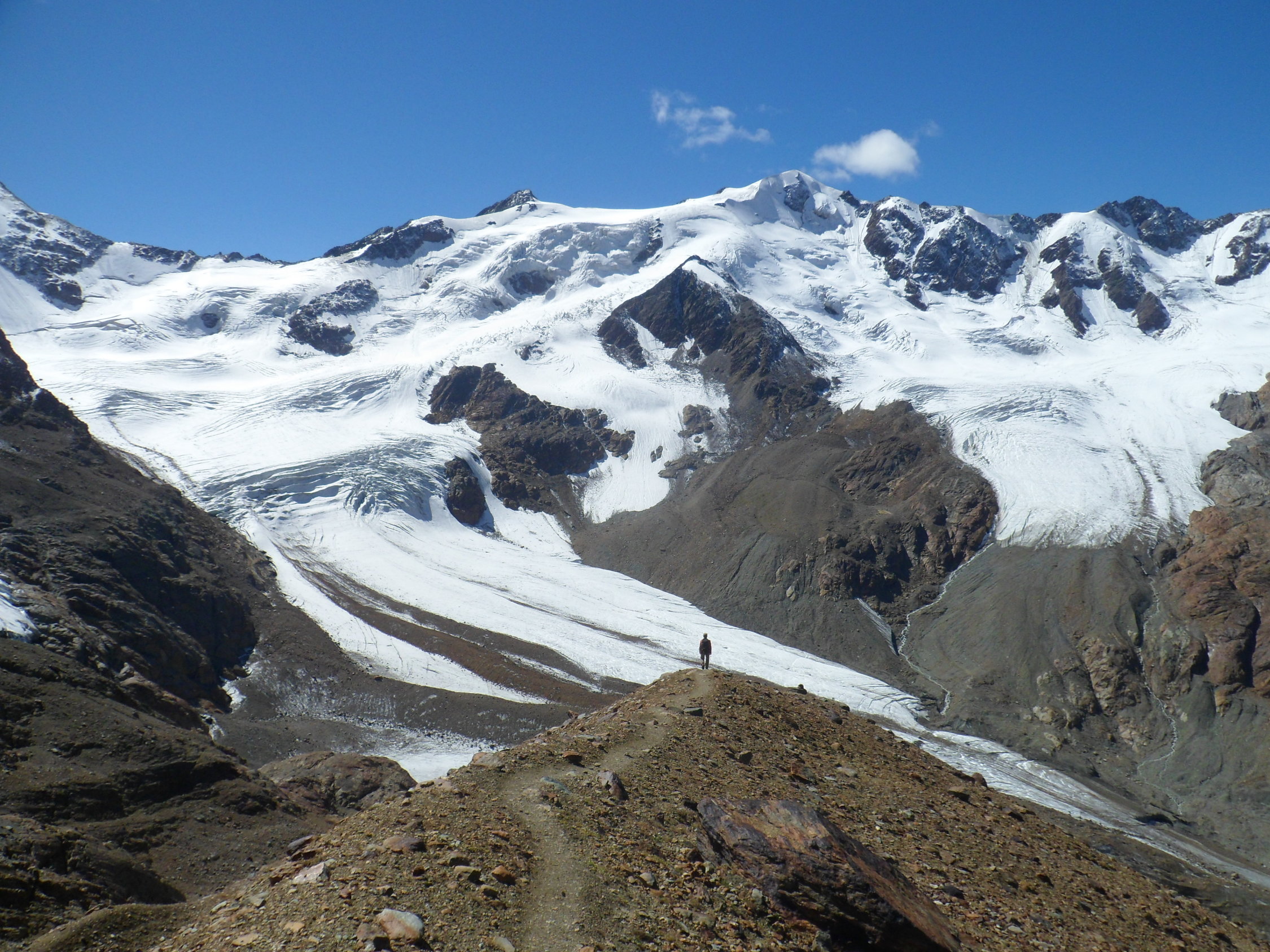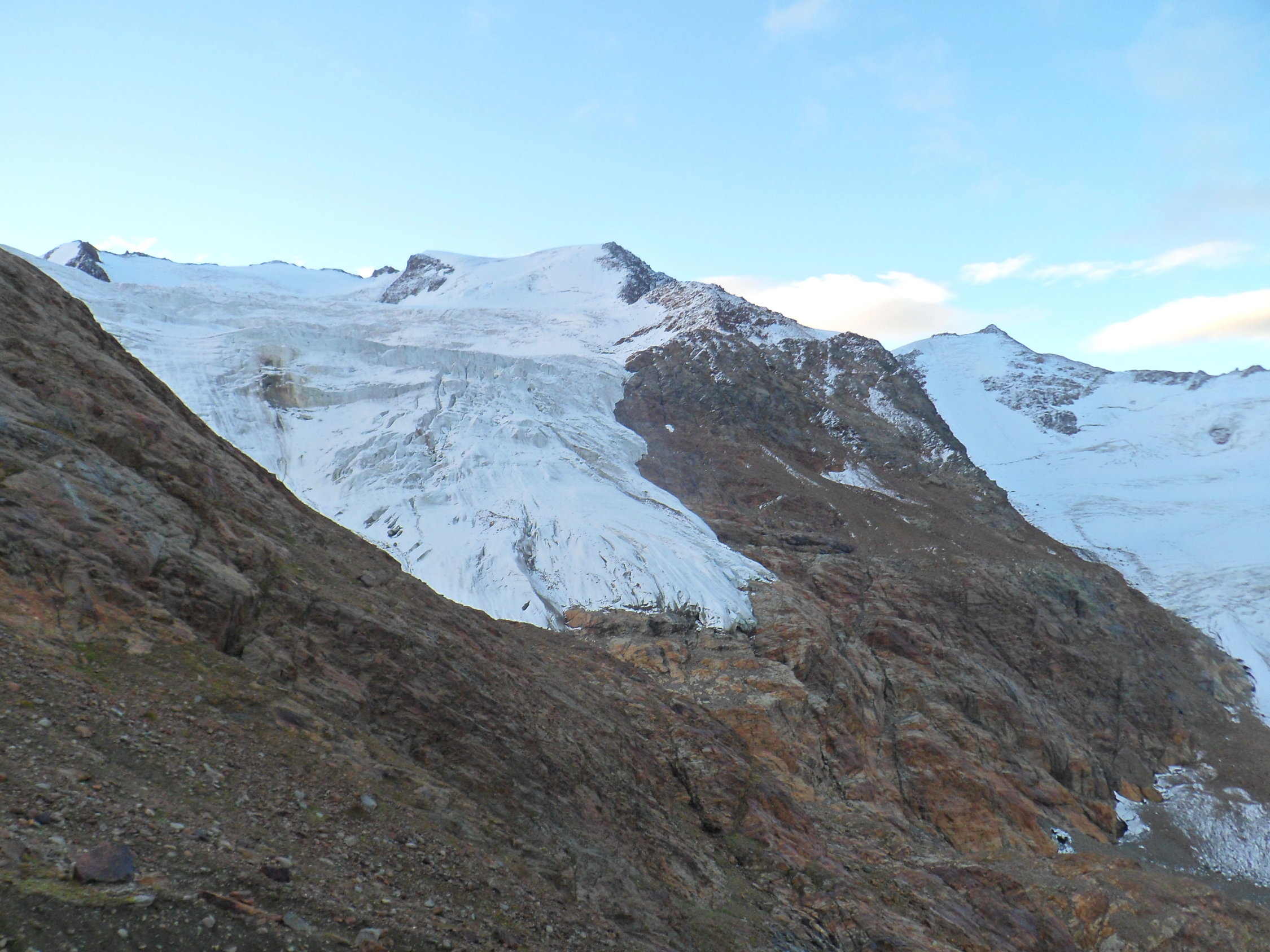von der Branca Hütte Von der Branca-Hütte den Wanderweg alles auf den Moränen. Bei ca 3125 auf den Gletscher zuerst eher links dann einen weiten Bogen nach Süden. Schiesslich den Südgrat zum vereisten Gipfel.