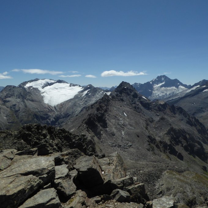 Bei top Wetter und Bedingungen auf einer weitgehenst Farbklecks freien Route zum dem Wächter des Oberengadins. Nur ganz oben wo man vom NO-Grat kurz in die N-Wand queren muß. War noch etwas Neuschnee auf vereistem Untergrund, kurz etwas heikel. Großartige ruhige Tour auf einen Aussichts Balkon der Extraklasse.