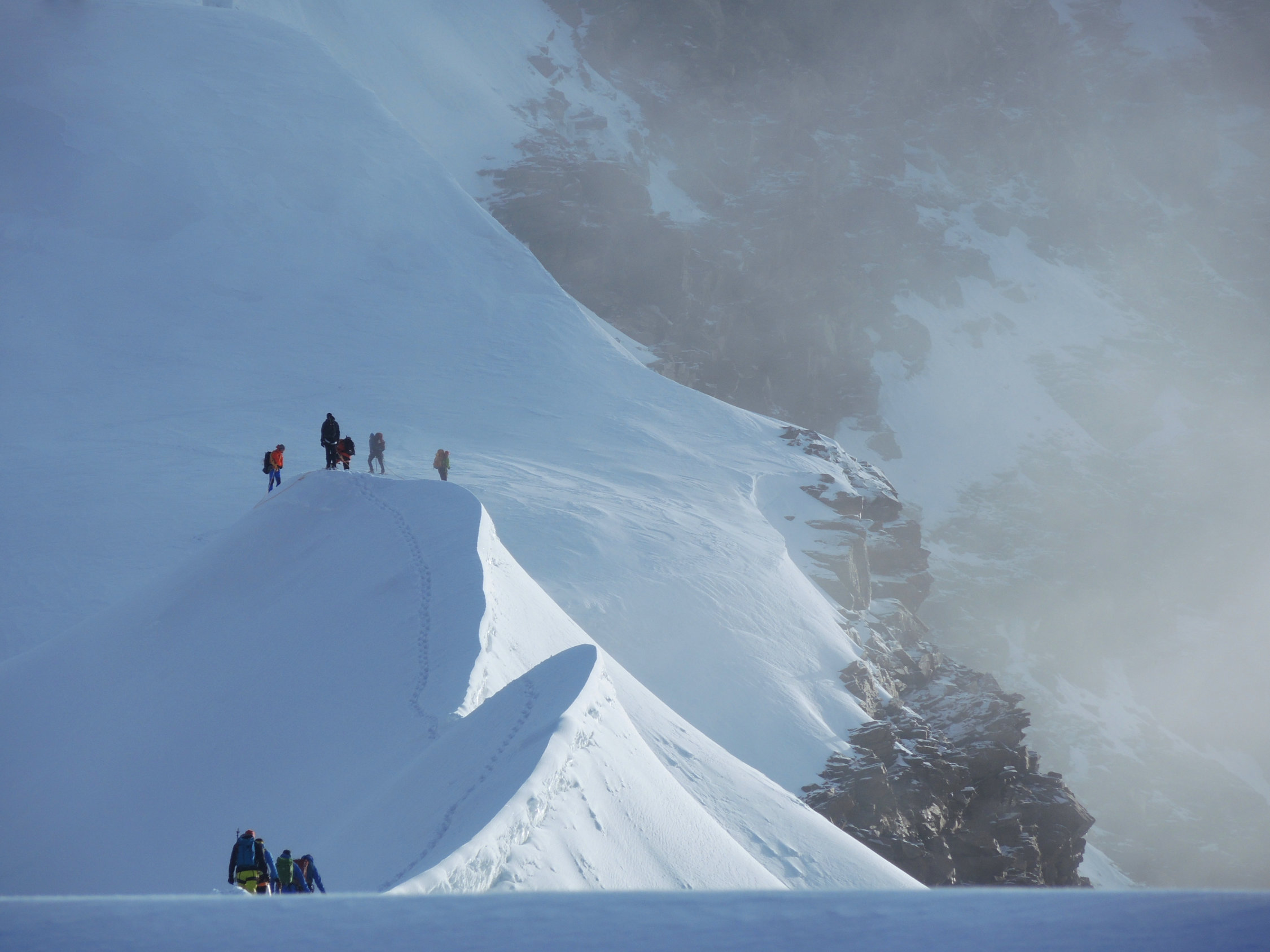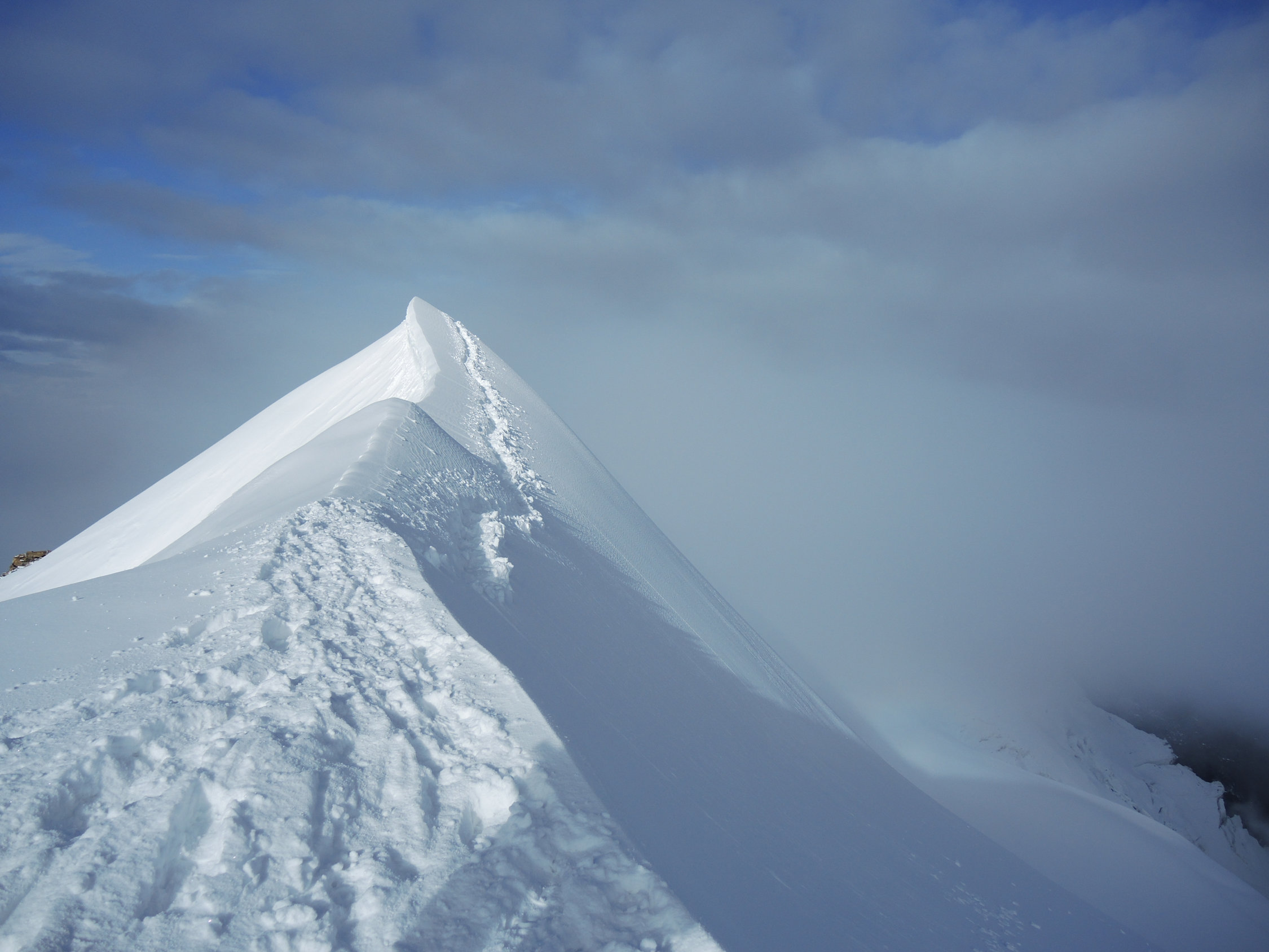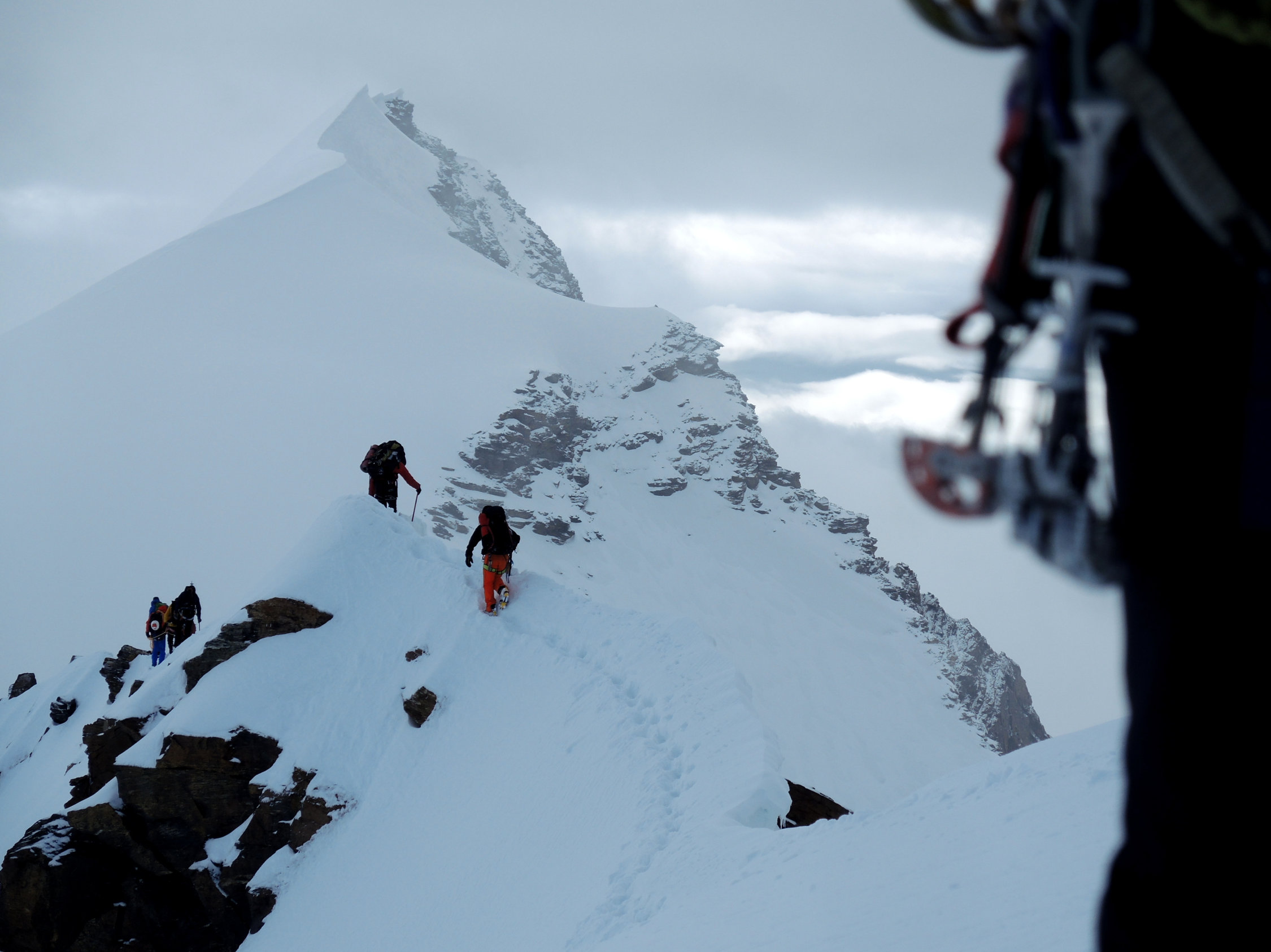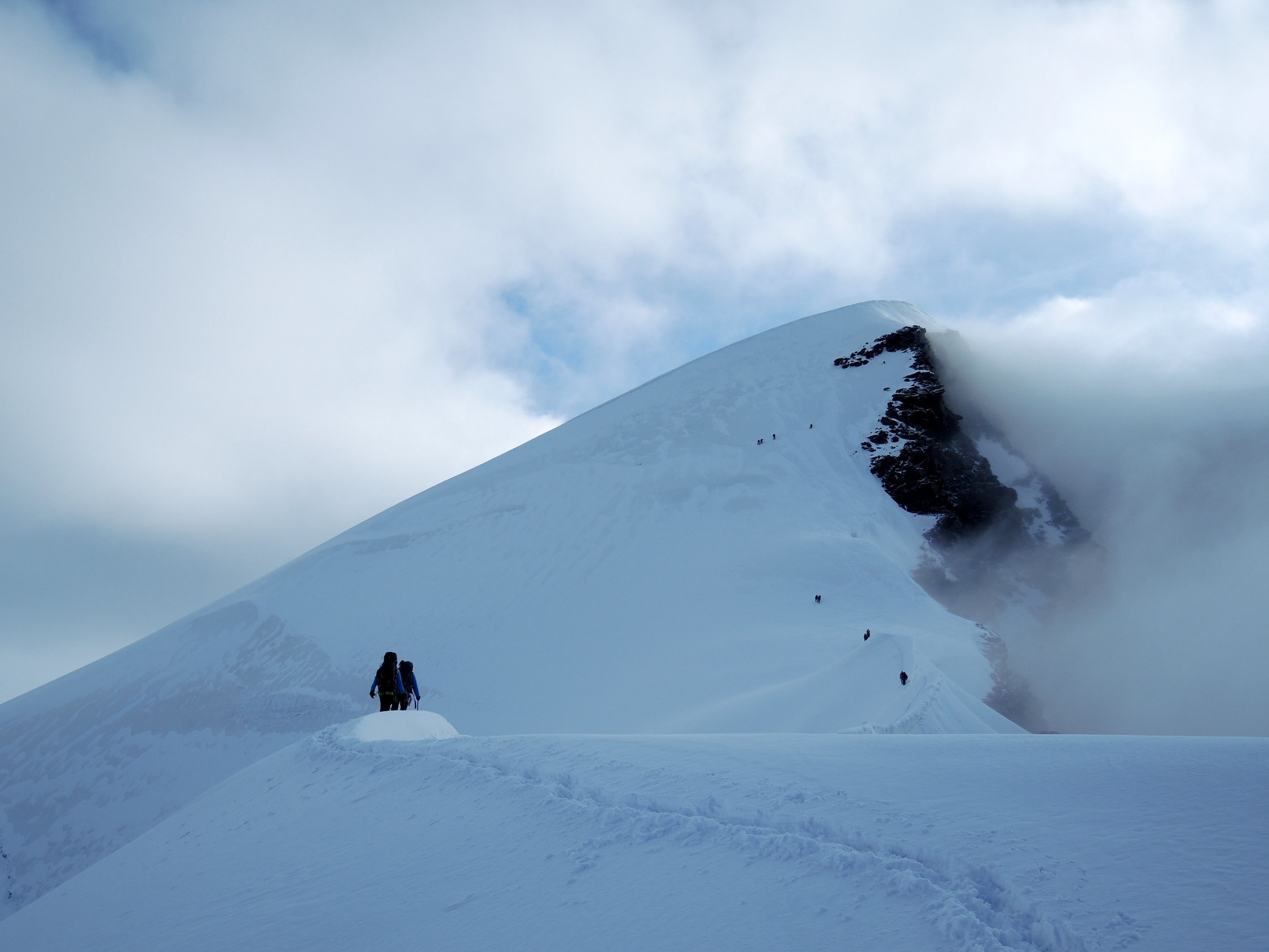 Eine grandiose Tour, anspruchsvoll vor allem durch die Dauer-Konzentration und die Höhe. Auf der Schweizer Seite war leider alles neblig, nur nach Süden konnte man den Tiefblick genießen. Gute Bewirtung und ein fantastischer Apéro auf dem Rif. Quintino Sella. Das Essen auf der Cap. Margherita ist schon oft gelobt worden, dem kann ich mich nur anschließen! Da ließ sich auch die komplett durchgelegene Matratze fast verzeihen. Nette Teams auf beiden Hütten!
