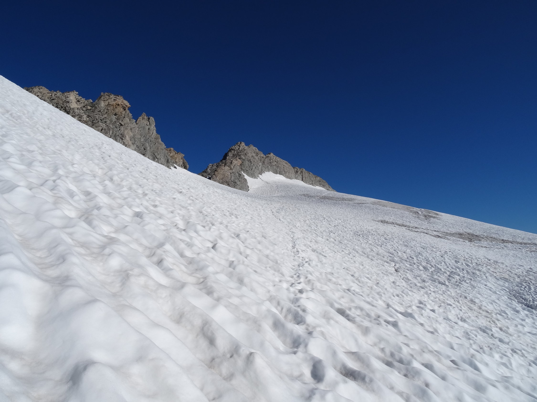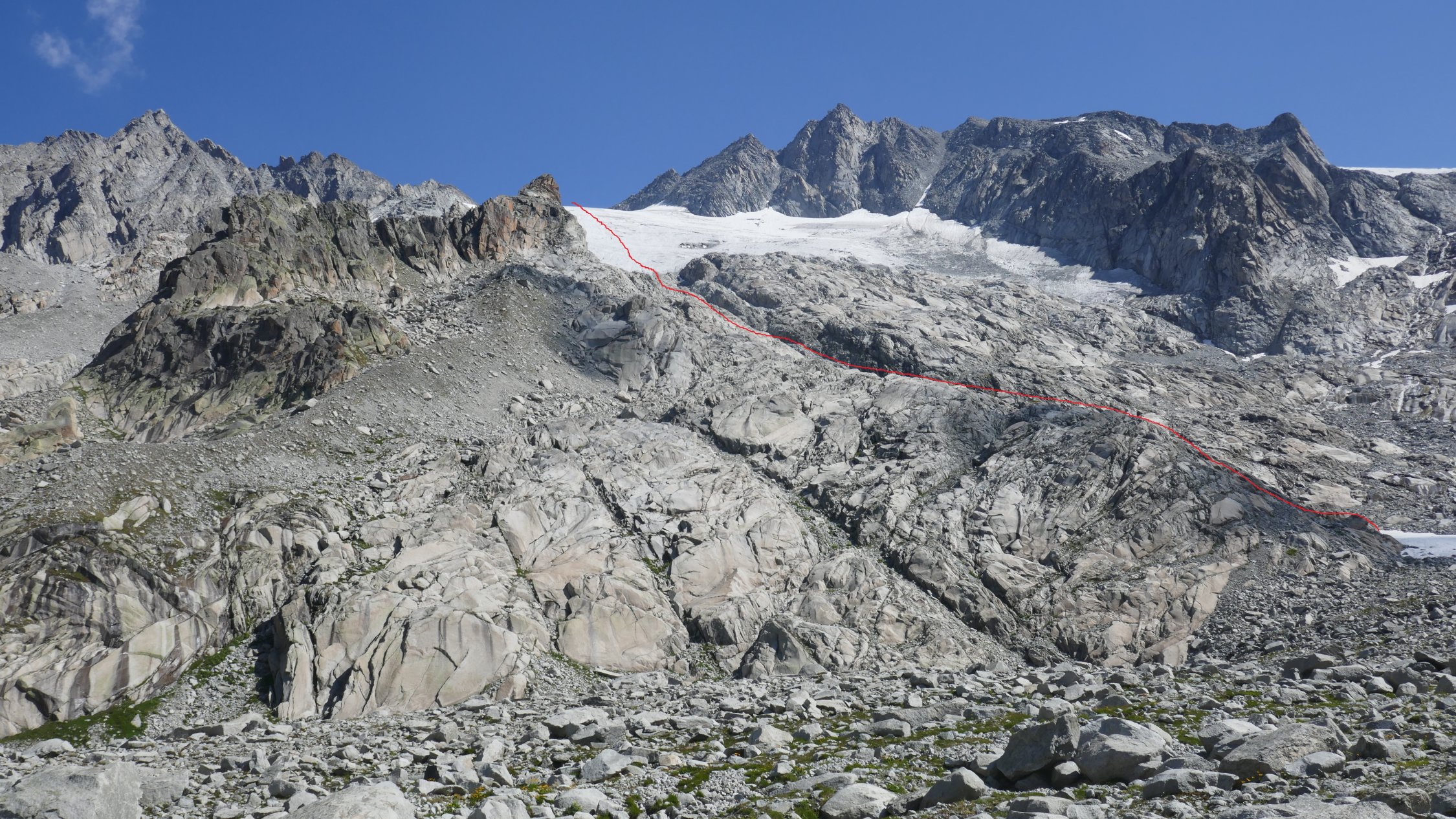 Start 5:45 Gelmerhütte und über Gltescherschliff (rot Punkte und Steinmännle) zur Gletscherzunge auf ca 2870m (1,5h). Sehr steile, blanke Gletscherzunge links aufsteigend, 2-3 grosse Spalten ab flacherwerdendem Gletscher. Ab ca 3050m Schneeauflage bis Diechterlimi (1h). Wechsel auf Triftgletscher (Nassschnee) und Ost-Traversierung zum N-Grat (30min). Seilfreie Kletterei die letzten Meter direkt an der Gratkante zum Gipfel. (gesamt 4h)