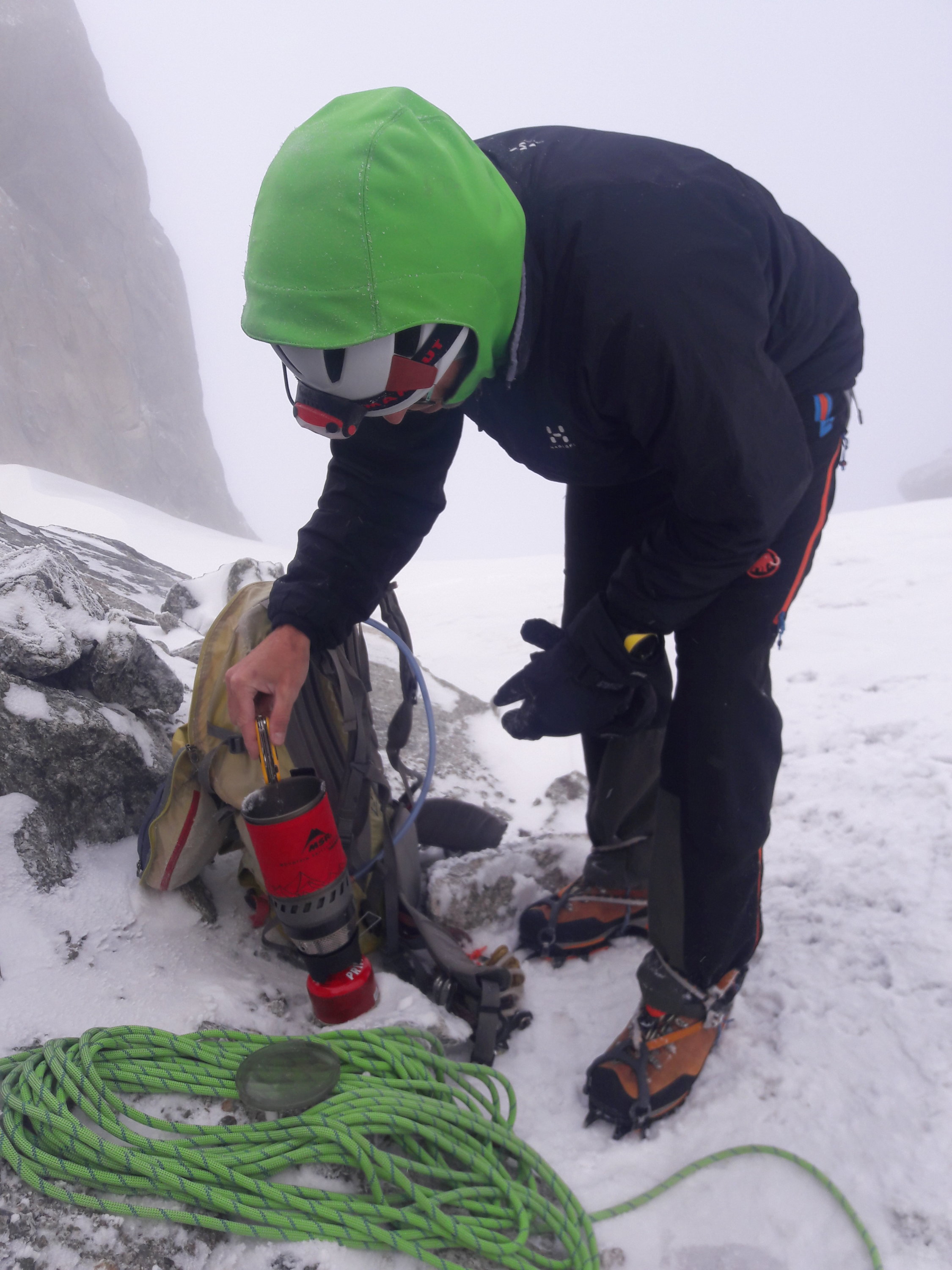 Der Zustieg zum Frühstücksplatz über die Felsen war mit Steigeisen und dem Neuschnee etwas mühsam und nicht leicht zu finden.