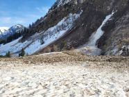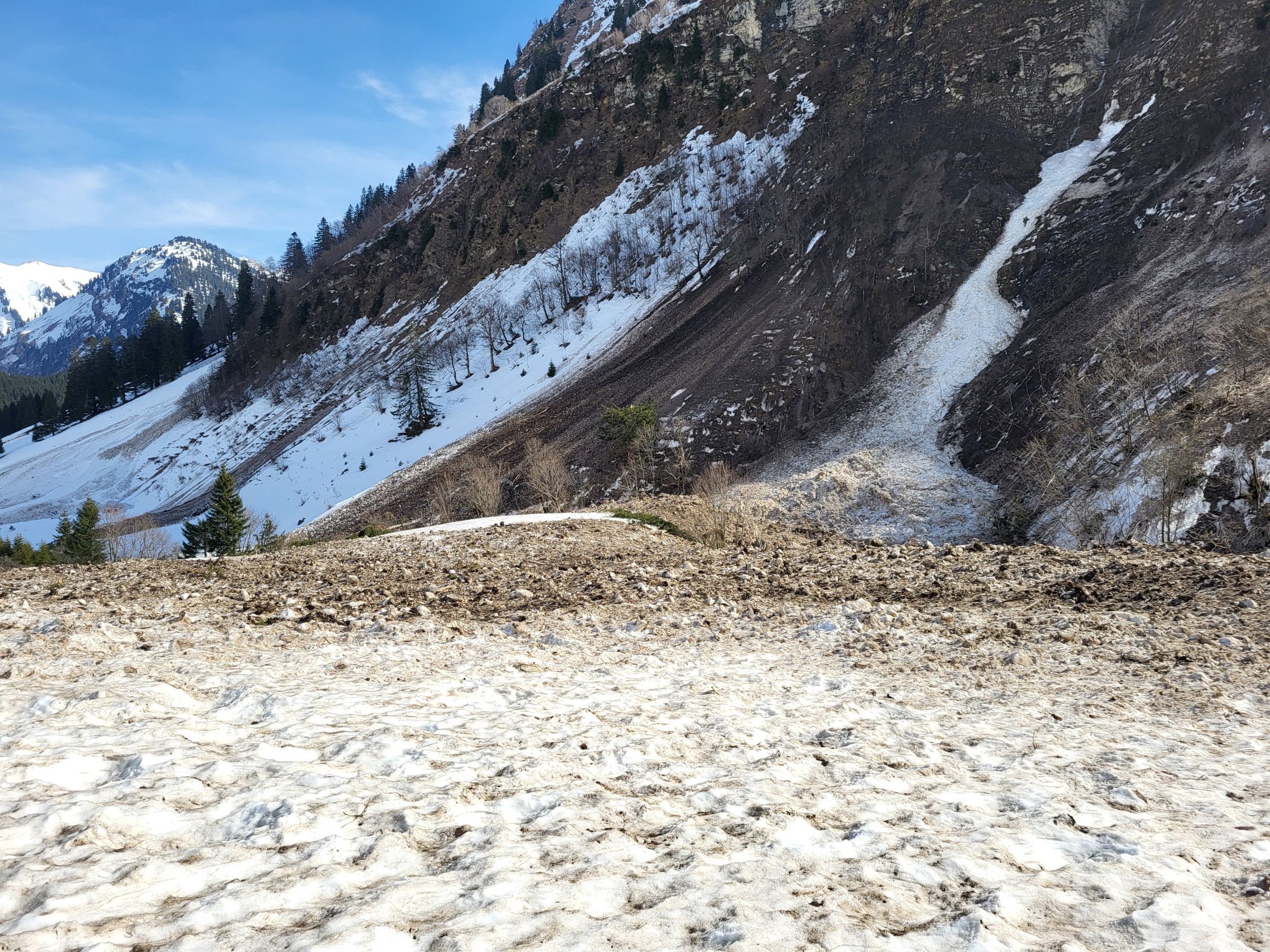 Der Daumen wäre deutlich besser gewesen. Unterhalb der Wanne übles Lawinengelände. Geholze über die Bollen. Das hat einige Körner gekostet. Derartige Lawinenabgänge habe ich da noch nicht gesehen. Abfahrt orographisch rechts, oben gut weiter unten dann schlecht wegen den Regenrinnen.