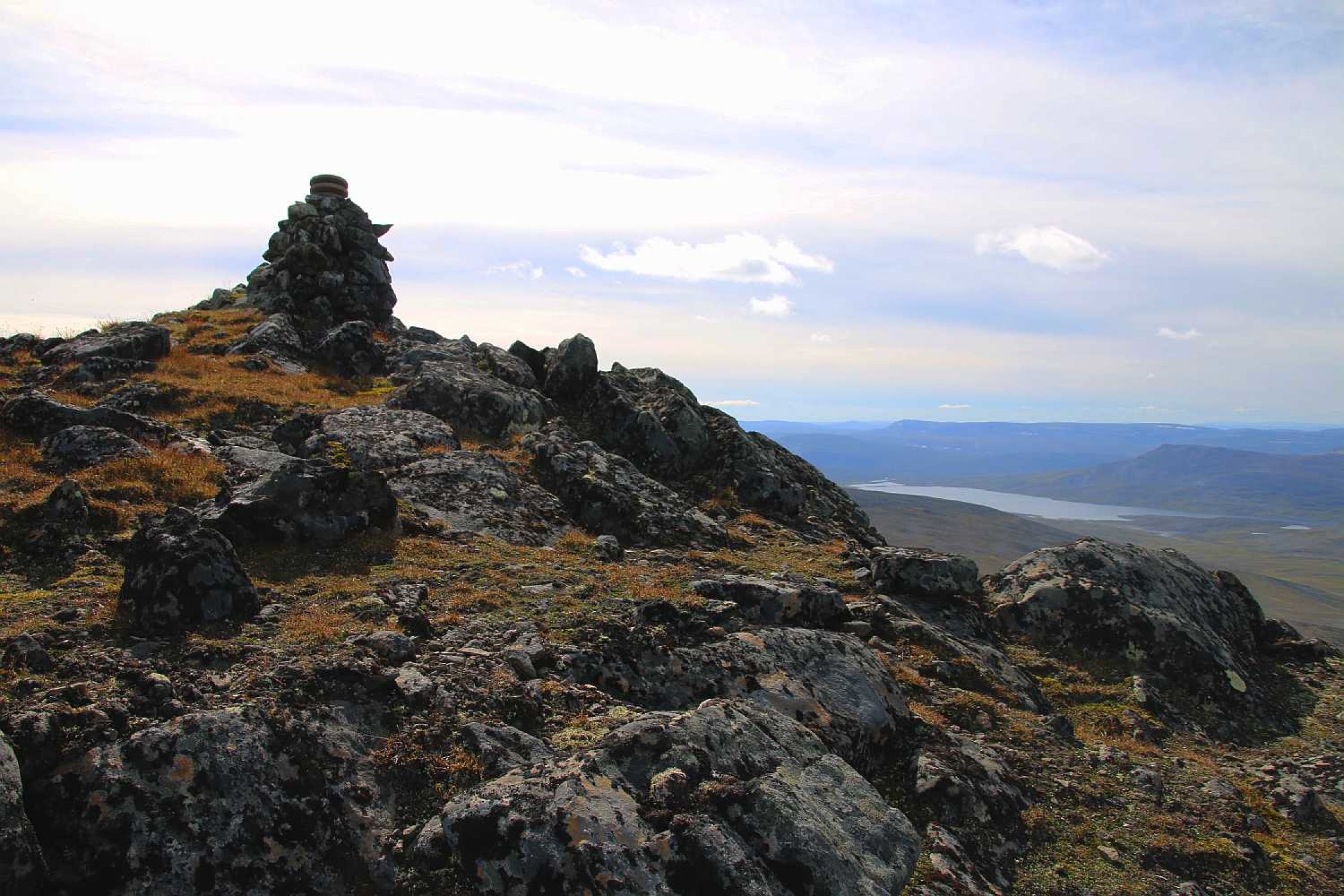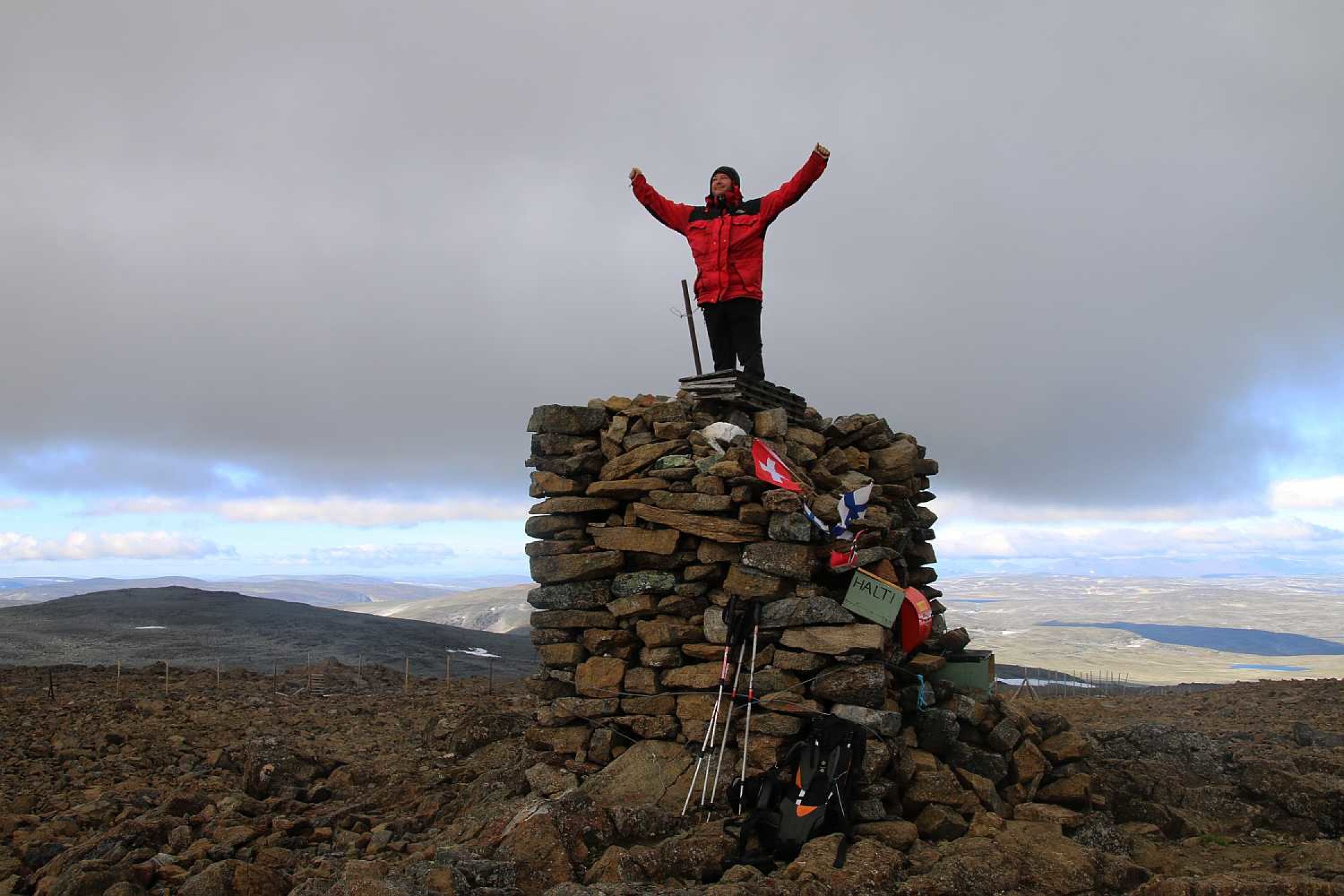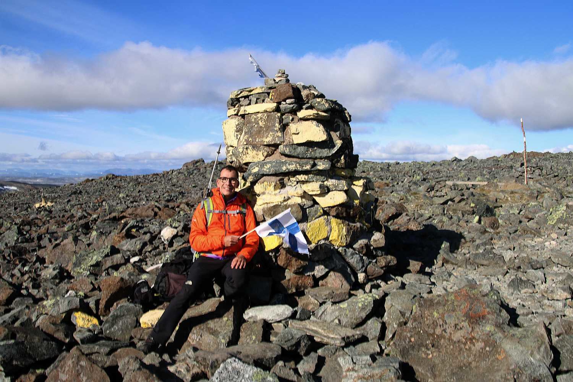 Vom Ráisduottarháldi war nun auch unser nächstes Ziel, der Haltitunturi, klar südwärts zu sehen. Zuerst überstiegen wird einen Weidezaun über eine Treppe und wanderten dann weglos, aber in gut begehbarem Gelände, in eine Senke mit einem kleinen Bergsee; dort füllten wir uns die Getränkeflaschen auf. Der Anstieg andernseits zum Haltitunturi war wieder mühsamer wegen der Grösse des Gerölls. Zum Gipfel hin wurde es immer flacher und wir waren zuerst nicht ganz sicher, welches der höchste Punkt ist. Etwa 200m davon entfernt sahen wir auch den Grenzstein Nummer 303B, das Hauptziel der Geröllwanderung und der Finnische Landeshöhepunkt. In der Nähe entdeckten wir auch den Vermessungspunkt P.1228m welcher oftmals auf Kartenwerken als Gipfelhöhe des Haltitunturis angegeben ist. Beim Grenzstein rasteten wir und trugen uns ins "ewige Gipfelbuch" als die Besucher mit den fortlaufenden Nummern 181517 und 181518 ein.