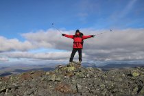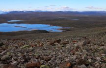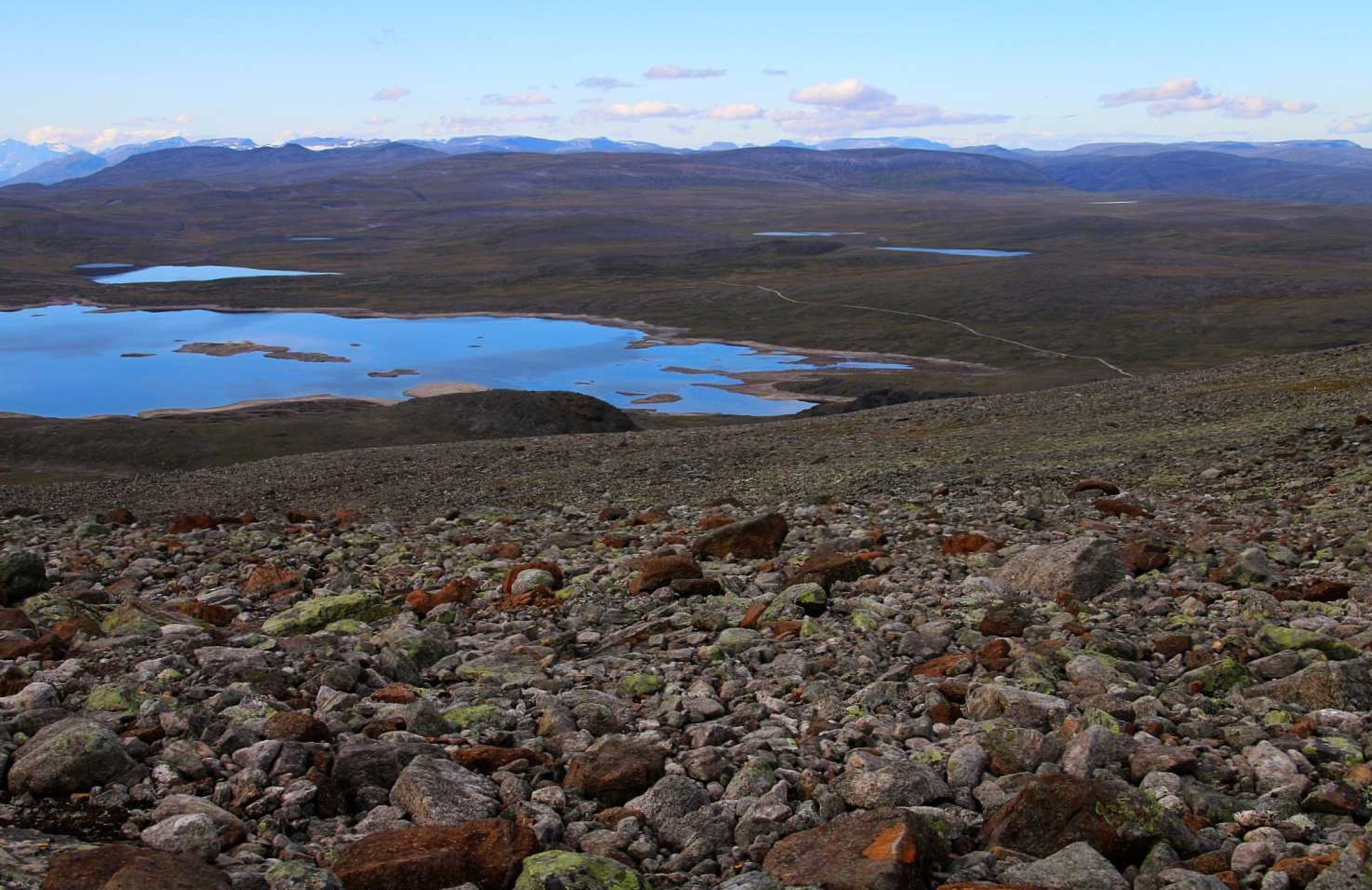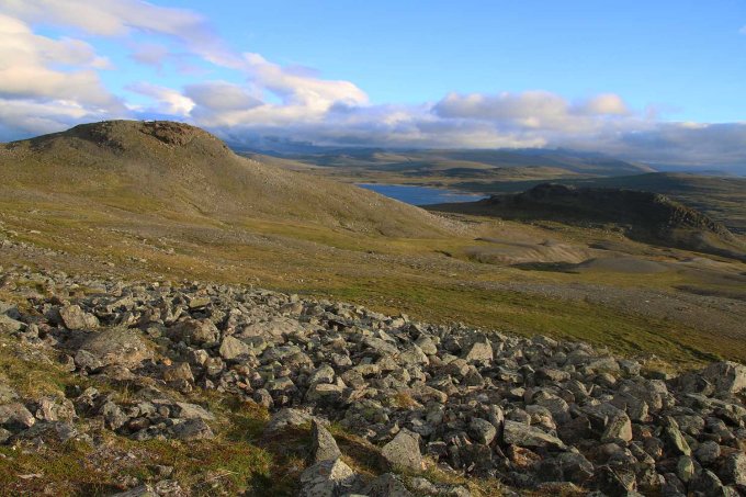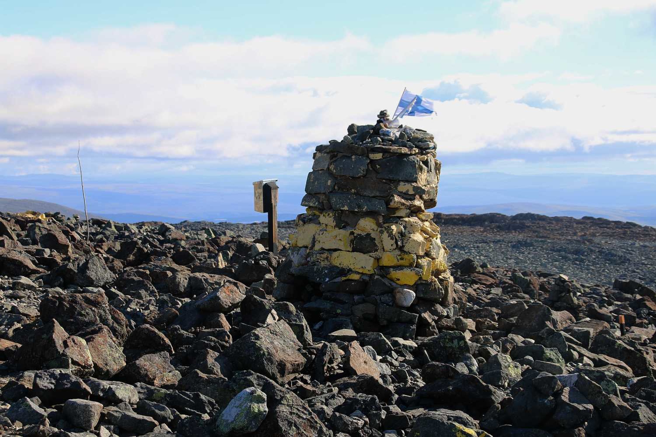 Vom Ráisduottarháldi war nun auch unser nächstes Ziel, der Haltitunturi, klar südwärts zu sehen. Zuerst überstiegen wird einen Weidezaun über eine Treppe und wanderten dann weglos, aber in gut begehbarem Gelände, in eine Senke mit einem kleinen Bergsee; dort füllten wir uns die Getränkeflaschen auf. Der Anstieg andernseits zum Haltitunturi war wieder mühsamer wegen der Grösse des Gerölls. Zum Gipfel hin wurde es immer flacher und wir waren zuerst nicht ganz sicher, welches der höchste Punkt ist. Etwa 200m davon entfernt sahen wir auch den Grenzstein Nummer 303B, das Hauptziel der Geröllwanderung und der Finnische Landeshöhepunkt. In der Nähe entdeckten wir auch den Vermessungspunkt P.1228m welcher oftmals auf Kartenwerken als Gipfelhöhe des Haltitunturis angegeben ist. Beim Grenzstein rasteten wir und trugen uns ins "ewige Gipfelbuch" als die Besucher mit den fortlaufenden Nummern 181517 und 181518 ein.