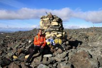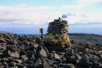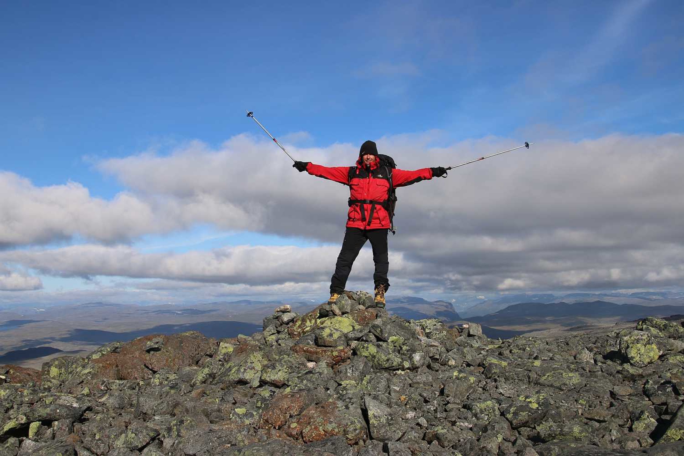 Die ersten 150 Höhenmeter verliefen noch gemütlich auf einem schönen Bergweg östlich der namenlosen Hügeln P.849m und P.900m. Hier begann ein steilerer Aufschwucng und wir faden und schon im Geröll. Der teilweise kaum sichtbare Weg war jedoch mit roten Punkten und kurzen roten Stangen markiert. Oberhalb des Aufschwungs erreichten wir einen Weidezaun wechem wir zunächst einige Zeit folgten. Der Untergrund war jetzt auch einfacher begehbar und der Weg dank den Markierungen und Steinmännchen klar erkennbar. Nach zirka einer Stunde standen wir allerdings in dichtem Nebel und fanden keine Markierungen mehr. Da versuchten wir möglichst die Höhe zu behalten und bestiegen dabei unwissend beim Suchen P.1312m. Dahinter trafen wir plötzlich wieder auf Markierungen und de Nebelbank begann sich aufzulösen. Als wir den riesigen Steinmann erkannten, wussten wir dass der erste Gipfel Ráisduottarháldi geschafft ist. Nun gab es die erste längere Rast und wir trugen uns ins schöne Gipfelbuch ein.