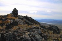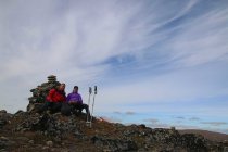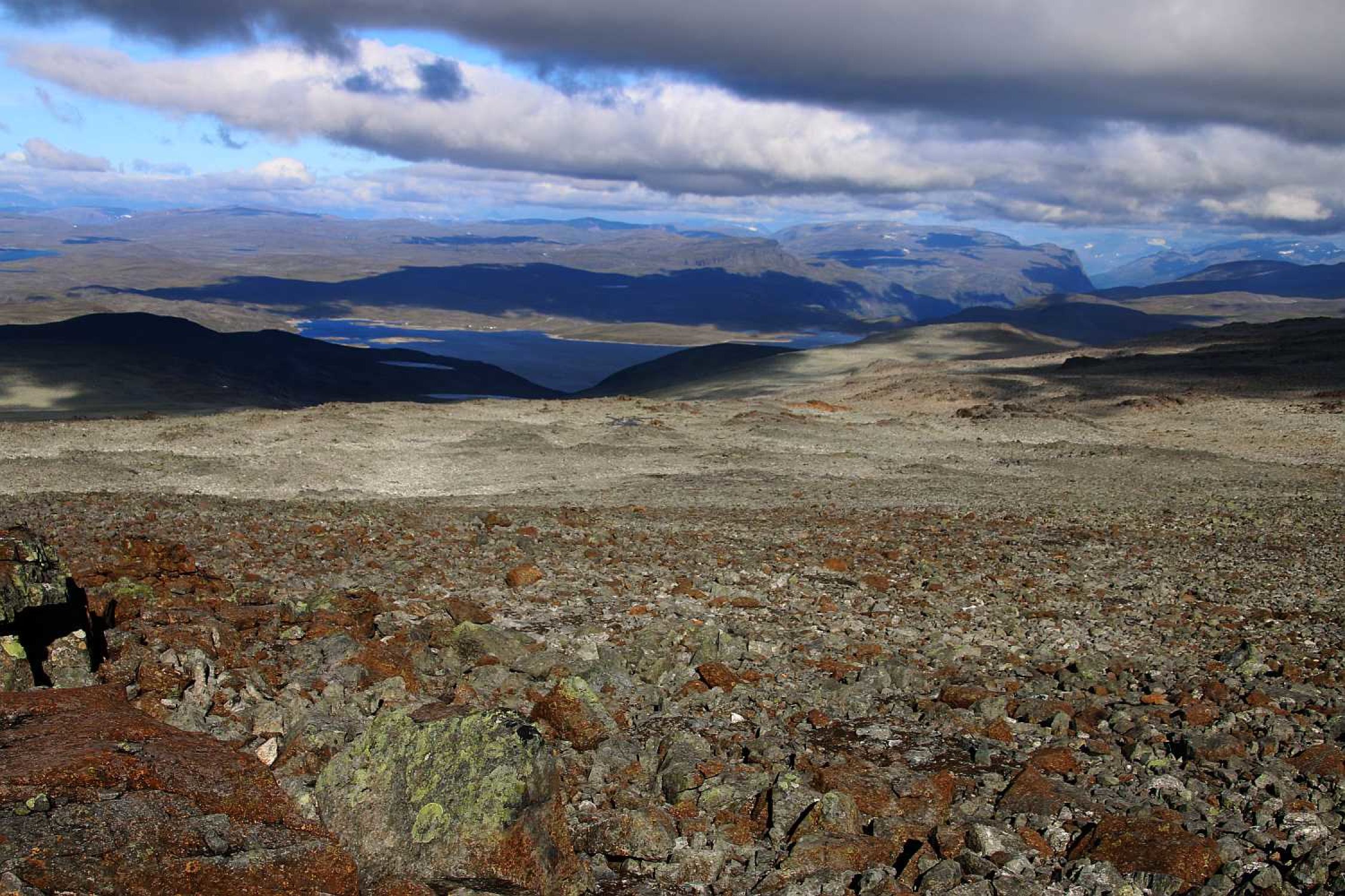 Nun stad mit dem Ridnitšohkka / Ritničohkka noch ein letzter Gipfel auf unserem Programm. Um möglichst wenig Höhe zu verlieren wollten wir den Gipfel in einem Bogen nach Nordosten vorbei am See P. 1128,5m besteigen. Dies war leider eine Fehlentscheidung wie wir später bemerkten und stolpertern dehalb zwei Stunden lang durch übelstes Geröllgelände zum besagten Gipfel. Dort war natürlich wieder eine Gipfelrast angesagt. Für den Rückweg wählten wir praktisch die Luftlinie zum Haltitunturi. Der Abstieg in die Talsenke zwischen den Gipfeln war bequem ohne mühsame Geröllfelder. Auch der Wiederaufstieg zum Grenzstein über rötliche Fels- und Schutthänge war klar bequemer. Den Grenzstein erreichten wir schlussendlich zuletzt auf dem finnischen Bergweg.