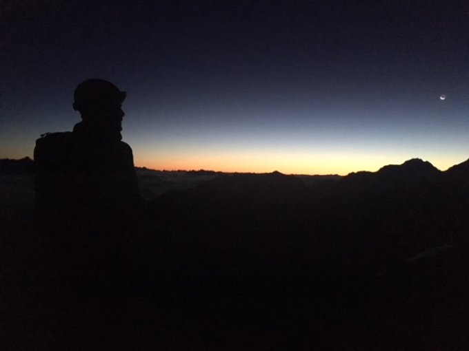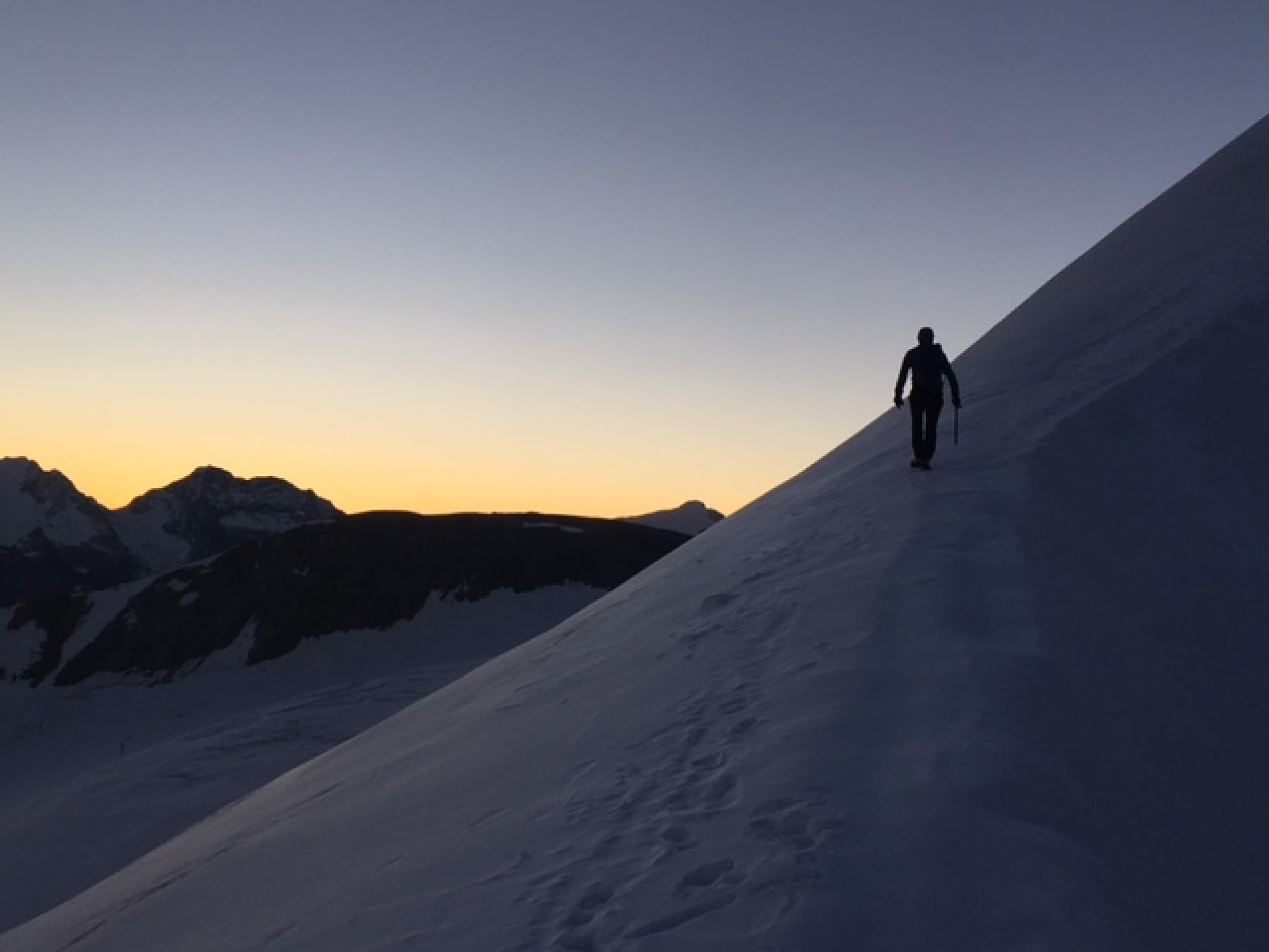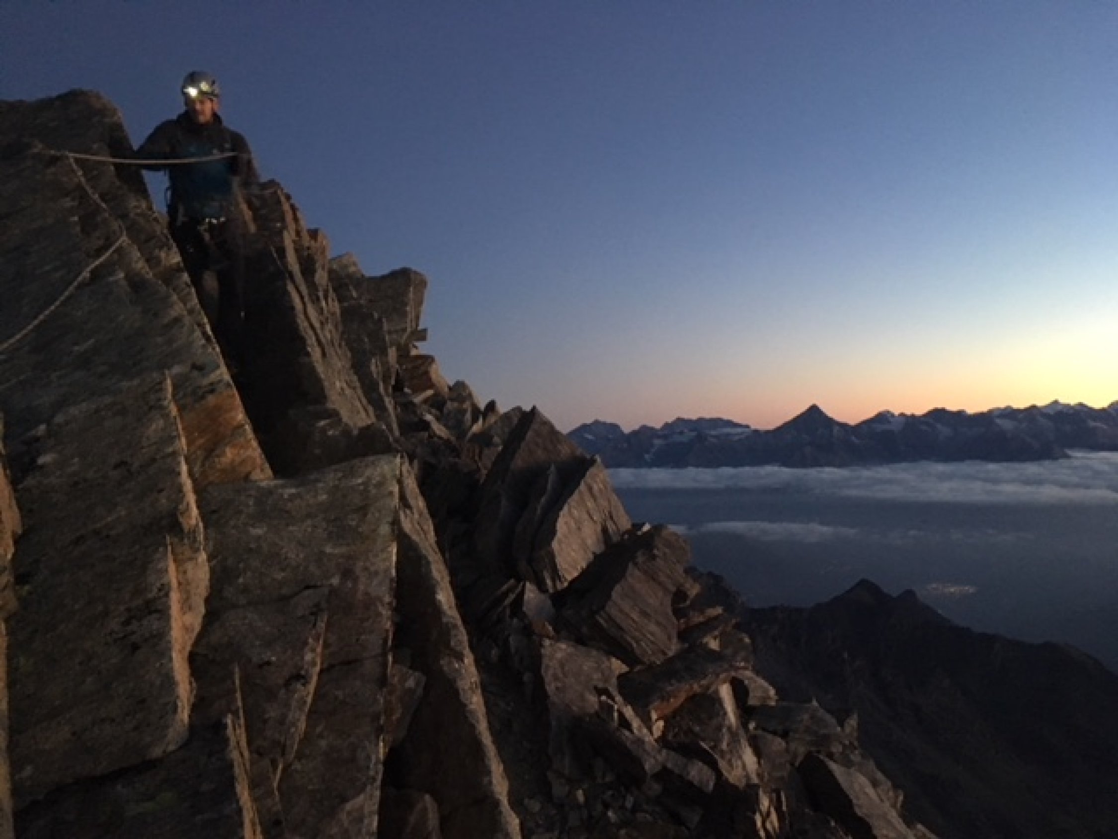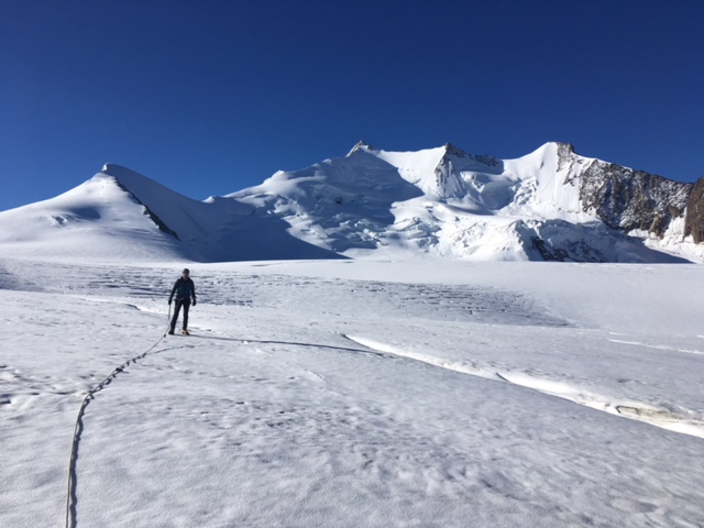 Ab Huette 04h10, Ankunft Gross Bigerhorn etwa 6Uhr noch Dunkel. Anstieg ueber Sattel 3146m und bis Gross Bigerhorn alles Wegspuren Geroell und grossen Bloecke. Geht gut im Dunkel. Vom Gipfel super Rundsicht. Nach Gipfel einige schoene Kletterpassagen. Weiterweg ueber Sattel 3594m einfach. Wir brauchten Steigeisen und Pickel den Balfrin hinauf wegen duenne Schneeauflage auf Eis. Ueberschreitung unschwierig aber Landschaftlich so schoen! Abstieg vom Balfrin wenige Kletterstellen, sonst wegspuren bis Sattel unter punkt 3644m wo man auf den Gletscher umstellt. Bei 3500m wenige Spalten und groessere Spaltenzone auf 3350m wobei nicht zu nahe auf den Balfrin Felsen haellt aber eher westlich. Wir machten enige Umwegen durch Spalten Labyrith; geht aber gut/einfach.