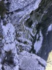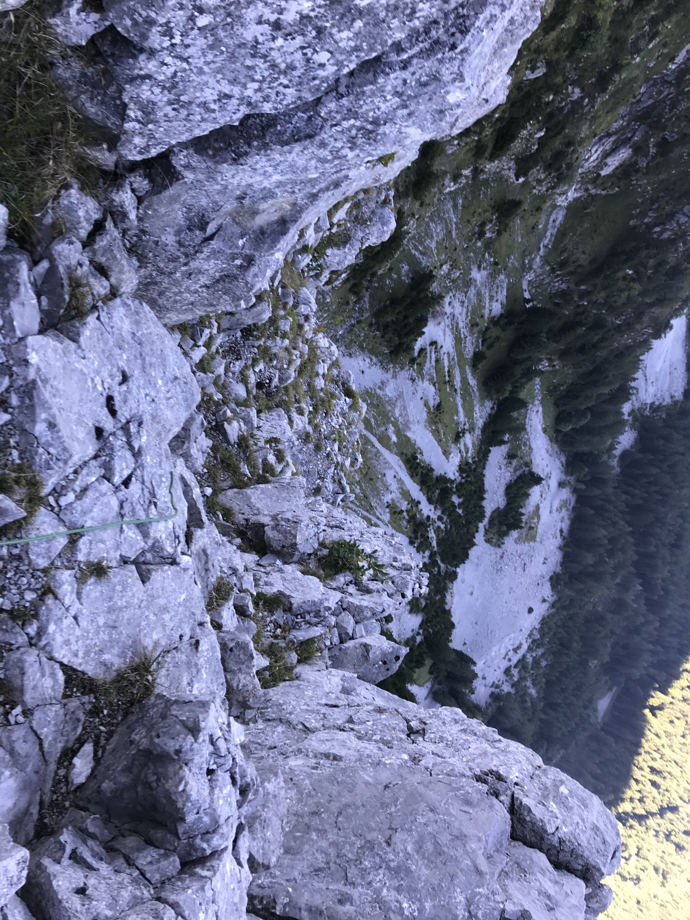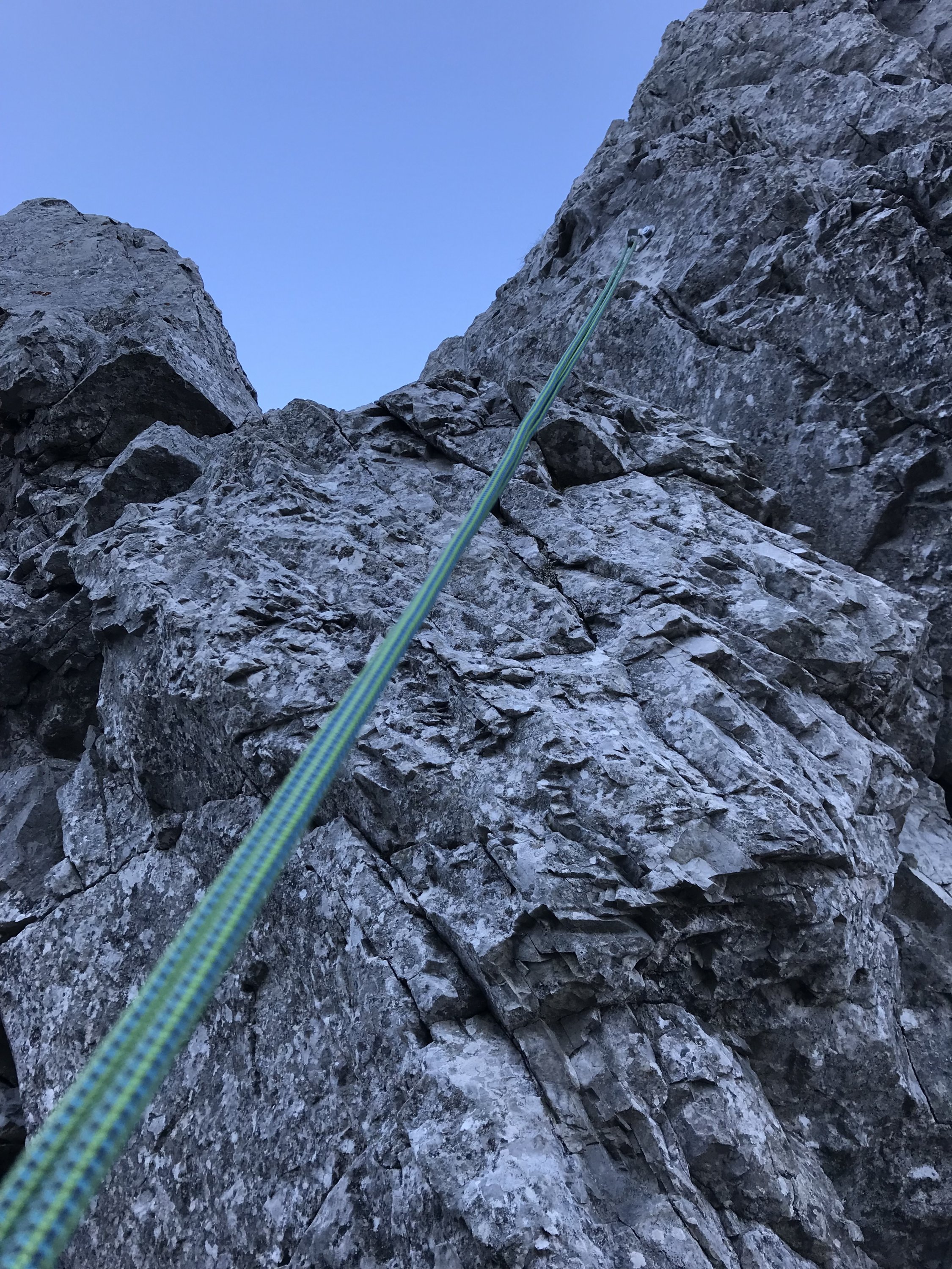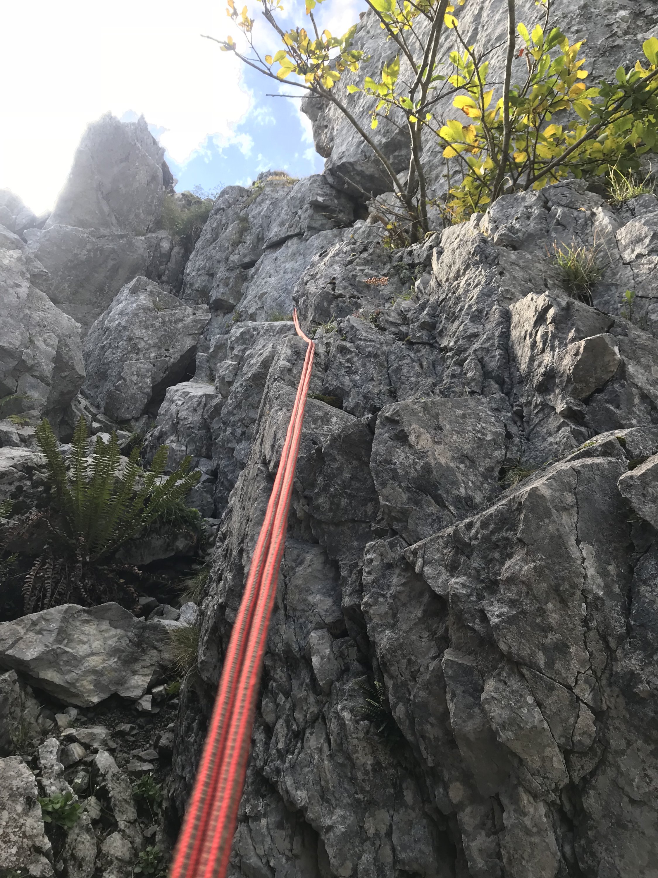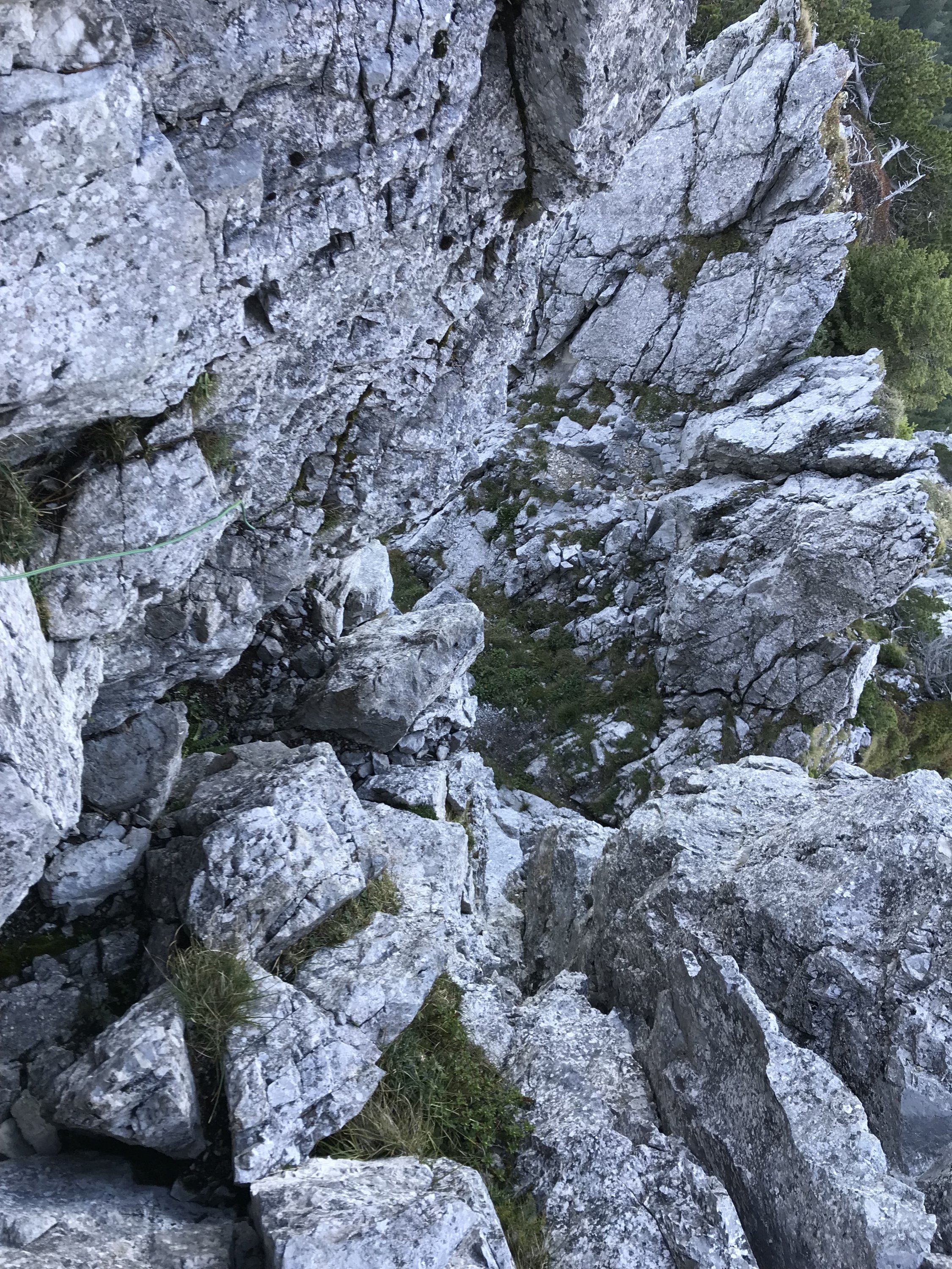 Am Ende des Wanderweges ist eine ausgesetzt Traversierung nach links. Ich sicherte mich selbst an dem Bohrhaken und zog das Seil durch als ich wieder gute Tritte unter mir hatte. Im Anschluss an die Traversierung ist ein Felscouloir, das aber griffigee Steine und gute Griffe hat.
