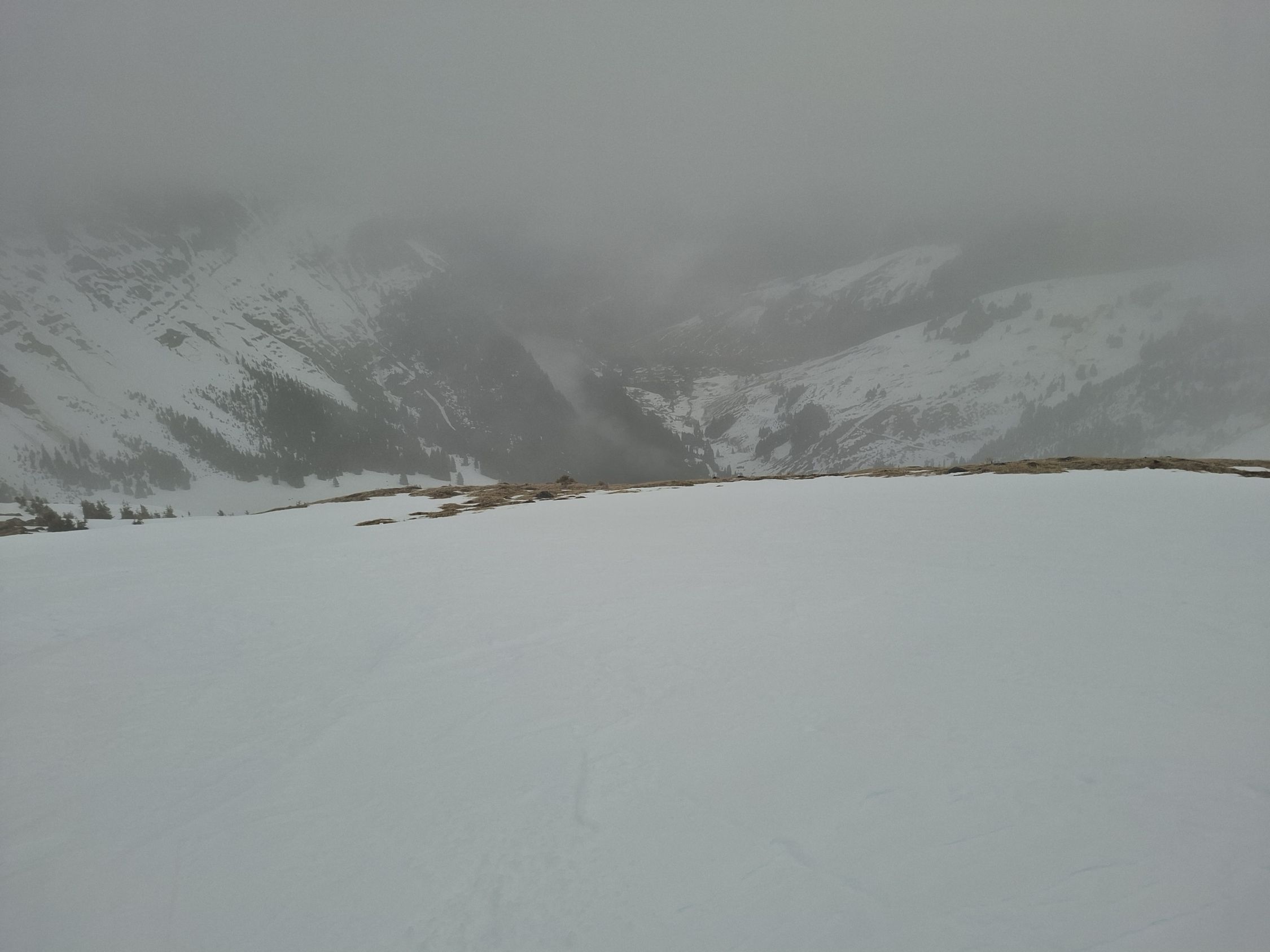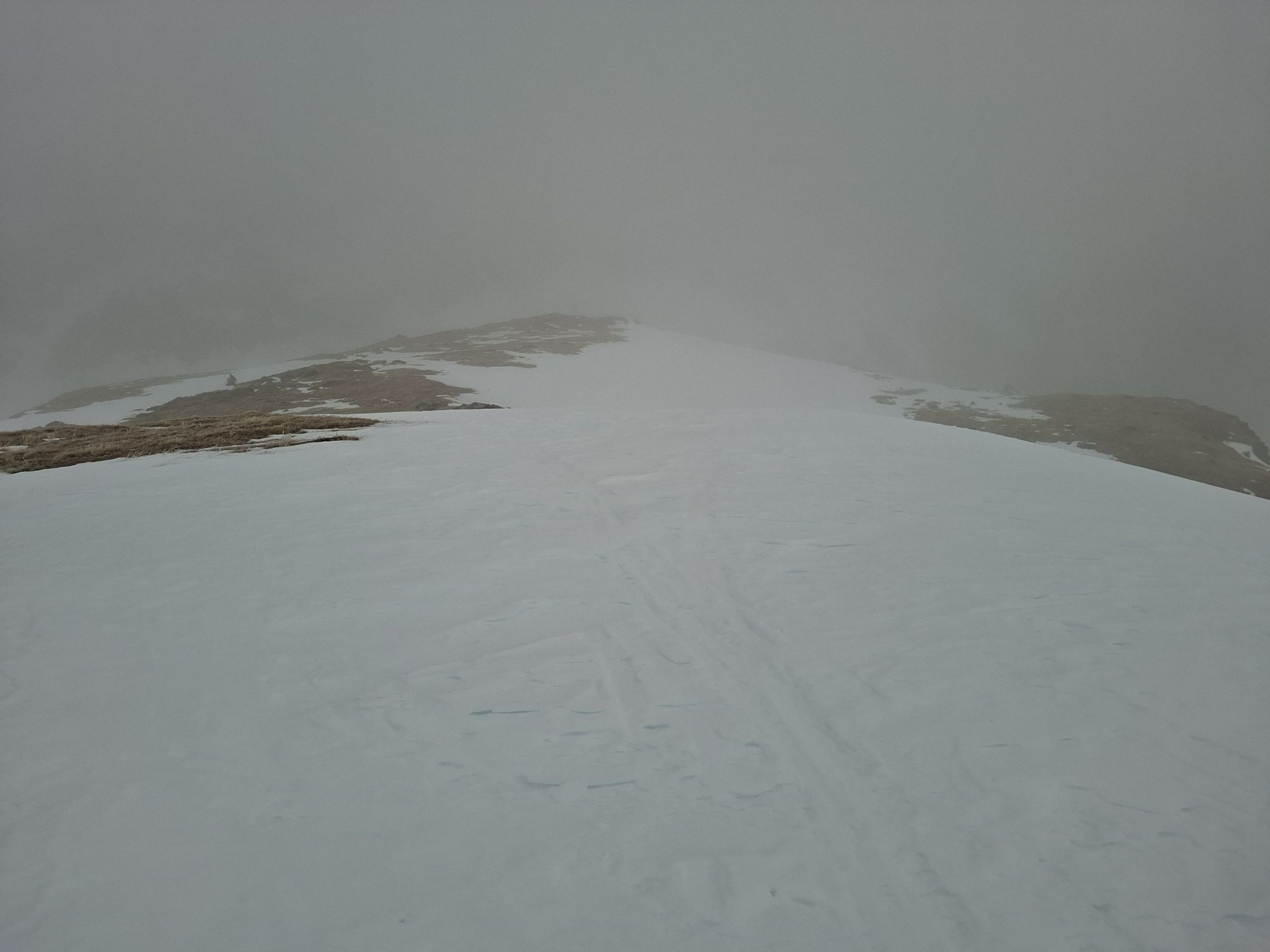 Start um 7 Uhr bei zwei Grad. Bis kurz vor dem loslaufen noch leichter Nieselregen. Route noch knapp durchgehend auf Schnee, die Würzistrasse apert aber rasch aus. Schnee unten nass, oben hart. Im Gipfelbereich dichter Nebel.