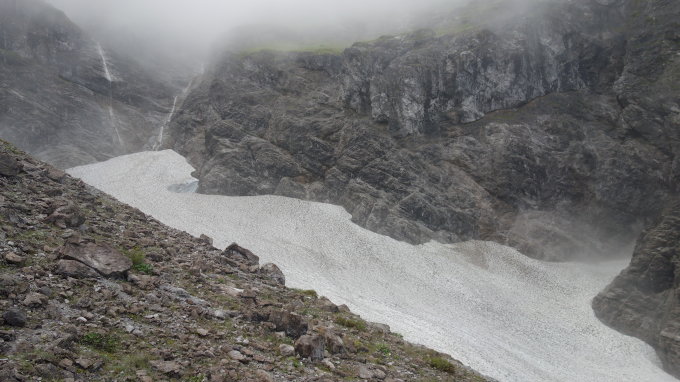 Vor dem Einstieg sollte man sich bei den vielen Wegverzweigungen eher rechts halten. Wenn man an zwei Gedenktafeln vorbeikommt ist man richtig. Dann von rechts (links oberhalb Eiskapelle) nach links hinauf und wieder nach rechts ausholend auf deutlichem Weg ins Schuttkar (Stellen II). Dort gibt es einen Bach. Am rechten oberen Rand gehts in den Fels, wo die leichte 2er Kletterei beginnt. Hin und wieder hat es hier schon BH. Recht bald gelangt man auch schon zu der plattigen 3er SL. Dort haben wir gesichert, da die Steine um uns herumpfiffen und im Nebel die Moral etwas in den Keller ging. Nach dieser Länge wieder seilfrei weiter.