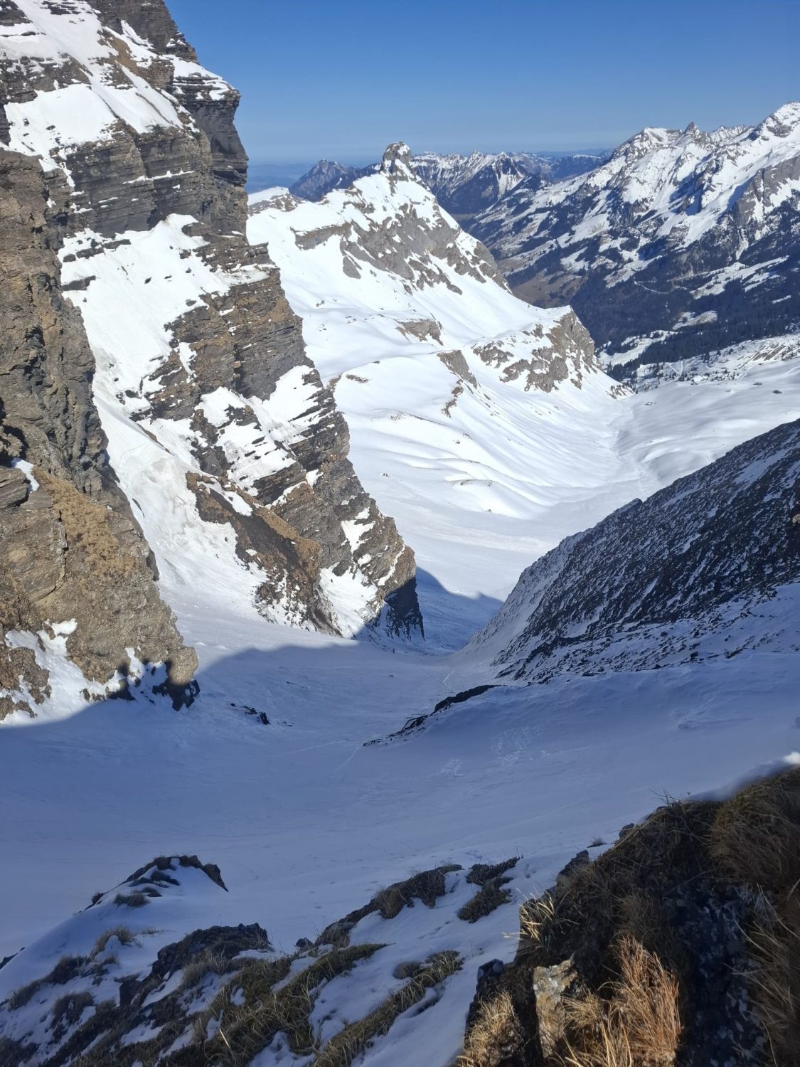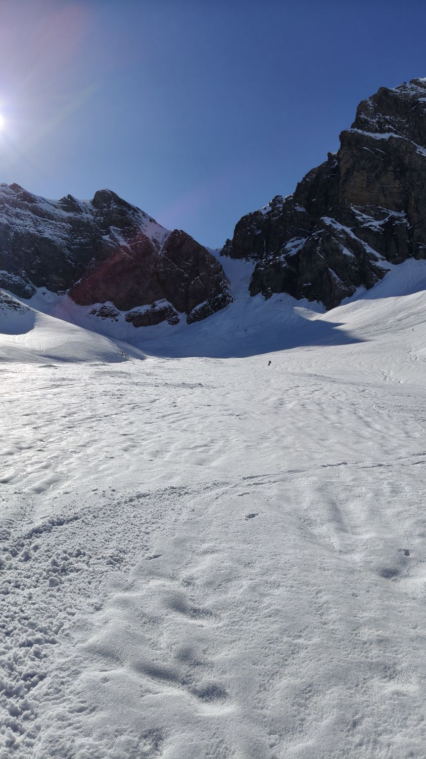 Gestartet um die Mittagszeit. Südhänge im "Melchen" sehr weich. Im "Wit Ris" sind bereits einige Lawinen abgegangen. Es hat nicht viel Schnee. Viele lose Steine im unteren Teil. Abfahrt ca. um 13 Uhr. Ganzes Couloir war noch hart gefroren. Konnte super gefahren werden.