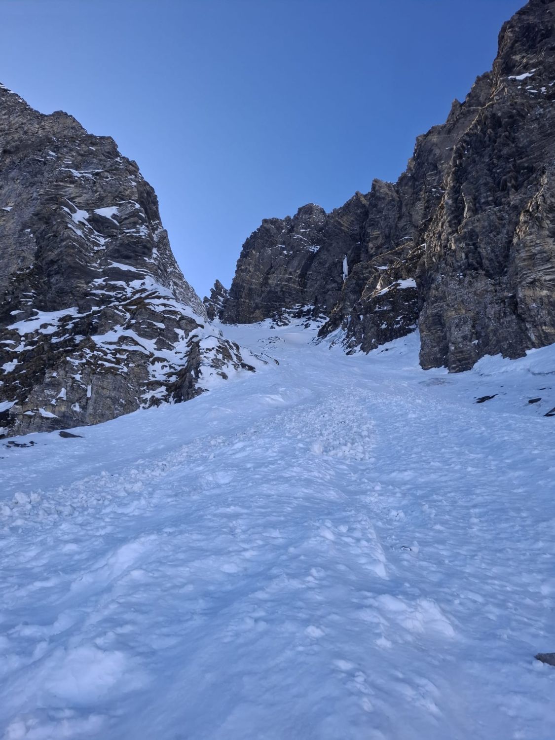 Das Couloir liegt knapp noch im Schatten. Die Situation bleibt etwa gleich. Mit den anhaltend warmen Temperaturen und steigendem Sonnenwinkel kann der Schnee aufweichen.