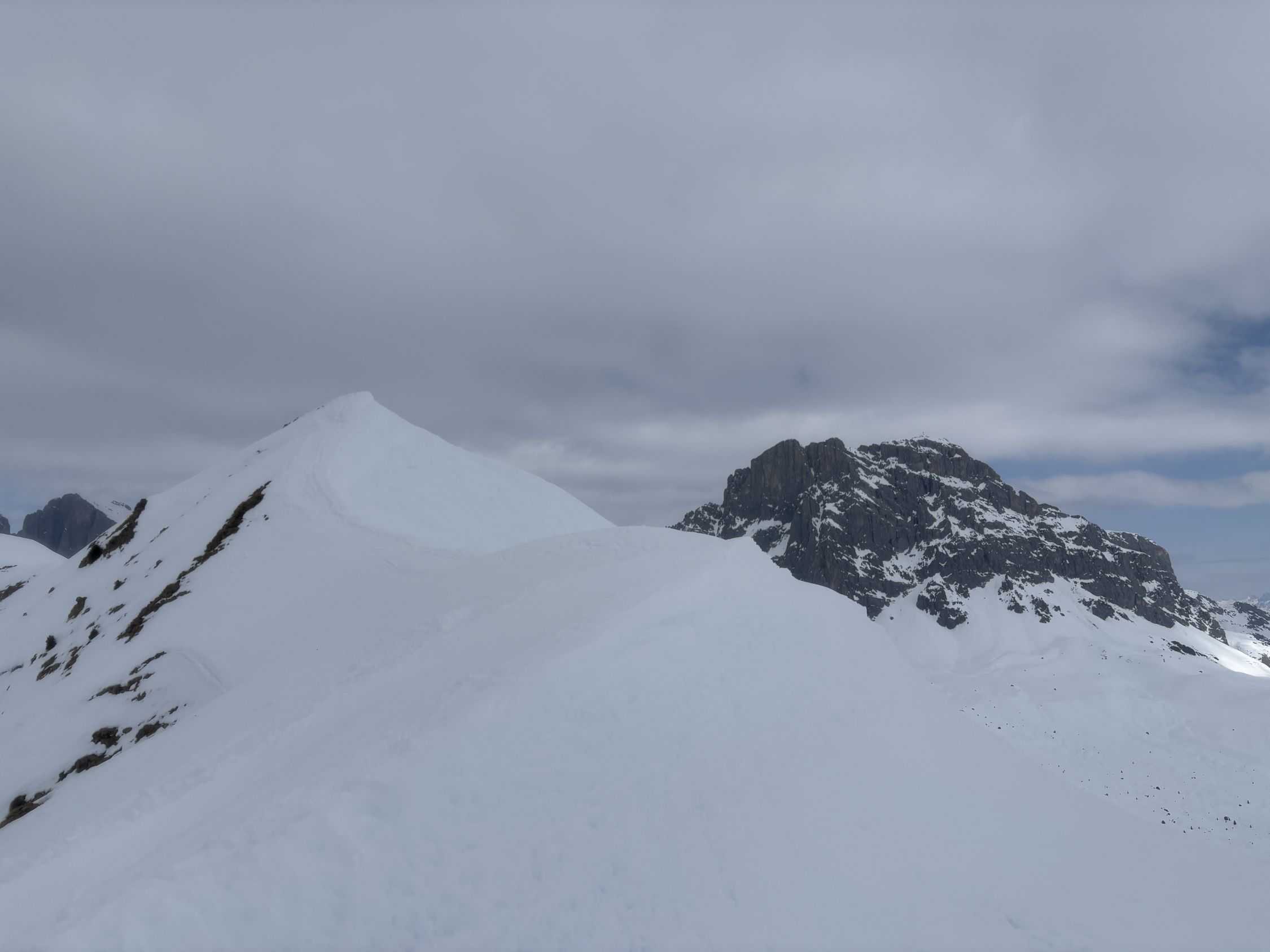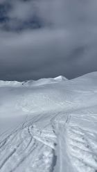 Ein Gut gibt es, da gute Schneeauflage ab Parkplatz und theoretisch noch gut Platz für schöne Linien. Allerdings war der Schnee in der (späten) Abfahrt gegen Mittag zuerst Bruchharsch, dann sehr nasser schwerer Tiefschnee. Etwas kälter oder besser aufgesulzt, und die Abfahrt hätte ein Vergnügen sein können.
