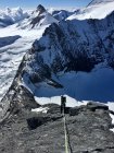 Tag 2: Mittellegi - Eiger - Jungfraujoch. Ab Grosser Turm mit Steigeisen geklettert. Da wo es keine Taue gibt, ist die Sicherung spärlich und III zwingend. Abstieg S-Grat mit Abseilstellen eingerichtet. Die Traverse der Eiger-Jöcher im festen Gneis ist dann das krönende Finale. Bei der Querung auf dem Gletscher vom Südlichen Eigerjoch zum Mönchsjoch Spaltengefahr beachten, nicht jede Spur ist sicher angelegt.
