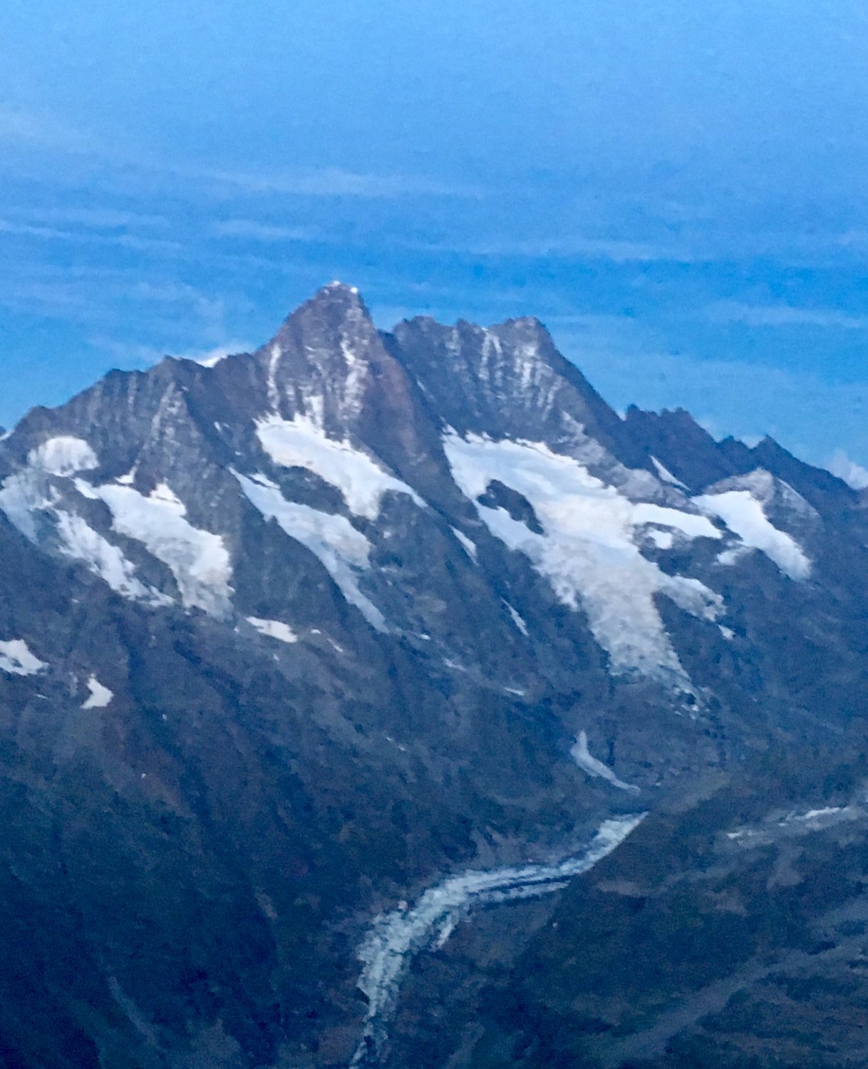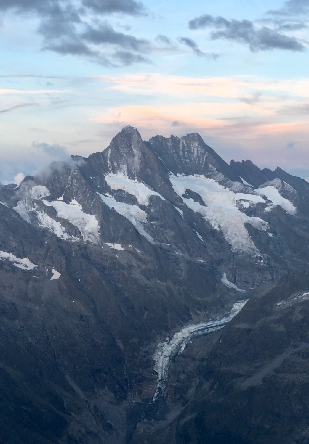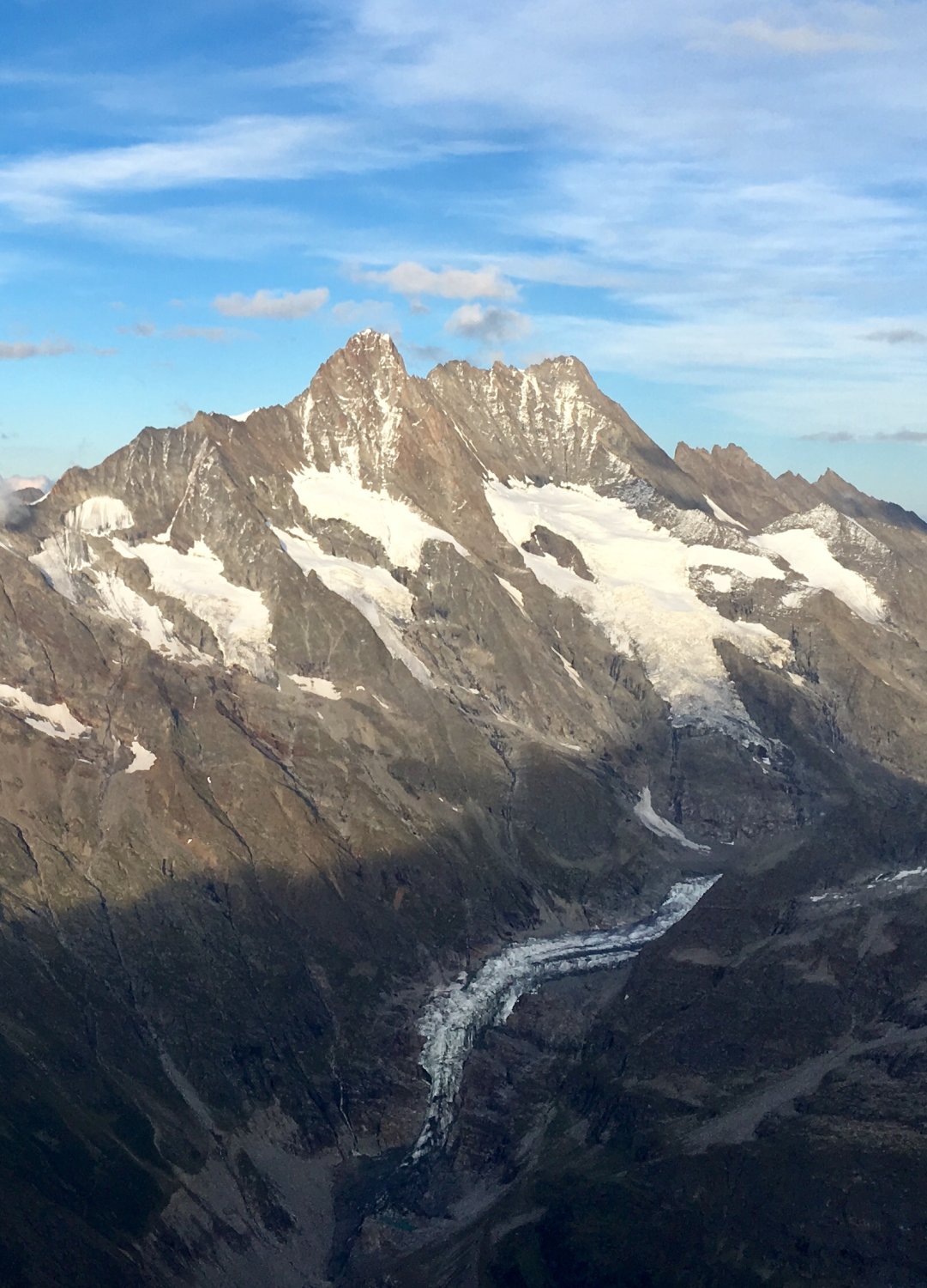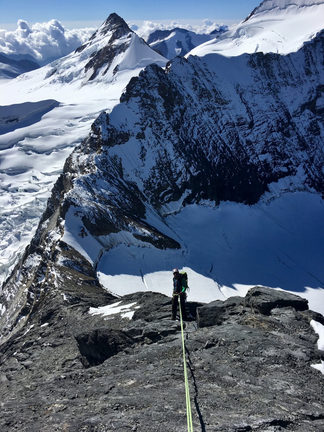 Mittellegi - Eiger - Jungfraujoch: Mittellegi-Grat ab grosser Turm mit Firn und teils Eis-Glasur, Steigeisen erforderlich. Abstieg Sud-Grat trocken. Eigerjöcher-Traverse schönes Ambiente in festem Gneis und Mixed-Kletterei. 6h + 0.5h Stau + 0.5h Pause.