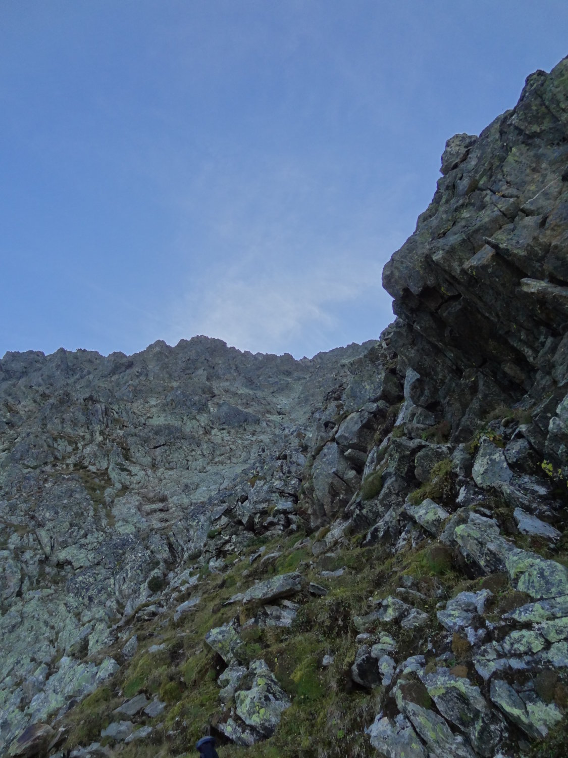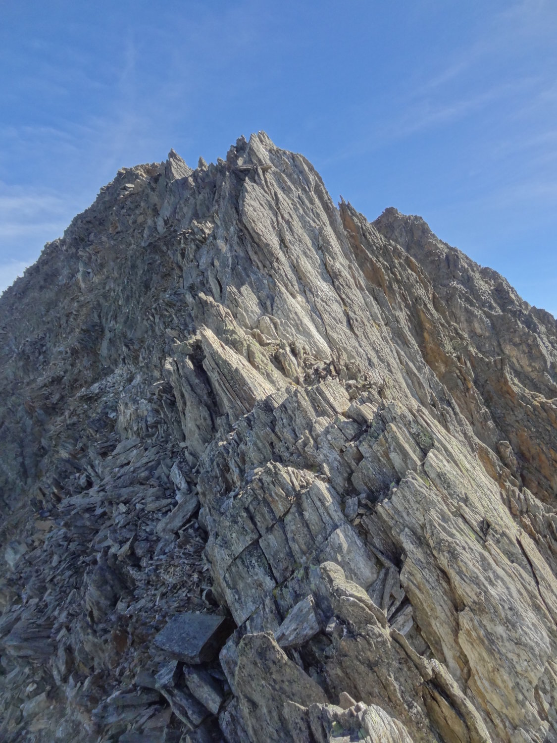 Die Felsen im oberen Gratteil sind oft etwas brüchig, wenn man die Route etwas vorausschauend plant, kann man sich jedoch meistens an das meist feste Gestein halten - alles im grünen Bereich also.