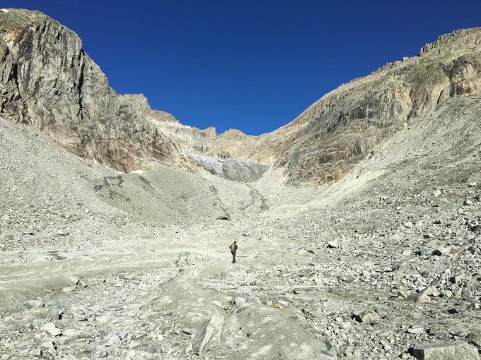 Immer wieder Steinschlag im mittleren Bereich des Bächligletschers. Für Abstieg nicht zu empfehlen.