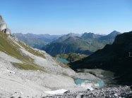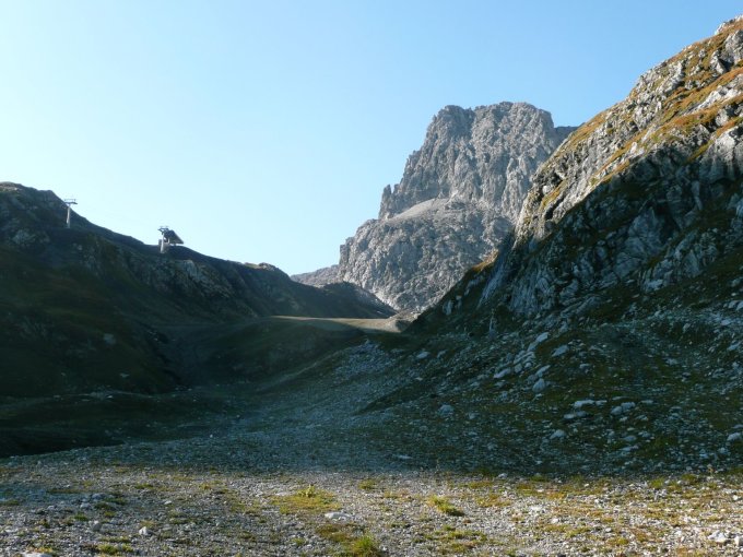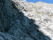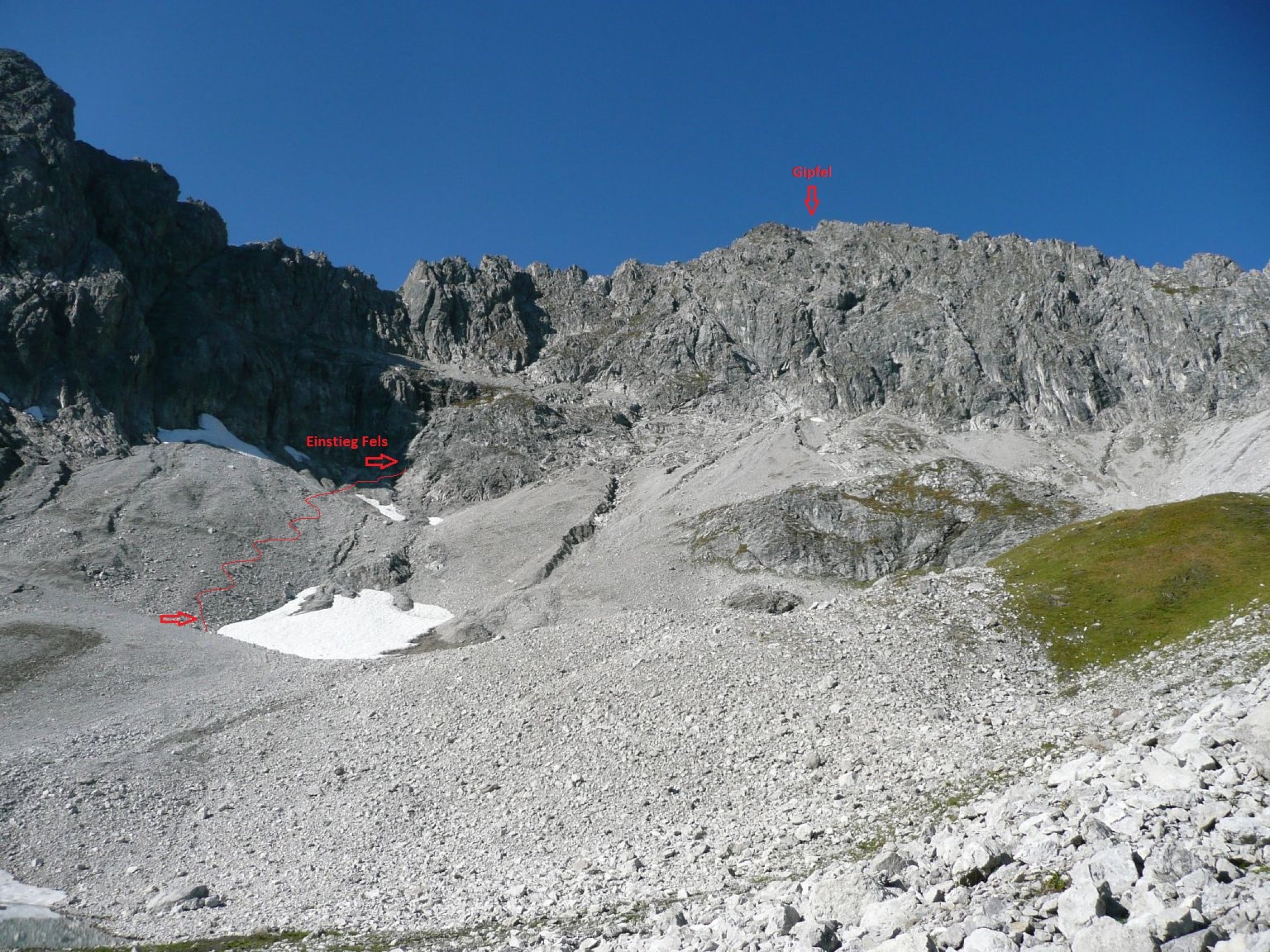 Ergänzung zur Route: am Zürser See den Bach überqueren (Steg) und auf dem Pistenhang rechts hoch bis man auf der wiederum rechten Seite ein Pfad ausmachen kann. Diesen bis zum oberen Seelein weiter, dann im Geröll hoch auf die breite Piste, die von der Gipfelstation links herunterkommt. Hier auch Steinmänner, die den Einstieg zu einem Zickzack-Pfad durch das Kar bis zum Einstieg im Fels (Bild) markieren. Die alte Wackelleiter im unteren Teil wurde inzwischen durch ein neues Seil und Krampen ersetzt, so dass der erste Aufschwung unschwierig, ggf. mit KS-Set, erstiegen werden kann. Im weiteren Verlauf immer noch die dünnen Stahlseile, die aber zusammen mit den blau-weißen Markierungen zumindest den Weg gut erkennbar machen.