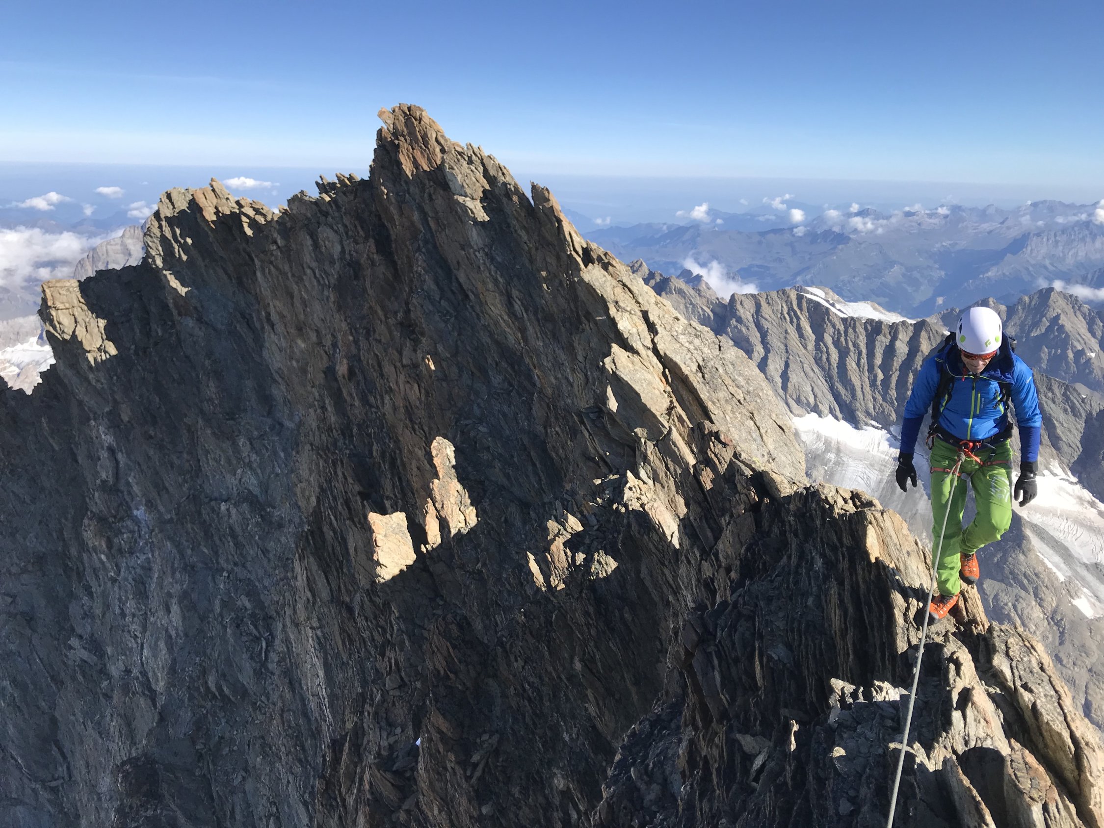 Insgesamt Super Verhältnisse. Die Moräne von ab dem Ober Ischmeer Gletscher Richtung Gaagg ist neuerdings mit vielen Reflektoren versehen, was die nächtliche Orientierung erleichtert. Auch hat es inzwischen eine gute Wegspur durch die lose Moräne. Der Gletscher ab Gaagg war angenehm zu begehen und auch der Bergschrund war beim linken (neuen) Einstieg in die Südwand völlig problemlos zu überwinden. Grosse Vorsicht ist bei mehreren Seilschaften in der neuen Einstiegsvariante geboten, denn es hat noch einiges an Geröll auf den Bändern und man klettert einige Zeit in der Falllinie.