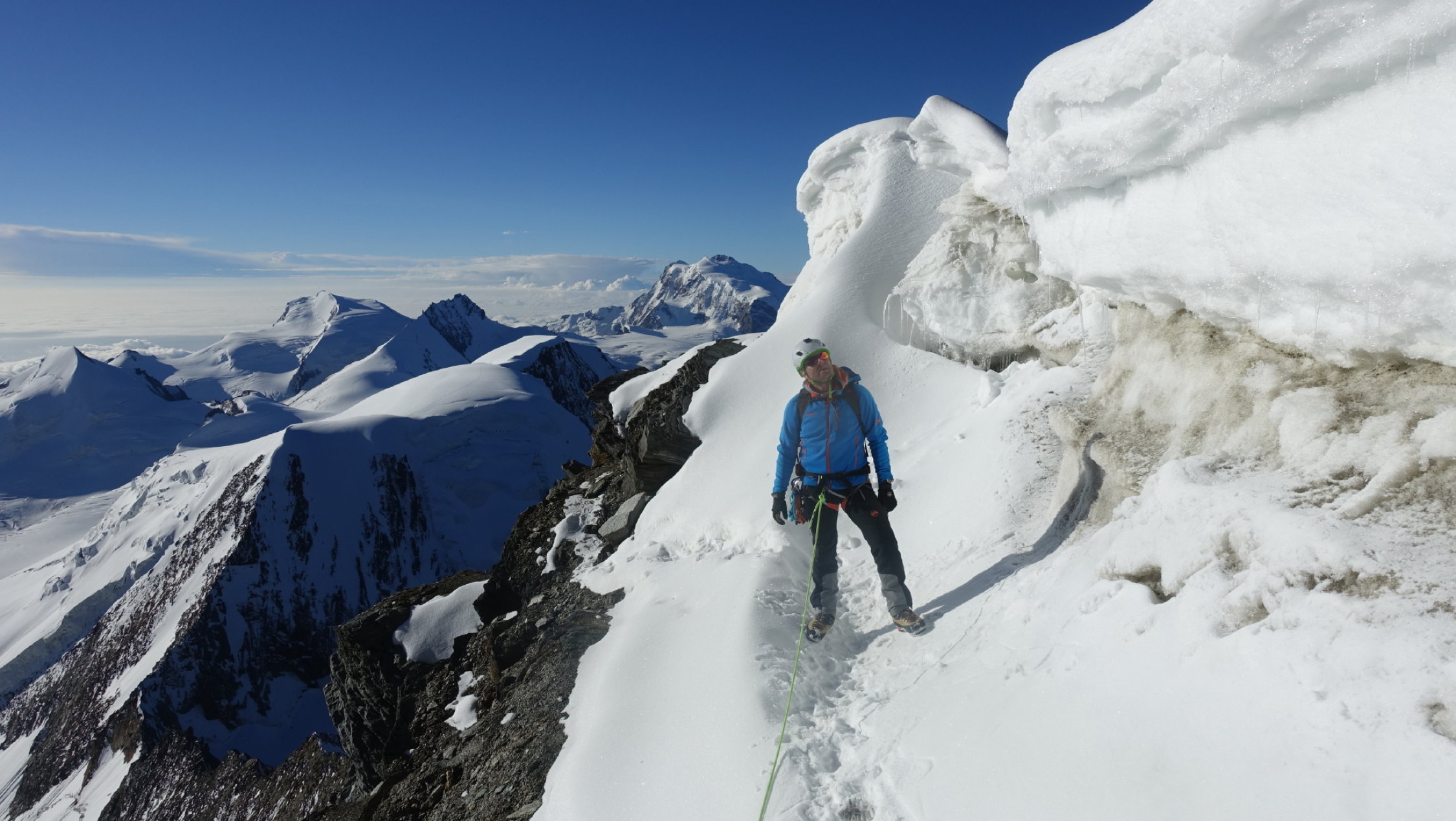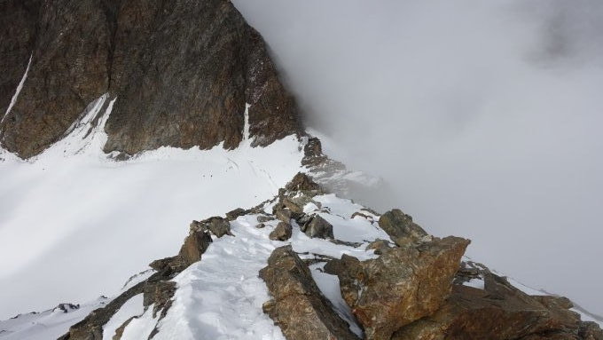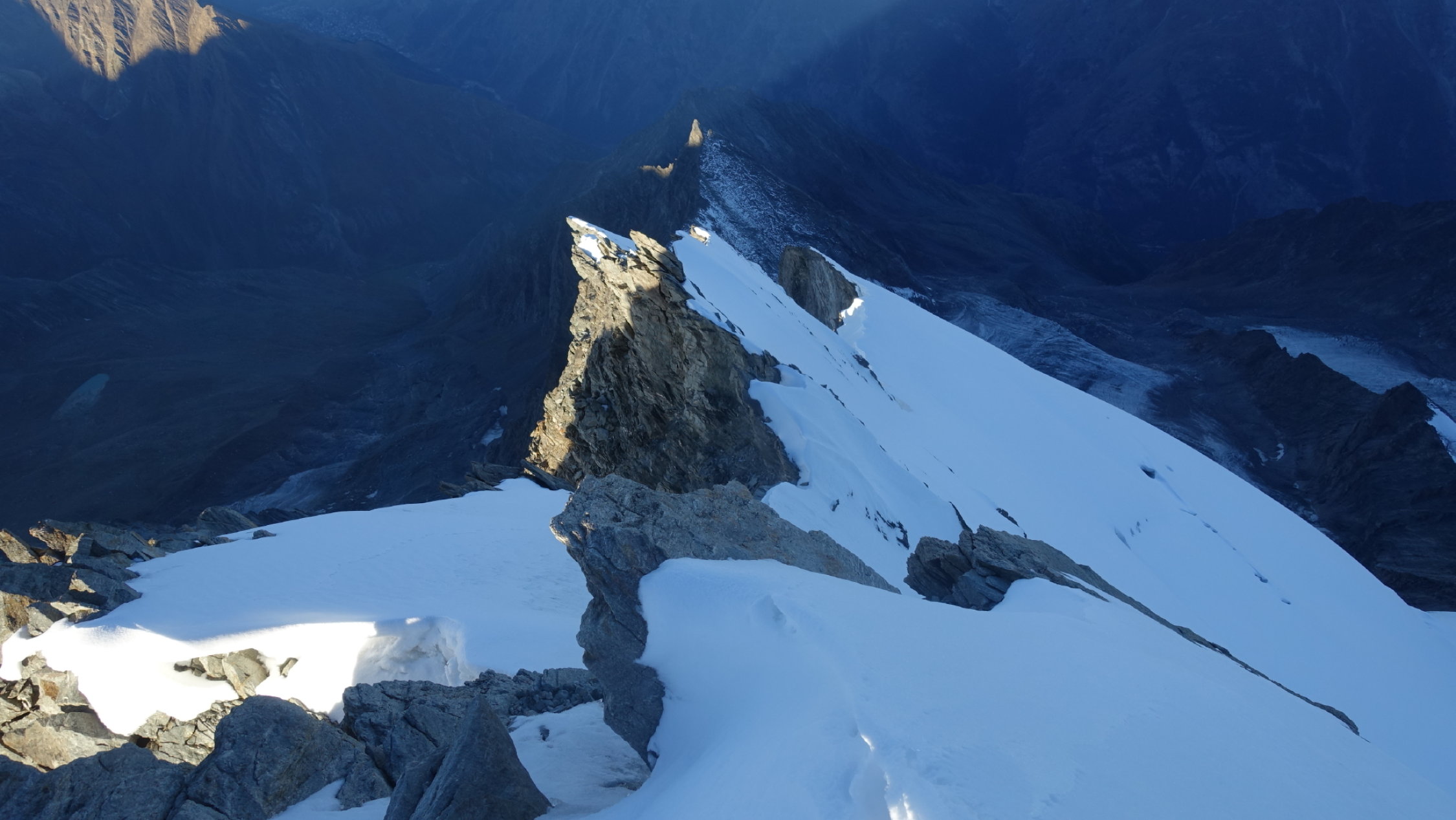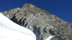 Wir sind am Vortag ab Mittelallalin via Feechopf und Alphubel (via Eisnase) zum Mischabeljochbiwak zugestiegen. Auch auf dieser Route noch sehr gute Verhältnisse. Die Eisnase geht noch gut, hat aber natürlich saisonbedingt nicht mehr super Trittschneeverhältnisse.