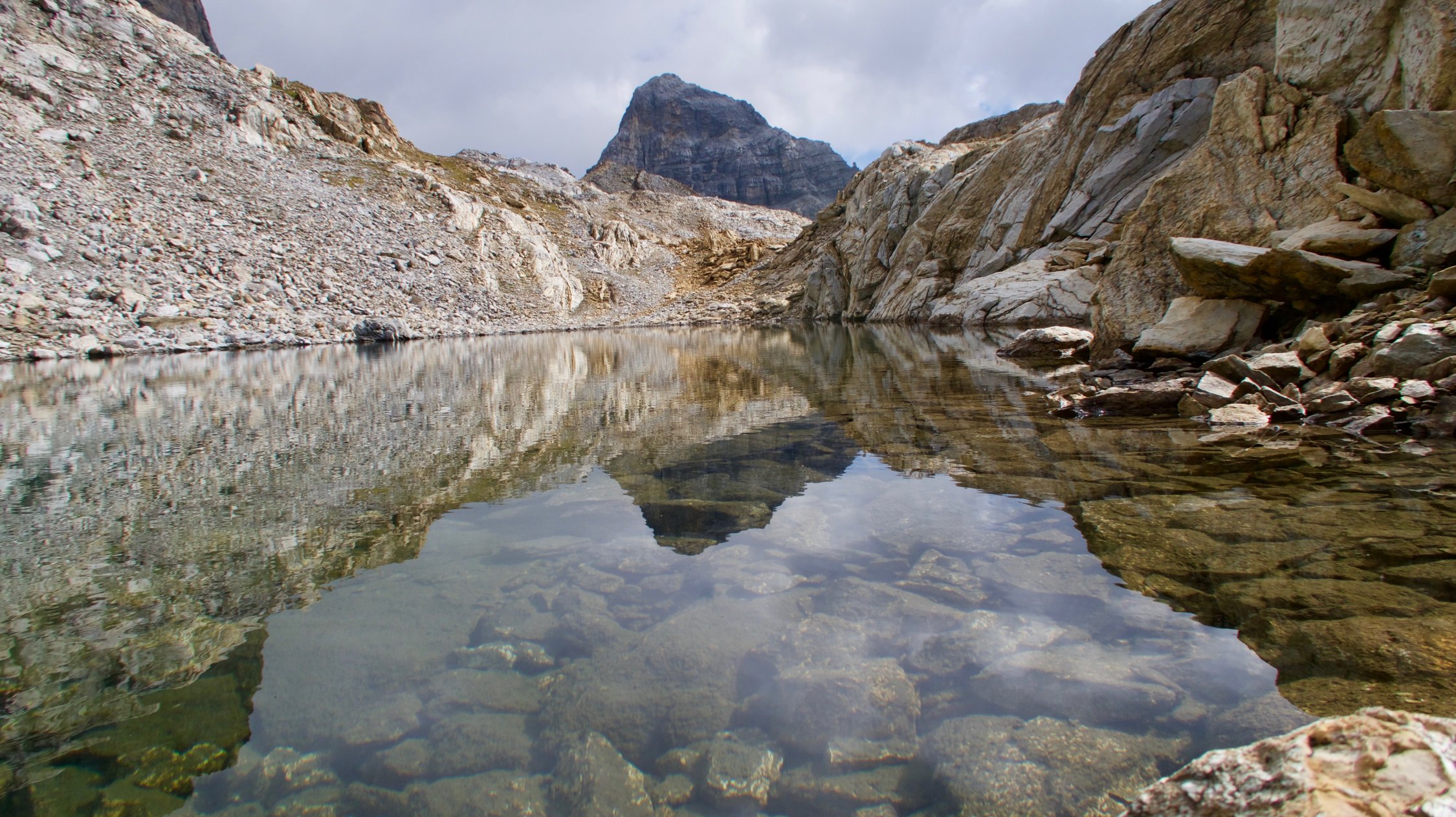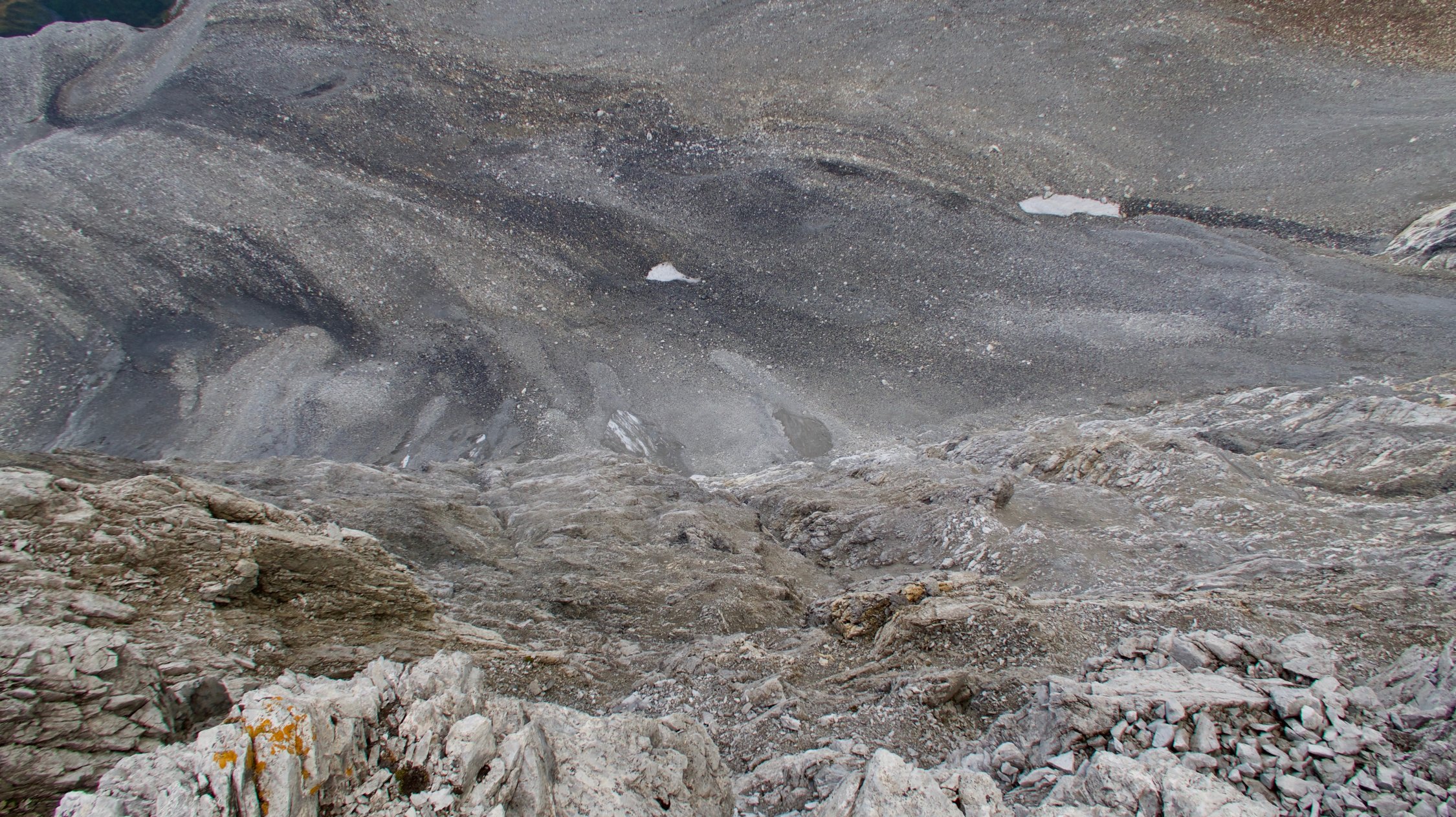 Nach dem Grat habe ich noch einen kurzen Abstecher in die Teurilücke gemacht und bin den ersten Teil des Anstiegs zum Steilerhorn hoch. Dort daselbe wie überall in den Splügner Kalkbergen, extrem brüchig und hier auch noch äusserst steil. Infolge fortgeschrittener Tageszeit habe ich auf dem Grat in 2900 M.ü.M. gekehrt, nachdem ich mich nicht getraut habe, einen grossen Block zu überklettern, da dieser über angerissen war und sehr labil aussah. Ich fand aber eine andere Anstiegslinie, welche über eine weisse Platte raufgeht. Aber dies ist ein anderes Projekt für die nächsten Jahre, vielleicht...