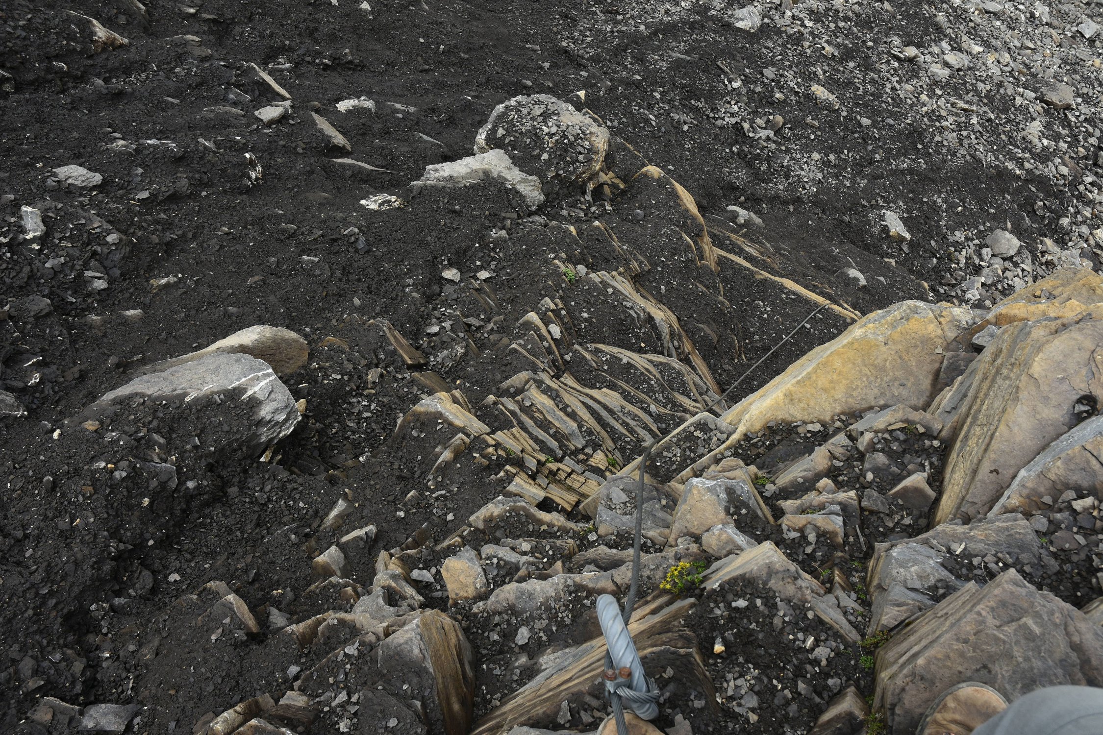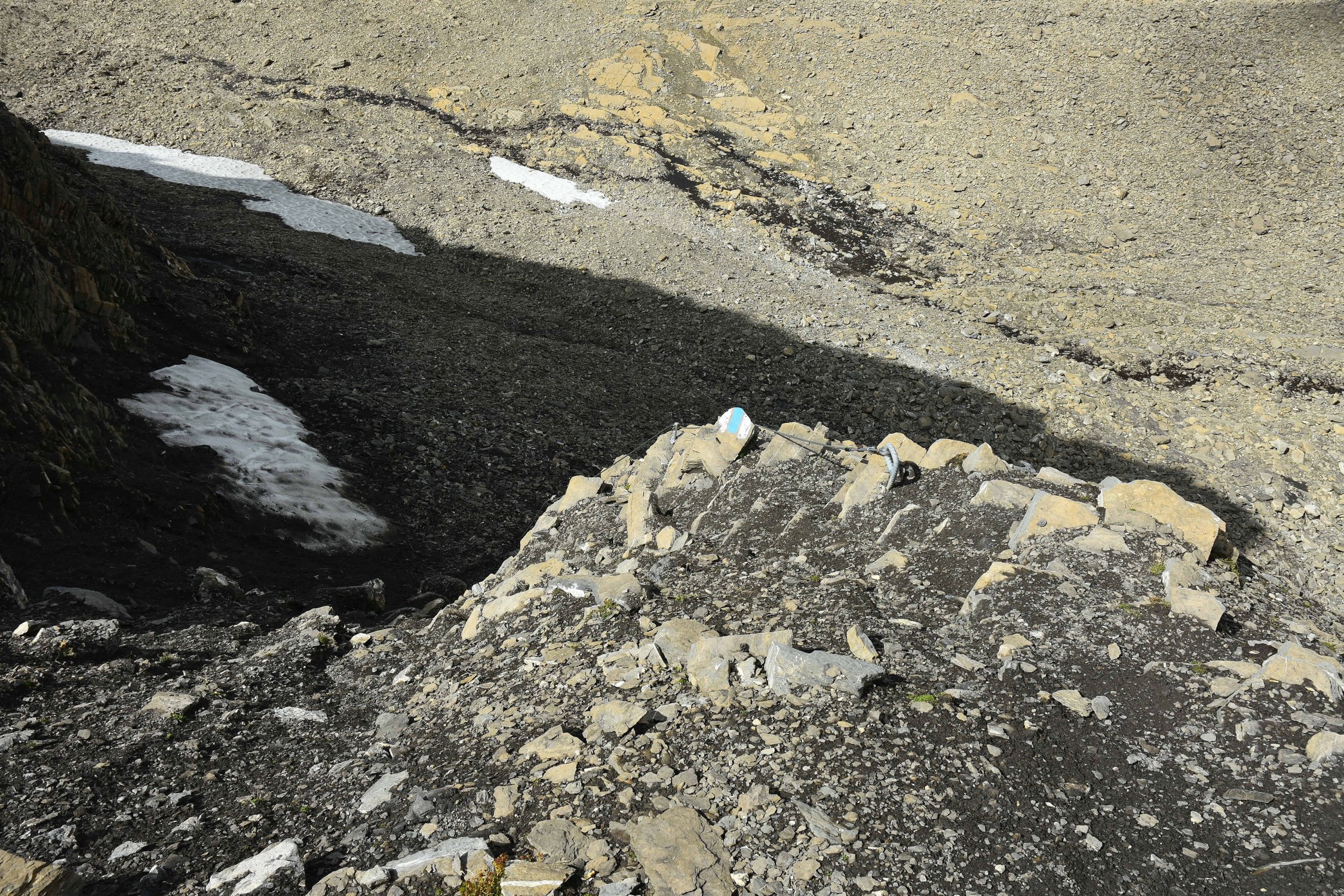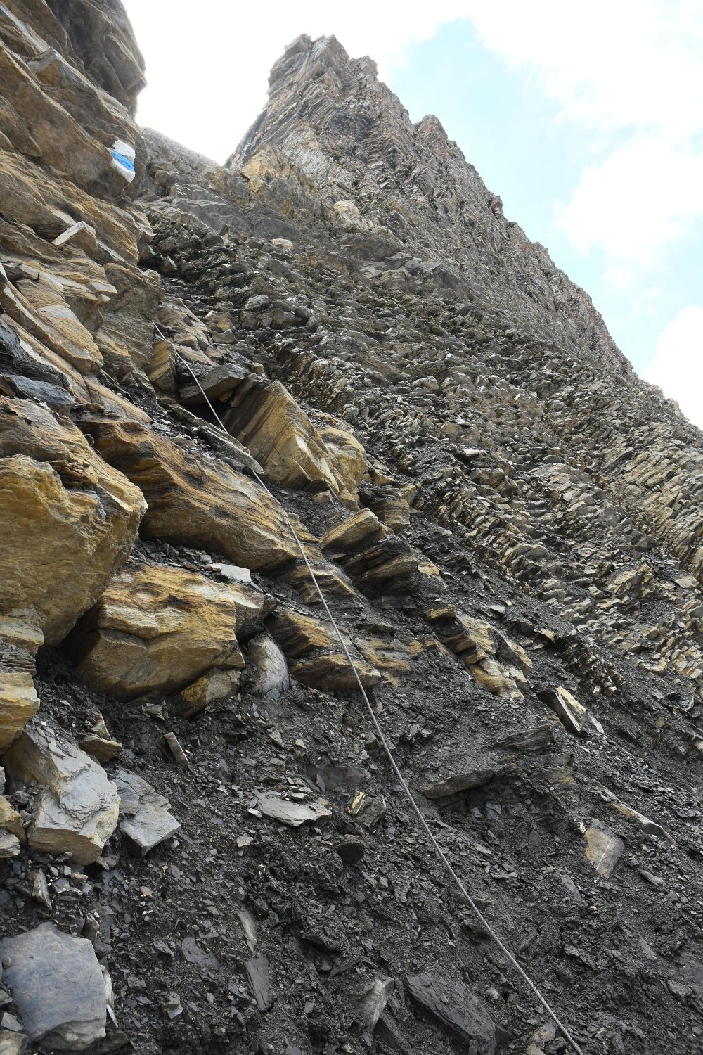 Super, das Schneefeld unter der Grosse Chrinne ist so weit abgeschmolzen, dass es nicht mehr in den Aufstiegsbereich ragt. Jedoch ist der Schutt wohl permanent feucht. Mit etwas Zupacken am Seil geht es ganz gut, ist aber relativ steil.
