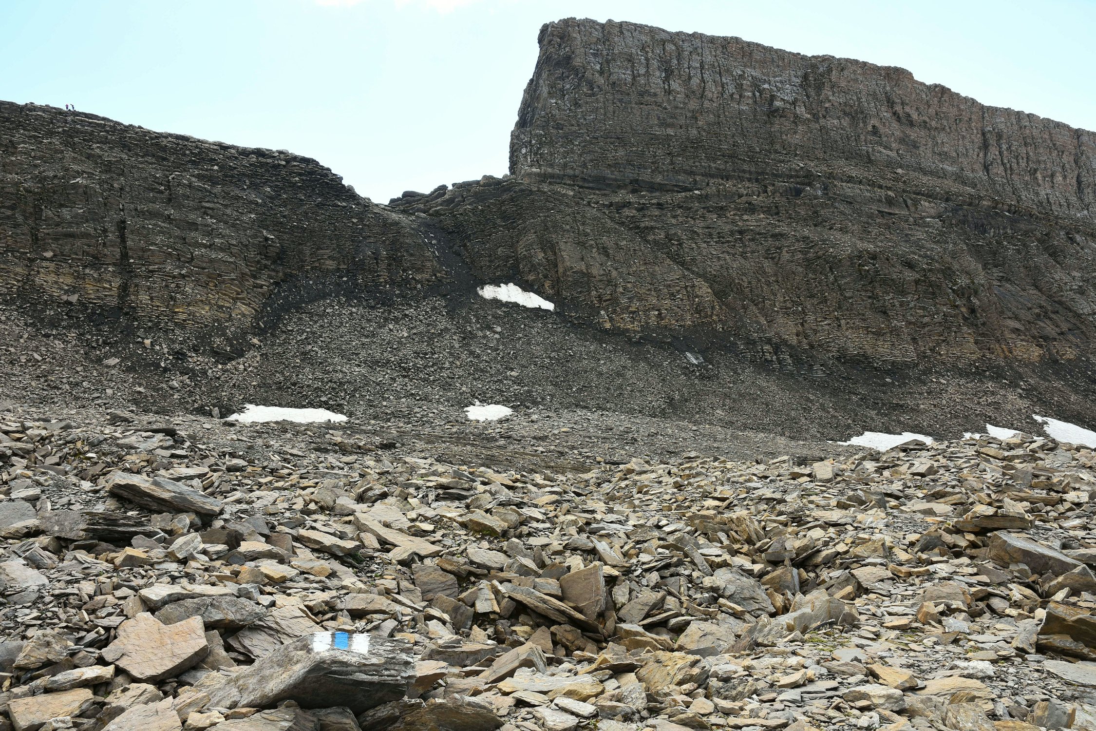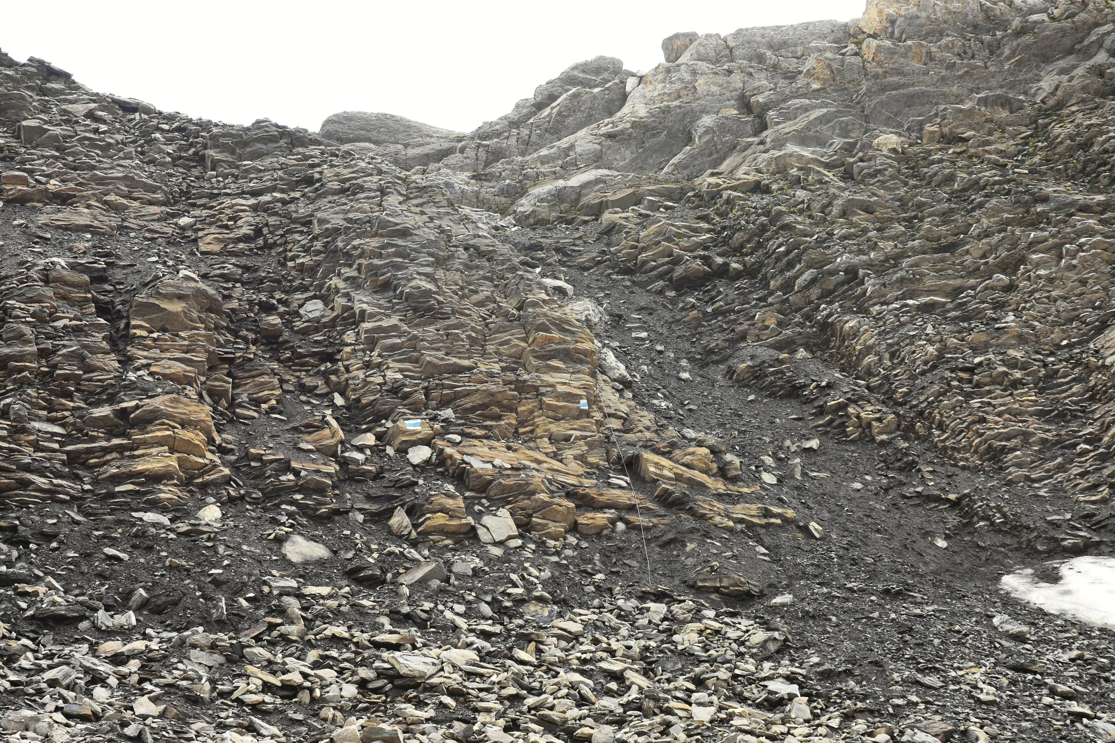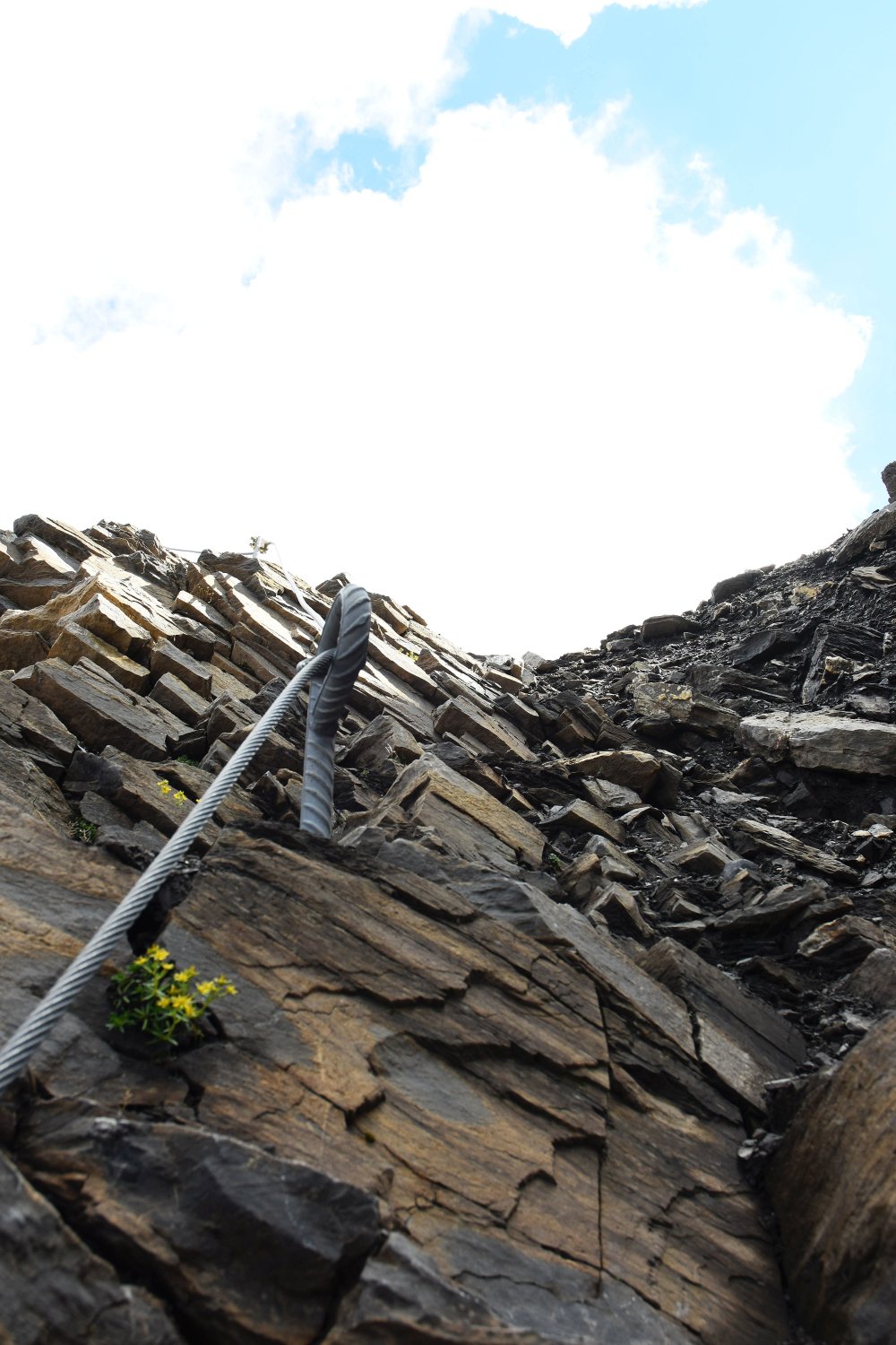 Super, das Schneefeld unter der Grosse Chrinne ist so weit abgeschmolzen, dass es nicht mehr in den Aufstiegsbereich ragt. Jedoch ist der Schutt wohl permanent feucht. Mit etwas Zupacken am Seil geht es ganz gut, ist aber relativ steil.