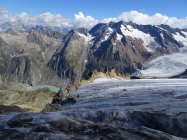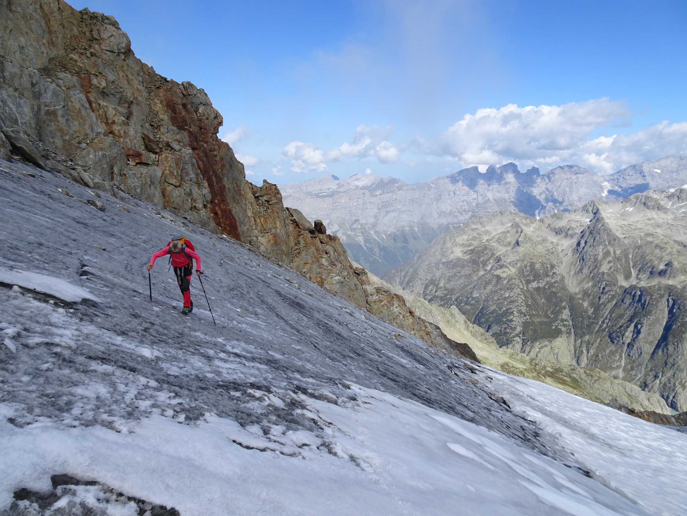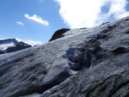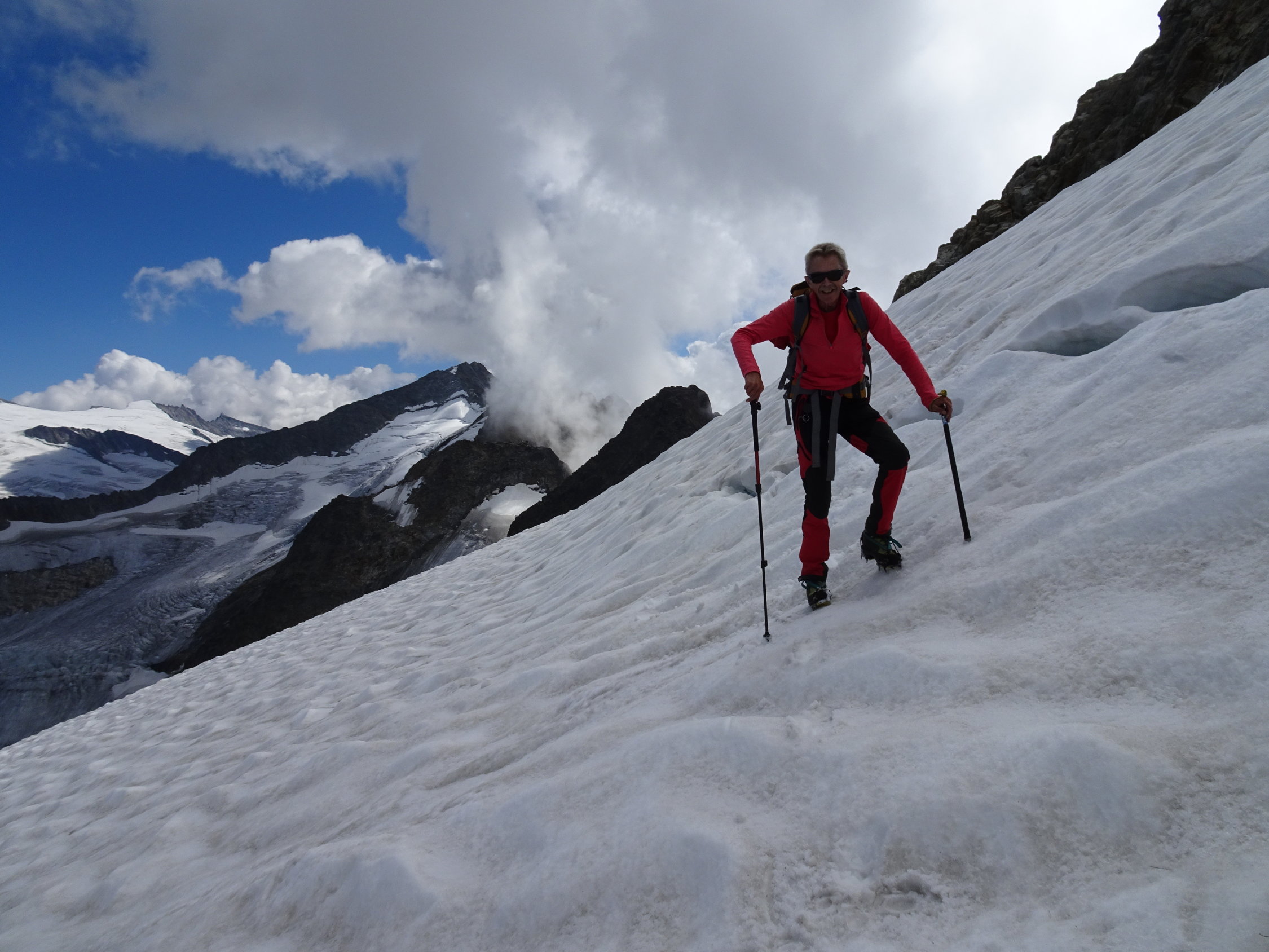 Beste Bedingungen. Der Gletscher ist im ersten Teil ausgeapert und steil, wir hatten Steigeisen und Pickel dabei.